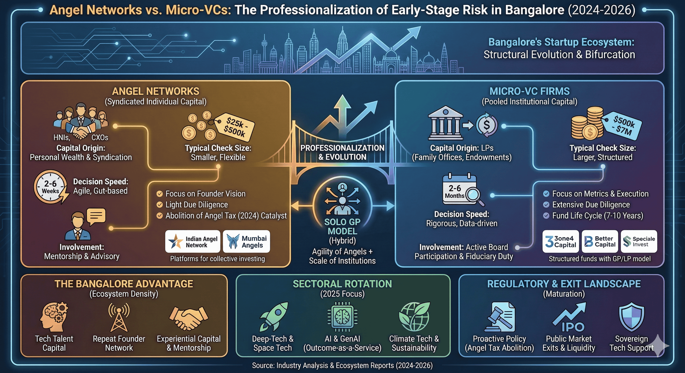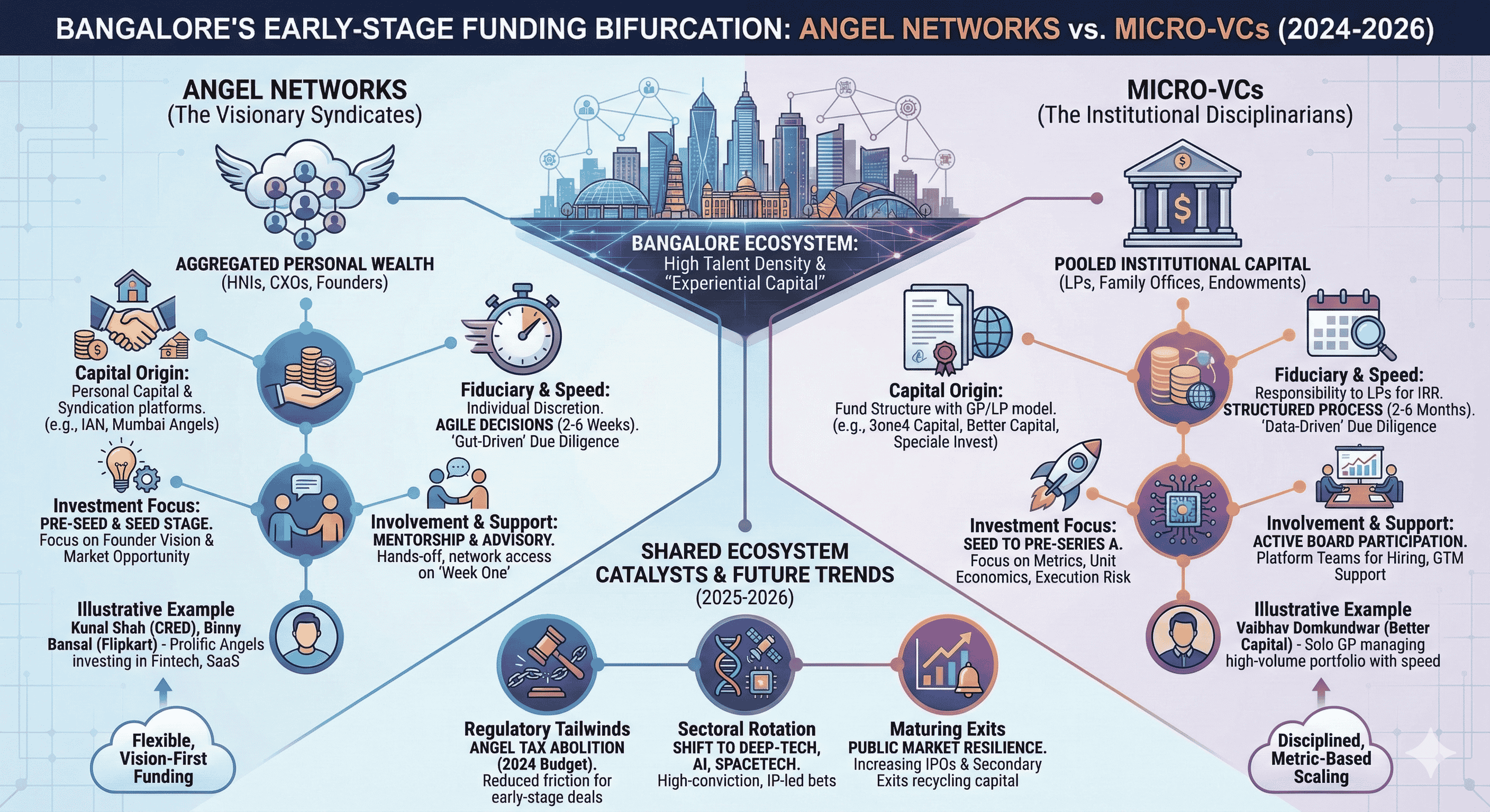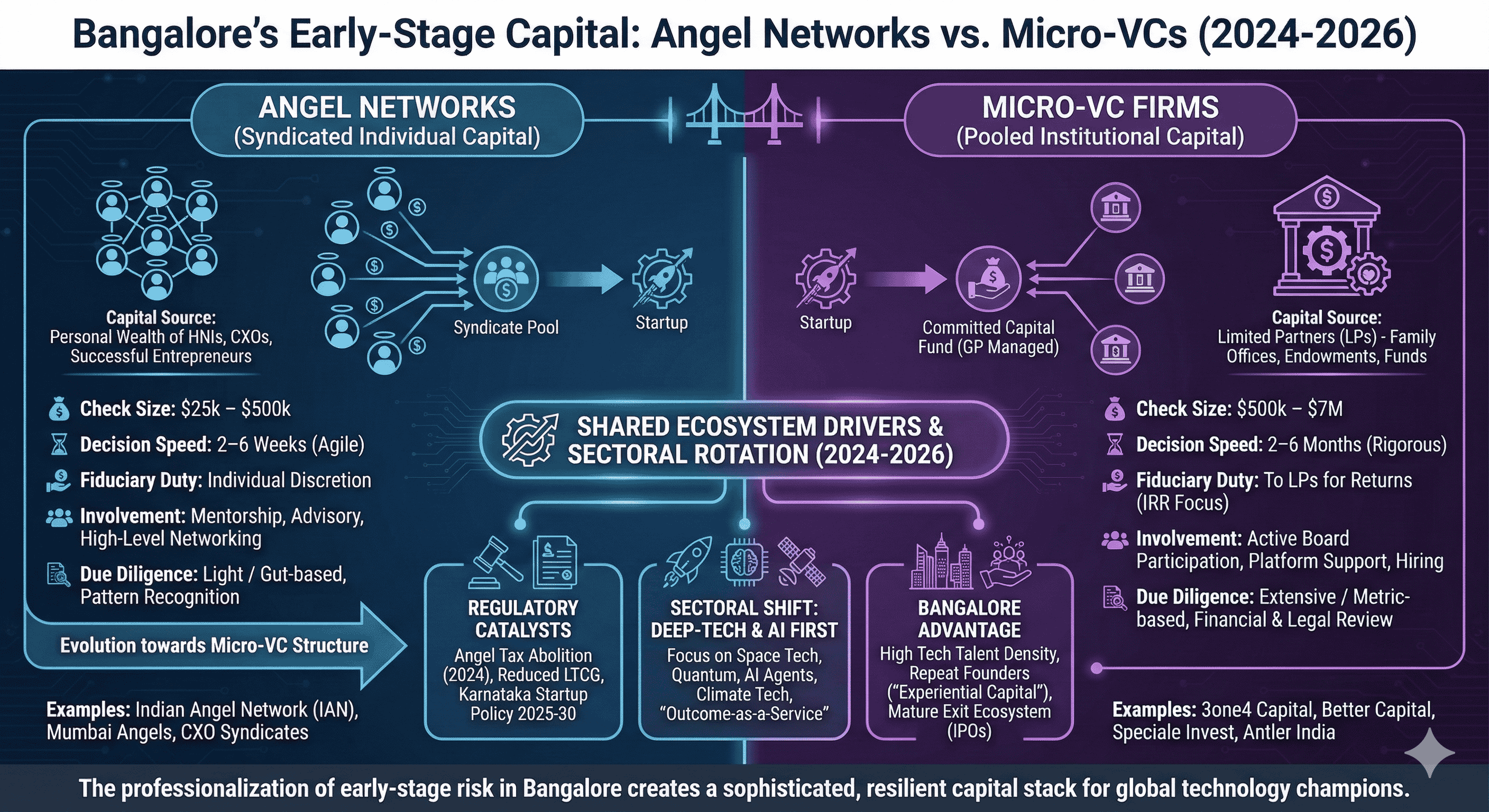 The venture capital ecosystem in Bangalore, traditionally the primary engine of India's technological advancement, has undergone a fundamental structural transformation between 2024 and 2026. This evolution is characterized by a distinct bifurcation of the early-stage funding landscape into two sophisticated institutional archetypes: the Angel Network and the Micro-Venture Capital (Micro-VC) firm. While both archetypes target the pre-seed and seed stages of the startup lifecycle, their operational mandates, fiduciary obligations, and risk-underwriting methodologies have diverged to create a more resilient, albeit complex, capital stack. Bangalore, often referred to as the Silicon Valley of India, now hosts a unique density of tech talent and "experiential capital," where repeat founders and senior corporate executives have professionalized the act of early-stage risk-taking. This report examines the mechanics of these two capital providers, their sectoral rotations—particularly toward deep-tech and artificial intelligence—and the macroeconomic and regulatory catalysts that have defined this period of institutionalization.