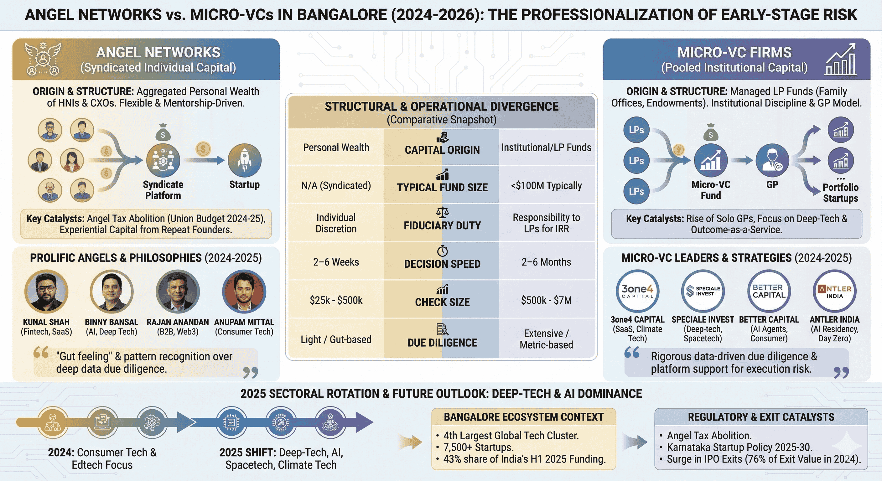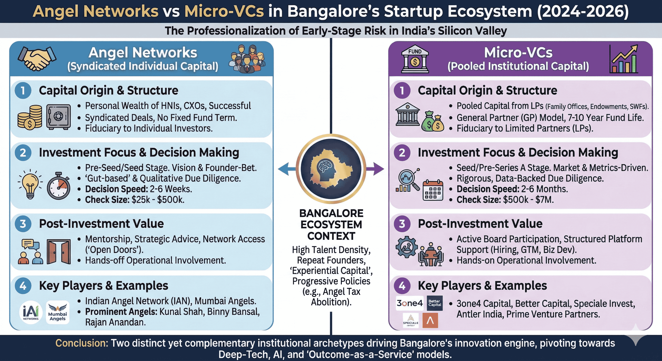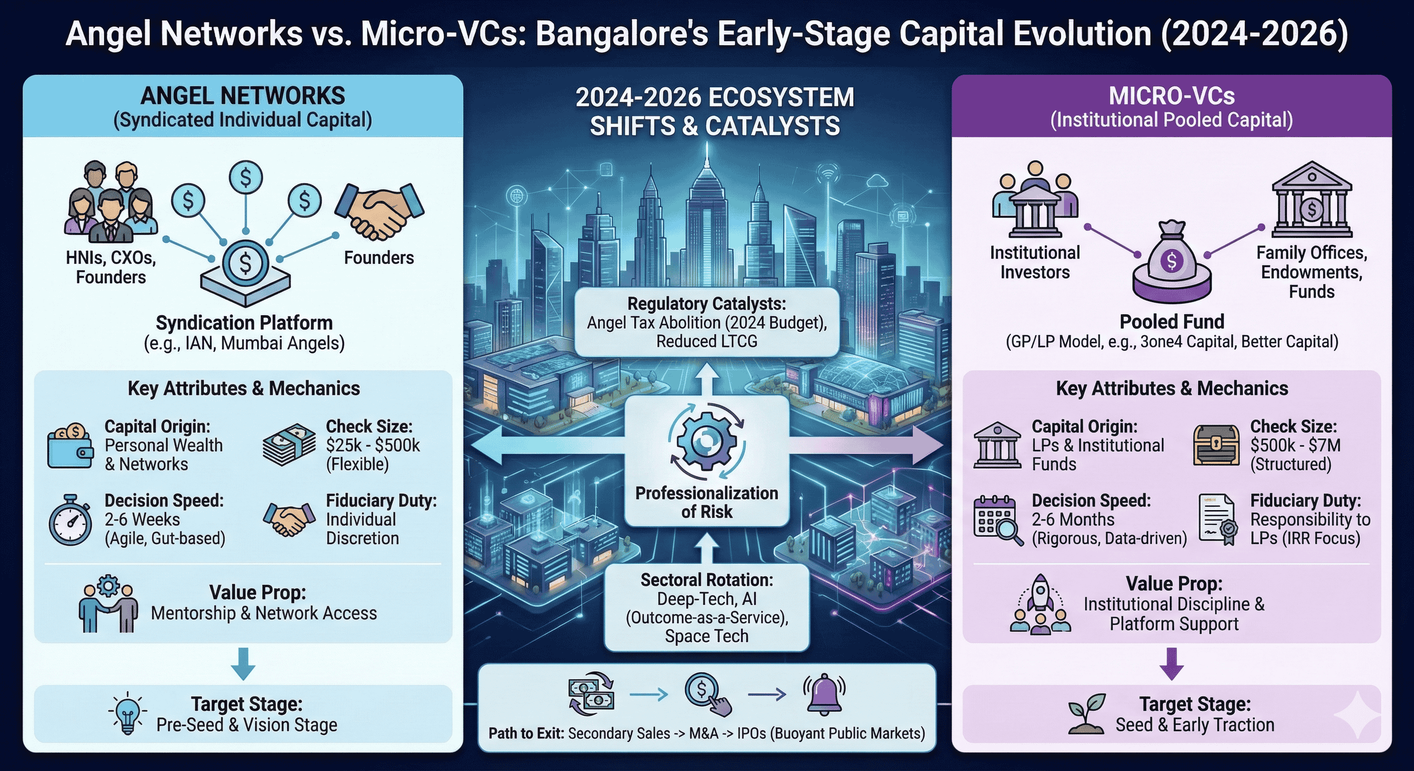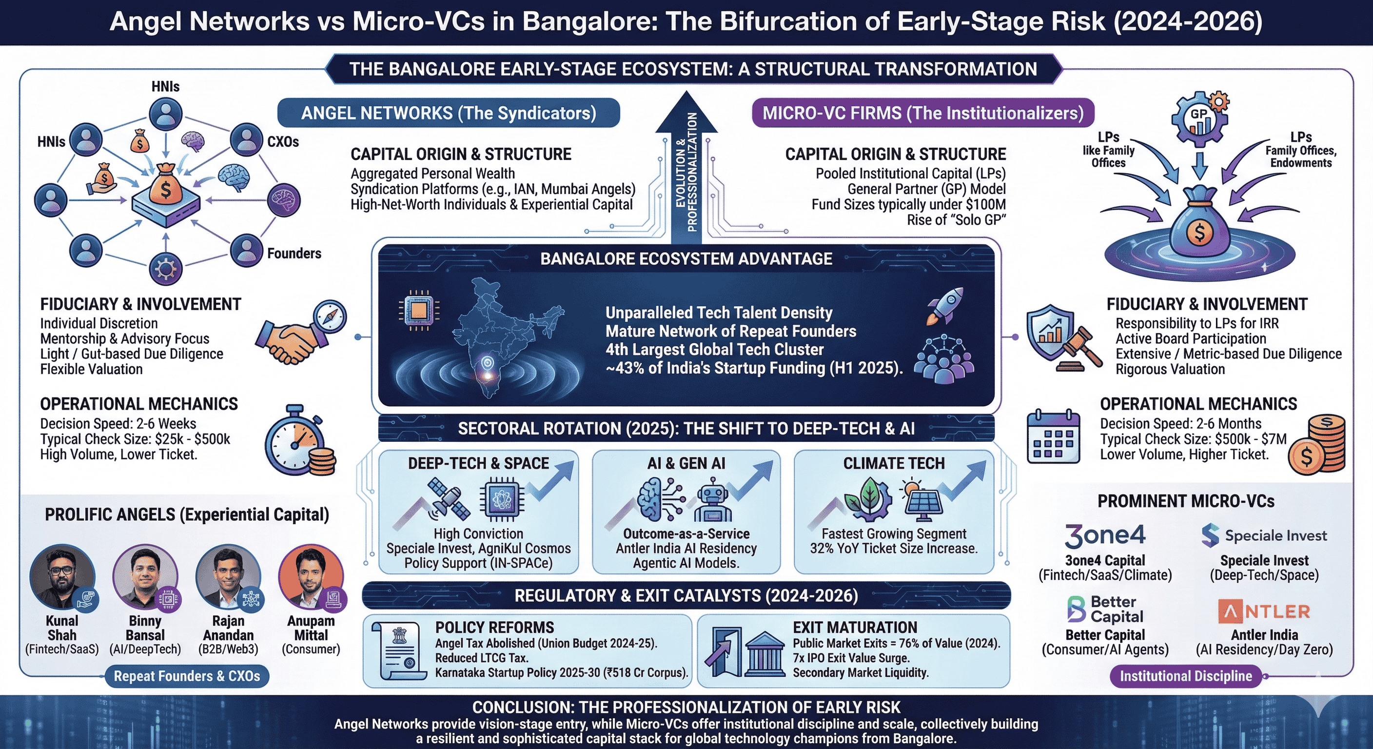 The venture capital ecosystem in Bangalore, traditionally the primary engine of India's technological advancement, has undergone a fundamental structural transformation between 2024 and 2026. This evolution is characterized by a distinct bifurcation of the early-stage funding landscape into two sophisticated institutional archetypes: the Angel Network and the Micro-Venture Capital (Micro-VC) firm. While both archetypes target the pre-seed and seed stages of the startup lifecycle, their operational mandates, fiduciary obligations, and risk-underwriting methodologies have diverged to create a more resilient, albeit complex, capital stack. Bangalore, often referred to as the Silicon Valley of India, now hosts a unique density of tech talent and "experiential capital," where repeat founders and senior corporate executives have professionalized the act of early-stage risk-taking. This report examines the mechanics of these two capital providers, their sectoral rotations—particularly toward deep-tech and artificial intelligence—and the macroeconomic and regulatory catalysts that have defined this period of institutionalization.