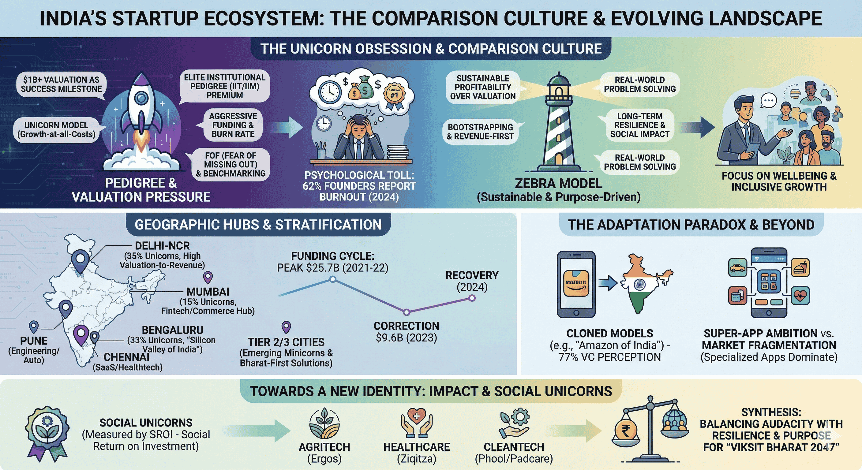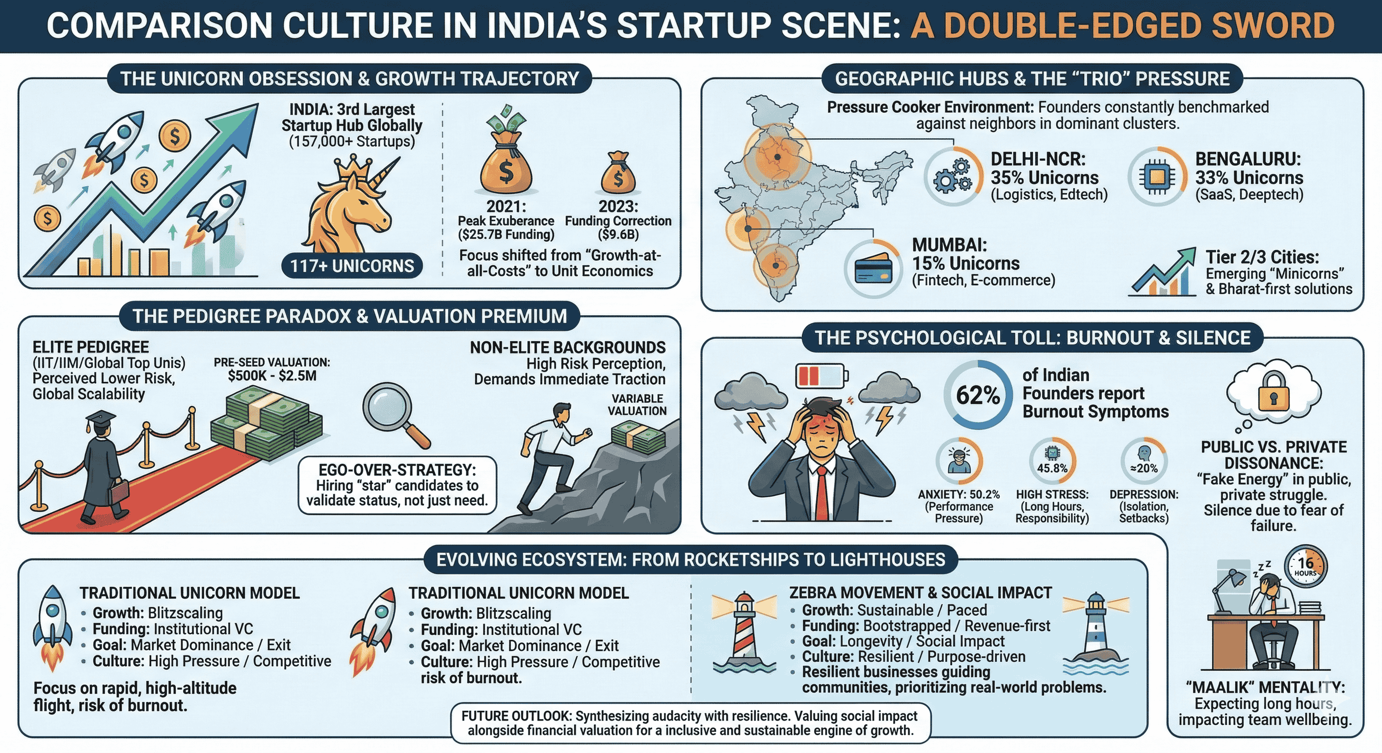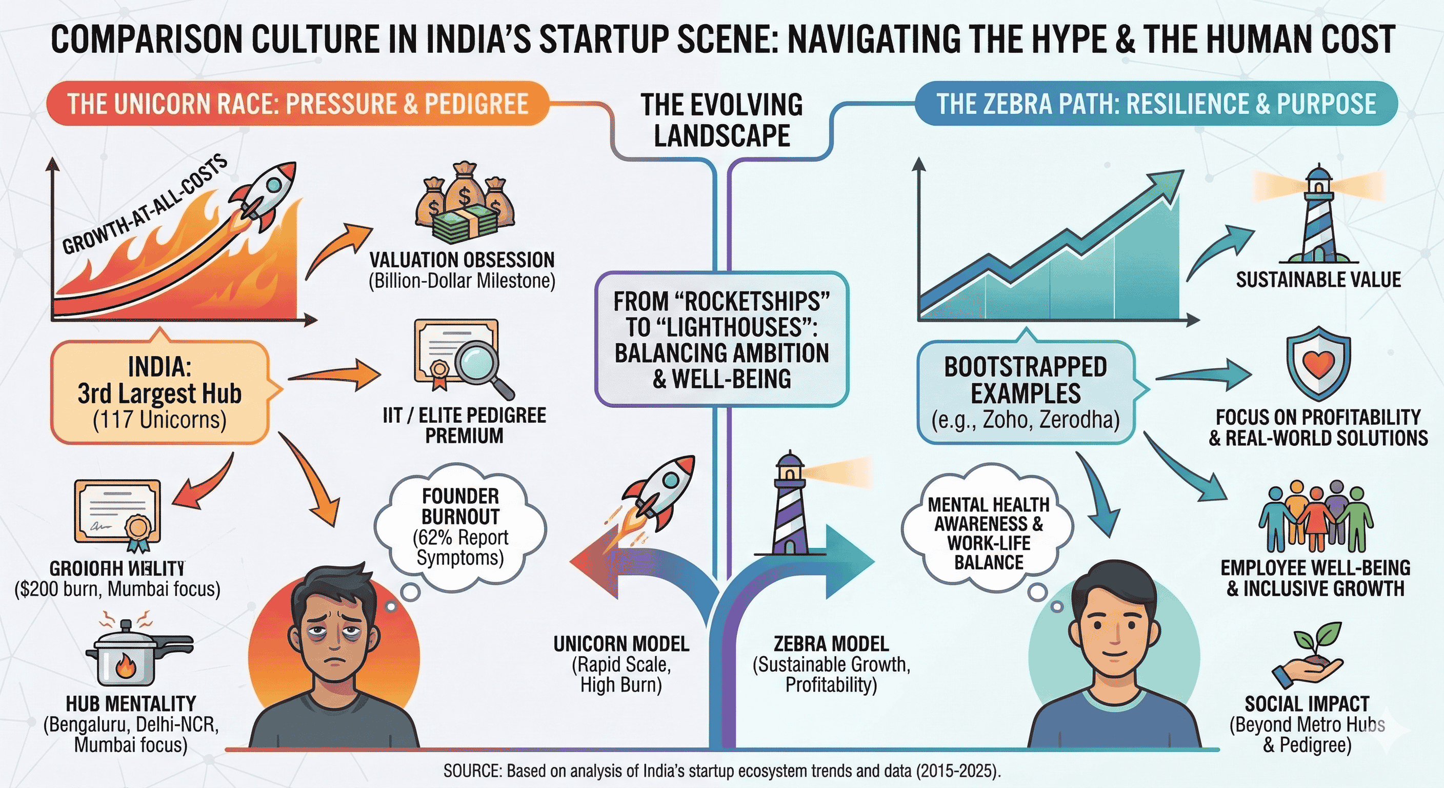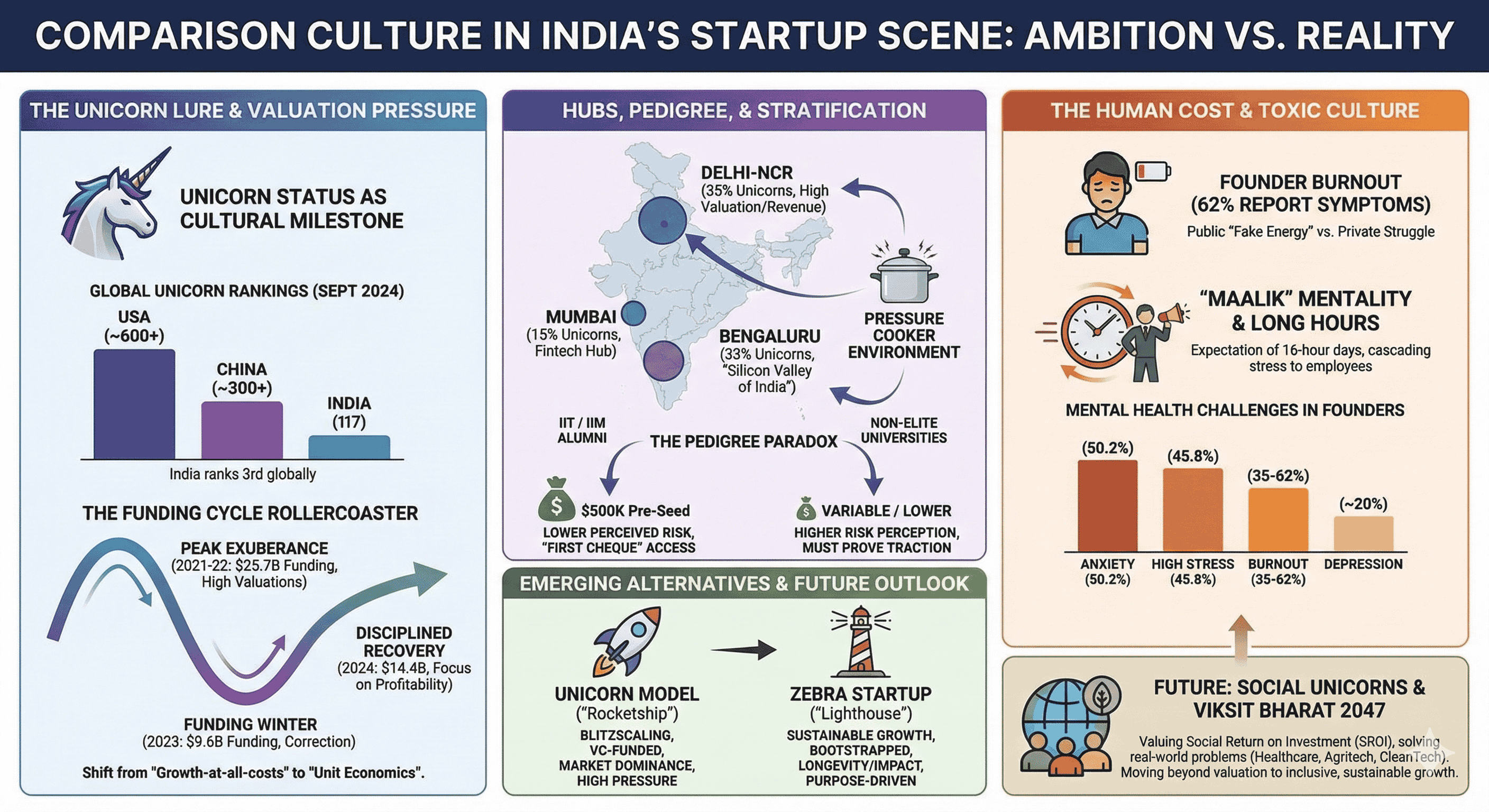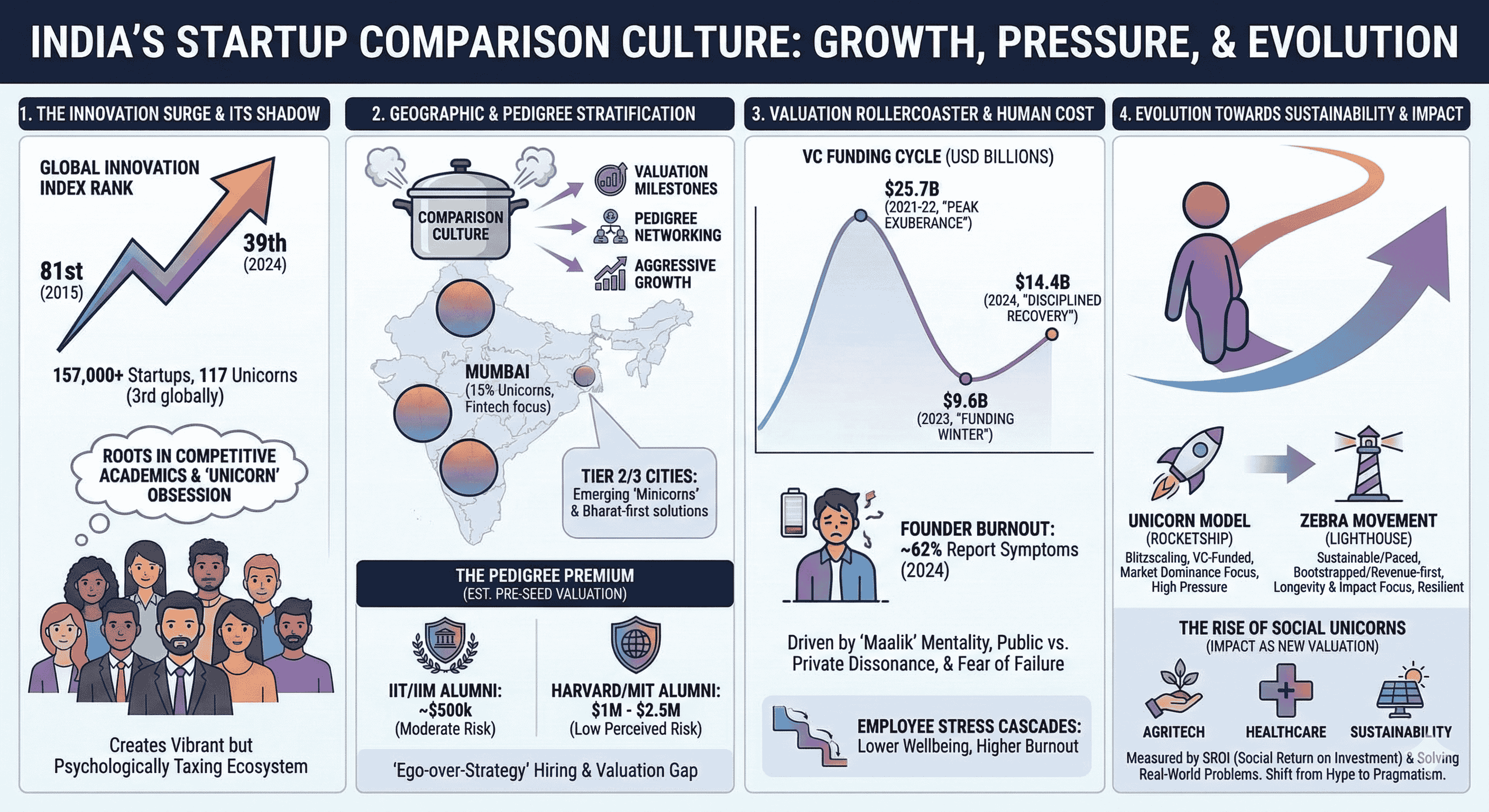 The Indian startup ecosystem has undergone a radical transformation over the past decade, evolving from a nascent collection of ventures into the third-largest startup hub globally. This trajectory is characterized by a dramatic leap in the Global Innovation Index, where India’s ranking moved from 81st in 2015 to 39th in 2024. While the sheer volume of activity—comprising over 157,000 startups and 117 unicorns—is a testament to India's burgeoning digital economy, it has simultaneously fostered a pervasive "comparison culture". This culture, rooted in historical competitive academic structures and fueled by an obsession with "unicorn" status, has become a defining characteristic of how Indian founders, investors, and employees interact with the market. The relentless focus on valuation milestones, pedigree-based networking, and aggressive growth-at-all-costs strategies has created an ecosystem that is as vibrant as it is psychologically taxing.
