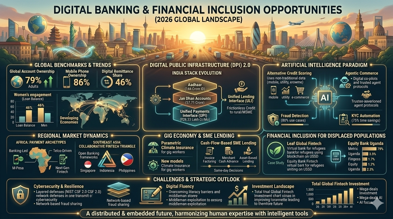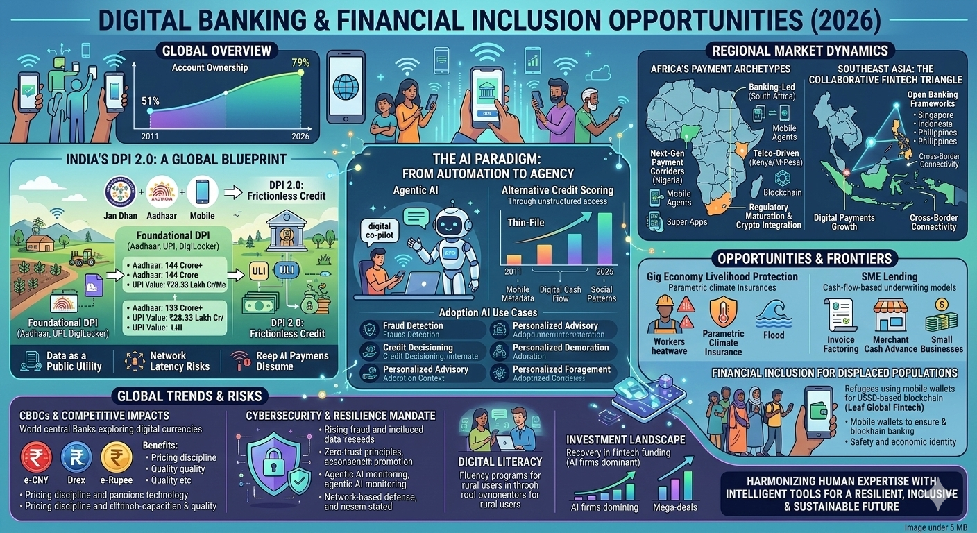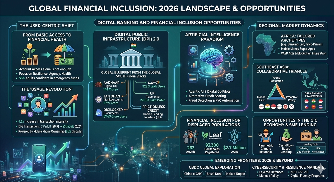 The landscape of global financial inclusion in 2026 is defined by a fundamental structural shift, moving away from the incremental objective of basic account access toward the sophisticated goal of fostering financial health, resilience, and meaningful economic agency. While the preceding decade focused on the "first mile" of bringing the unbanked into the formal system, the current era is characterized by a "usage revolution" powered by Digital Public Infrastructure (DPI), agentic artificial intelligence, and localized regulatory frameworks. This transition occurs amid a complex global environment where rising inclusion rates—now reaching 79% of the global adult population—clash with tightening donor resources and a fragmented geopolitical landscape. As traditional boundaries between telecommunications, banking, and technology continue to dissolve, the opportunities within digital banking have transitioned from providing simple transactional tools to delivering integrated, context-aware financial ecosystems.