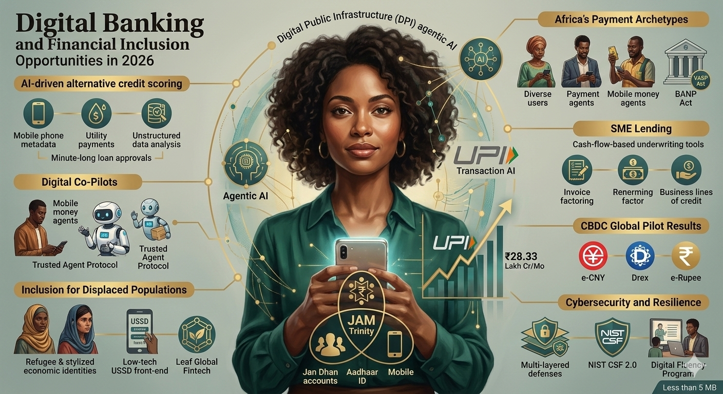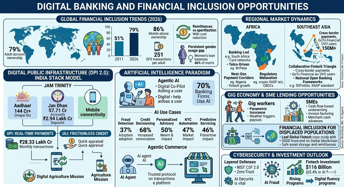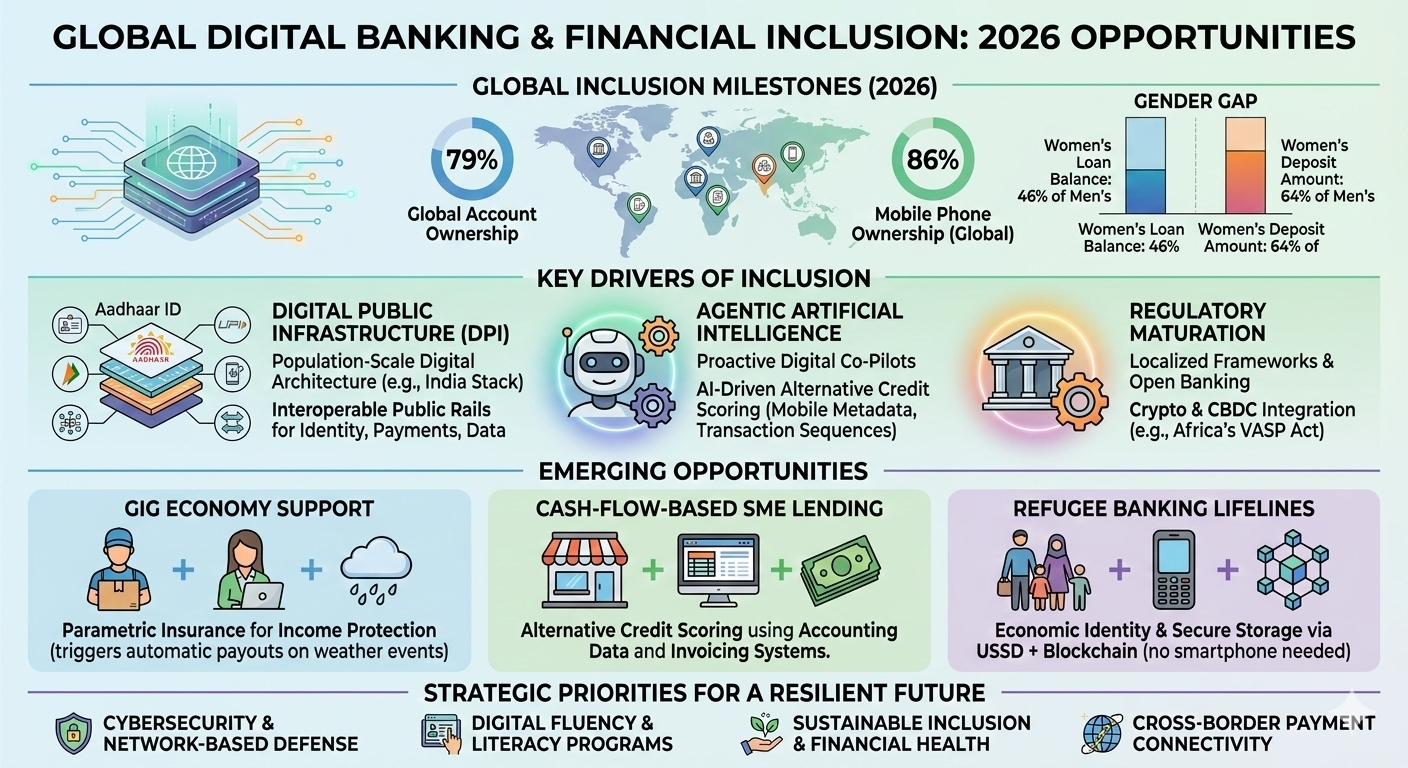 The landscape of global financial inclusion in 2026 is defined by a fundamental structural shift, moving away from the incremental objective of basic account access toward the sophisticated goal of fostering financial health, resilience, and meaningful economic agency. While the preceding decade focused on the "first mile" of bringing the unbanked into the formal system, the current era is characterized by a "usage revolution" powered by Digital Public Infrastructure (DPI), agentic artificial intelligence, and localized regulatory frameworks. This transition occurs amid a complex global environment where rising inclusion rates—now reaching 79% of the global adult population—clash with tightening donor resources and a fragmented geopolitical landscape. As traditional boundaries between telecommunications, banking, and technology continue to dissolve, the opportunities within digital banking have transitioned from providing simple transactional tools to delivering integrated, context-aware financial ecosystems.