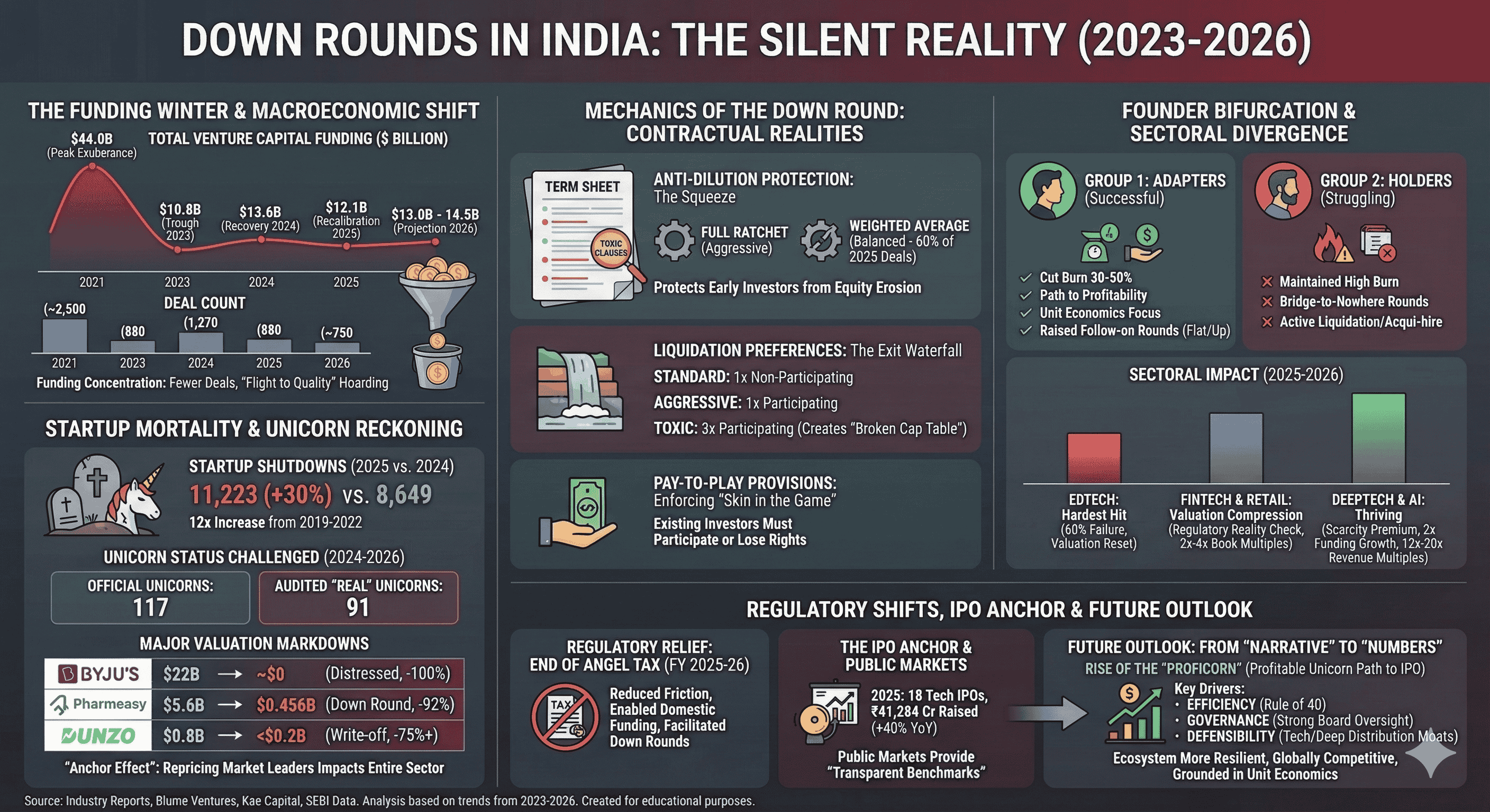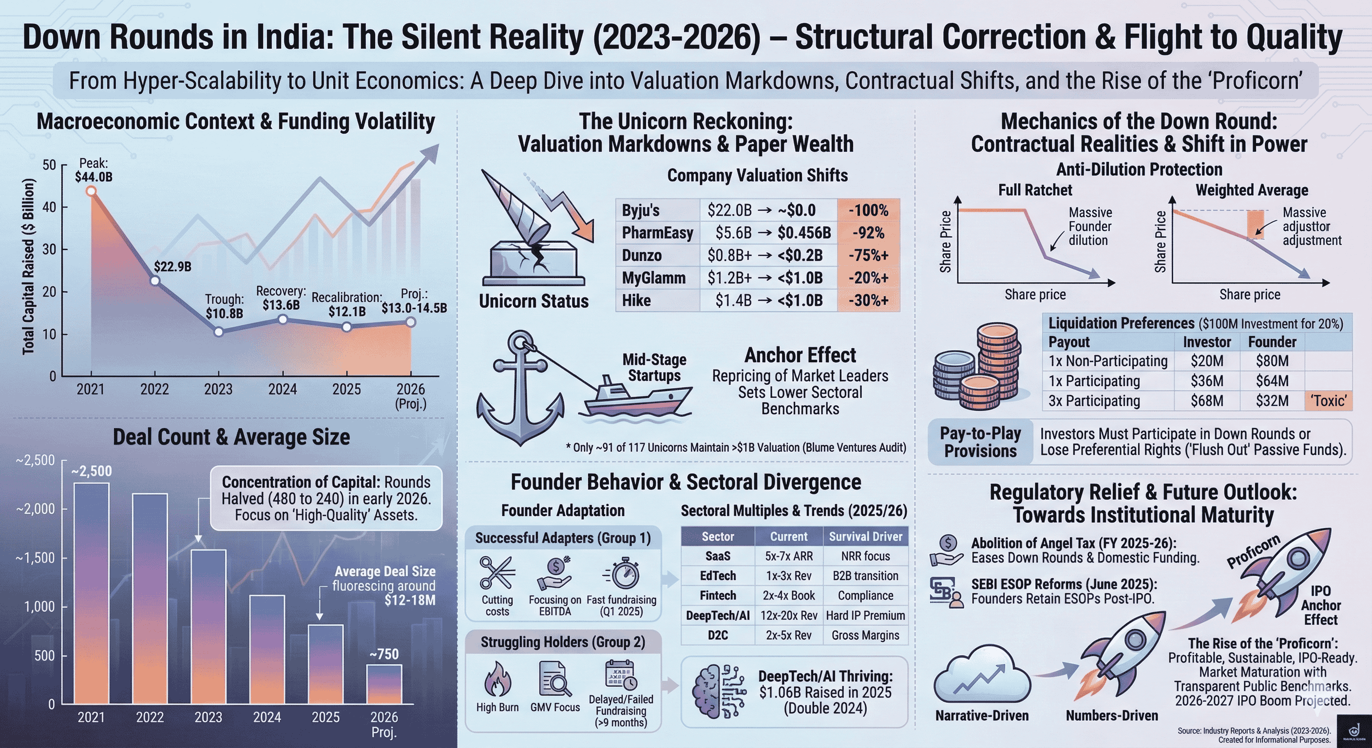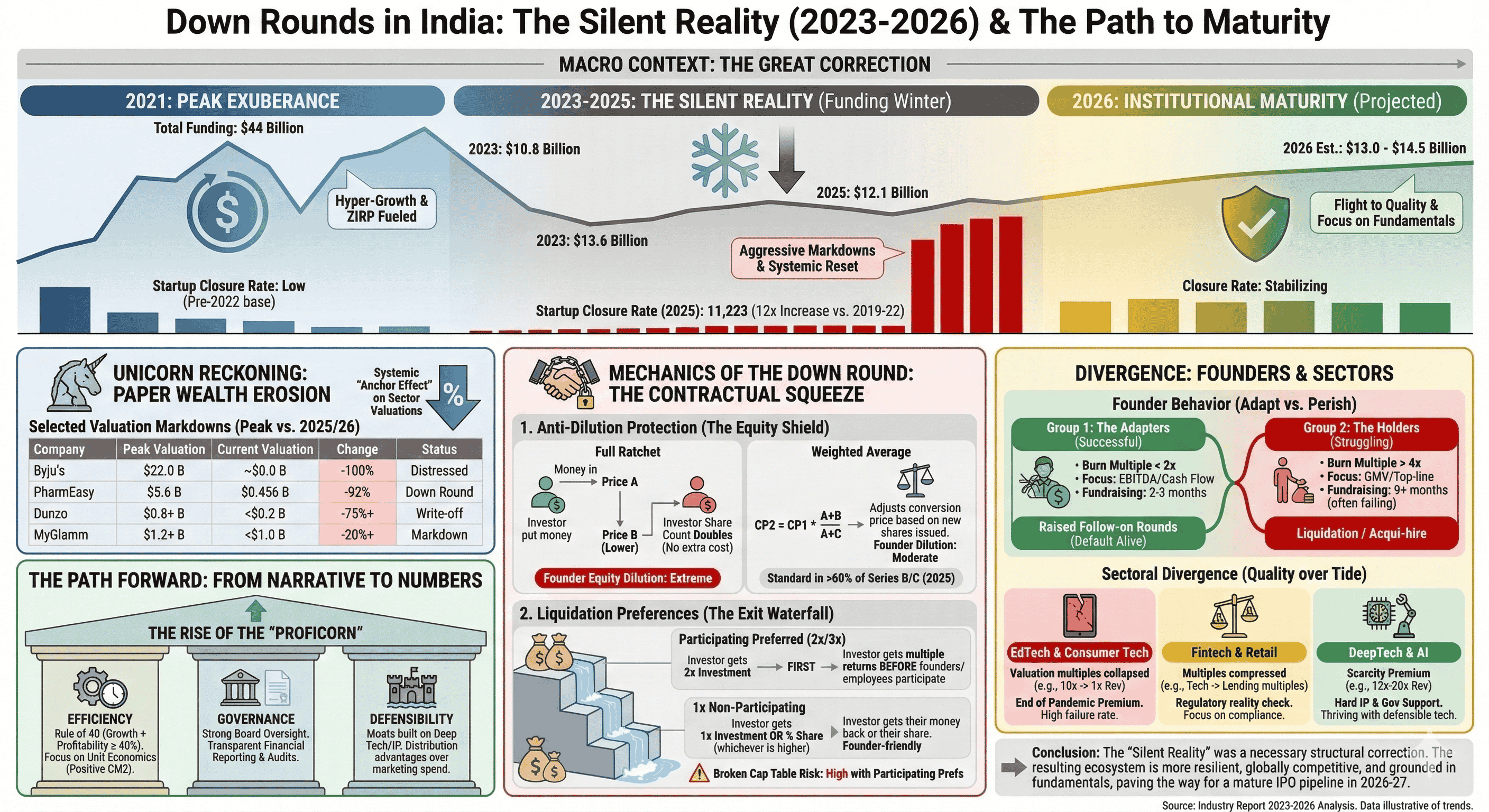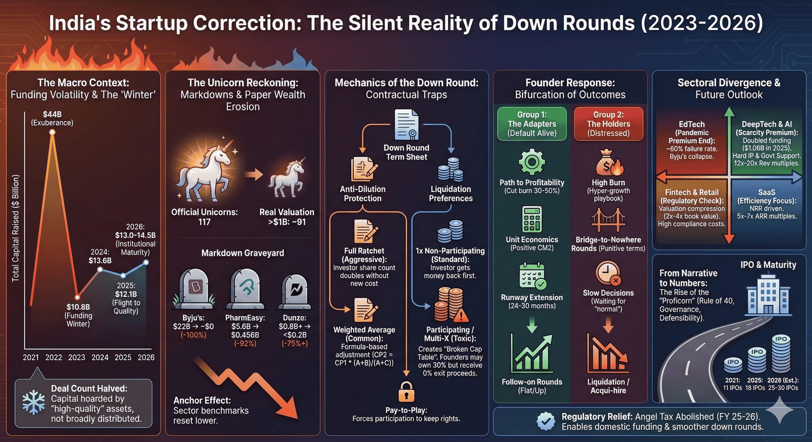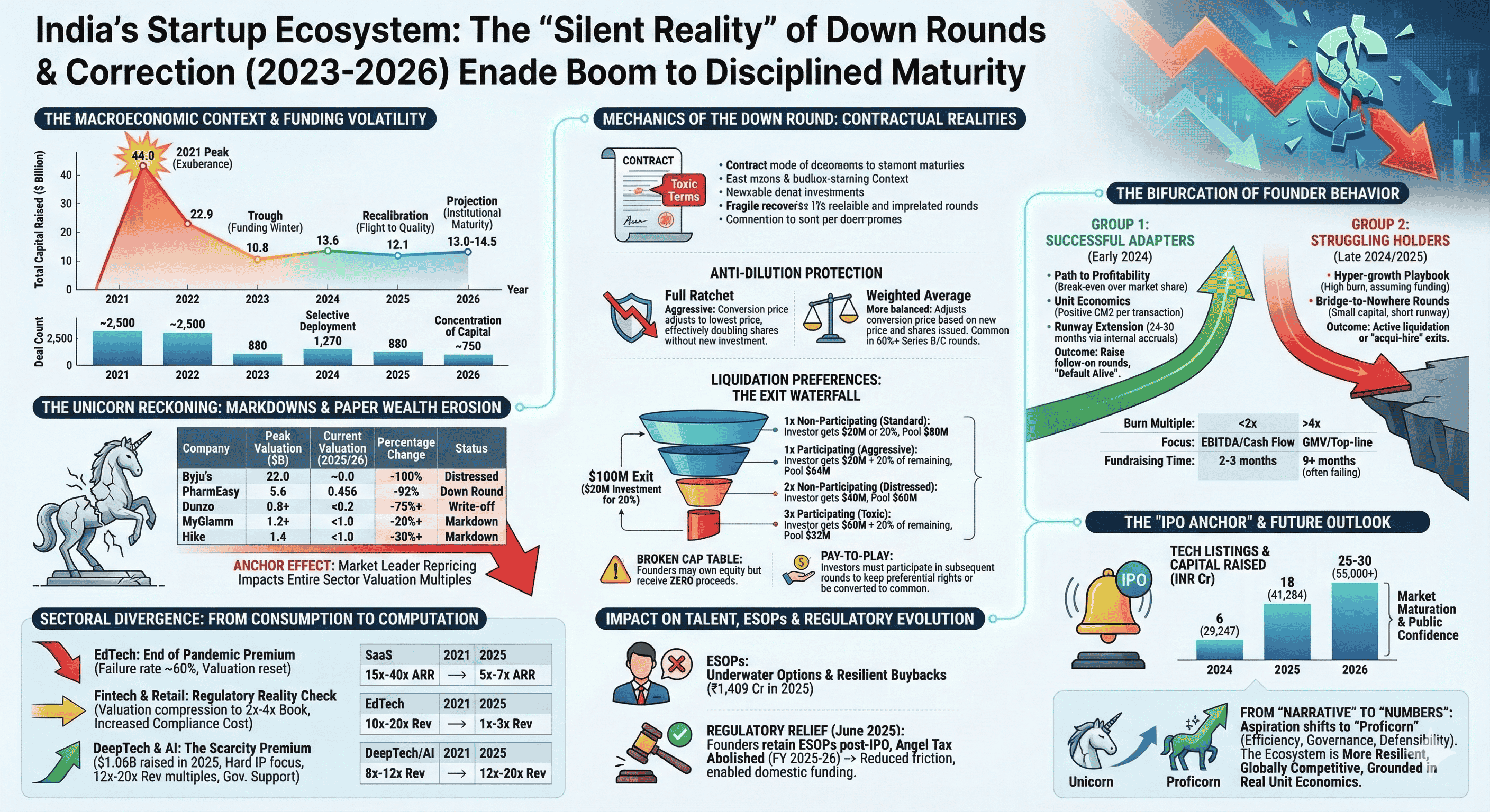 The "Silent Reality" of down rounds and markdowns in India between 2023 and 2026 was a necessary phase of consequence. The correction has weeded out speculative ventures and forced a generation of founders to master the fundamentals of business. While the destruction of paper wealth was painful for many, the resulting ecosystem is more resilient, globally competitive, and grounded in the reality of unit economics. As India moves toward its projected 2026-2027 IPO boom, it does so not as a speculative frontier, but as a mature hub for substance-driven innovation.