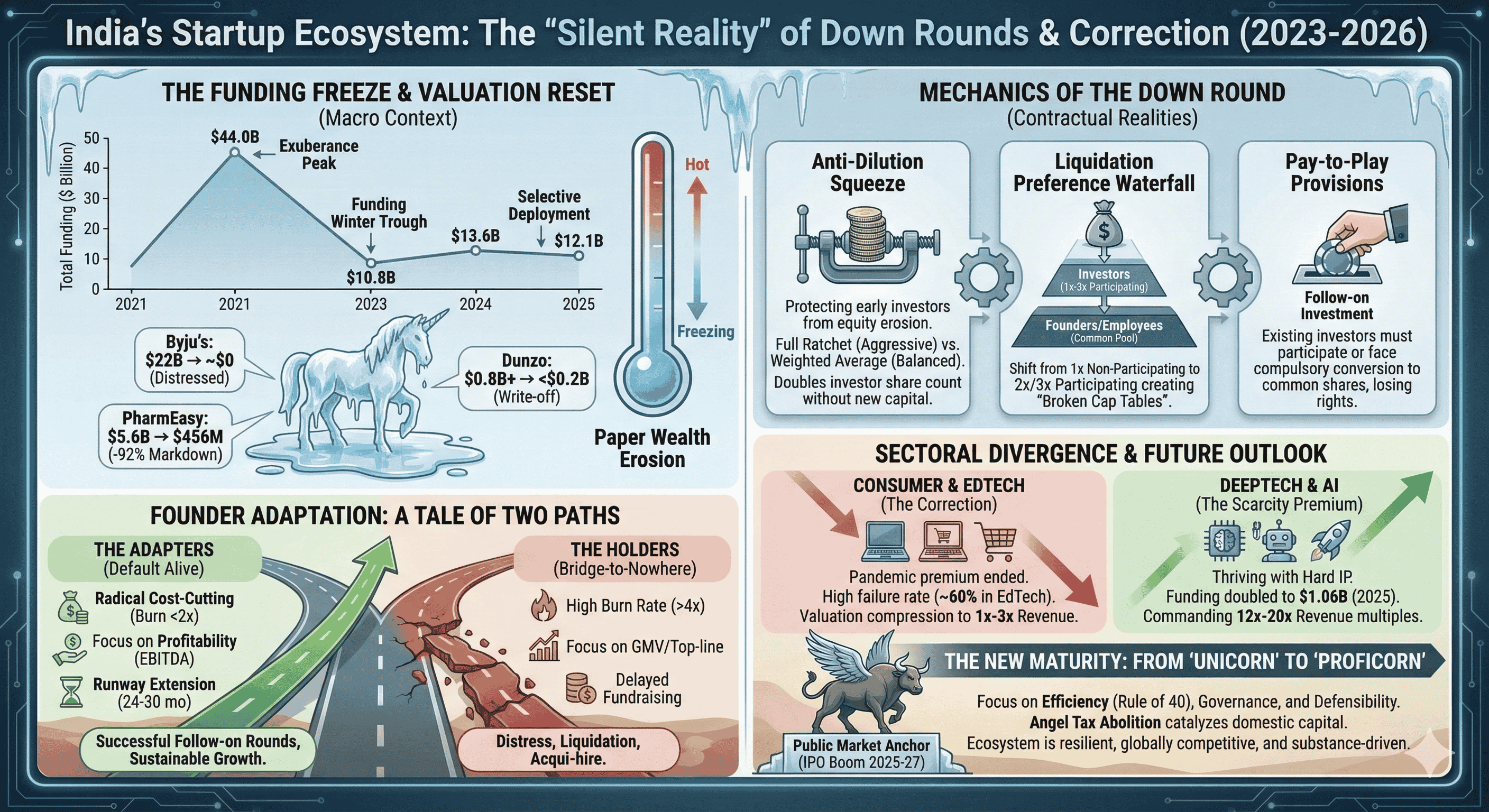 The Indian startup ecosystem, once the global poster child for hyper-scalability and venture-backed exuberance, has entered a period of profound structural correction. This transformation, often summarized through the lens of a "funding winter," is more accurately characterized as a "Silent Reality" defined by widespread down rounds, aggressive valuation markdowns, and a systemic shift in the power dynamics between founders and investors. Between 2023 and 2026, the narrative of India as the world's third-largest startup hub began to diverge: while the headline figures for total capital raised showed signs of stabilization, the underlying mechanics of these deals revealed a landscape of distressed bridge rounds and a rigorous "flight to quality".