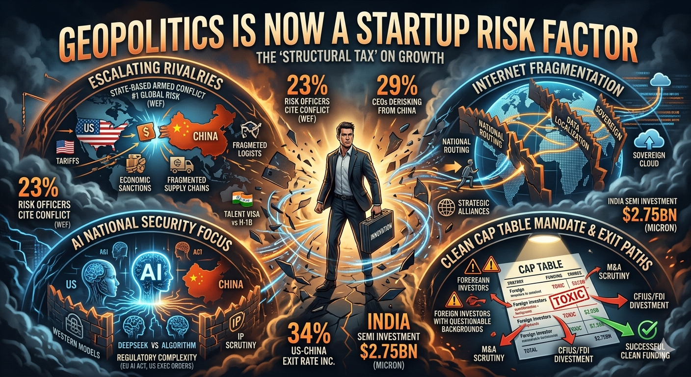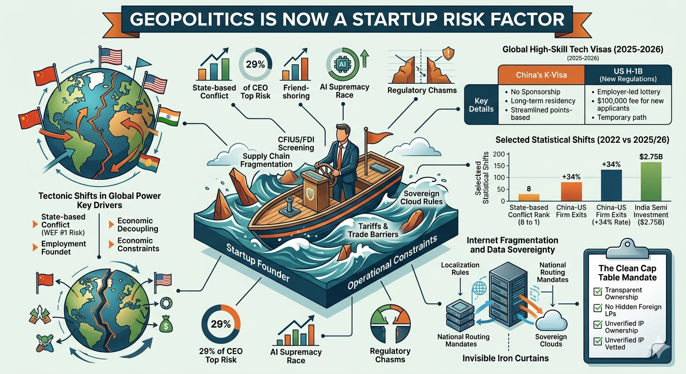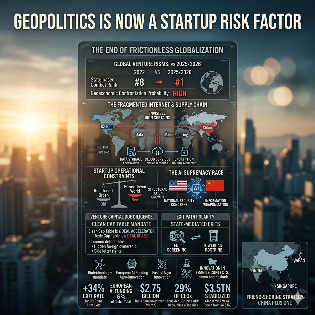 The convergence of global conflict, technological fragmentation, and state-mediated competition has made geopolitics the defining risk factor for the next generation of startups. The era of the "neutral" tech company is over; every startup is now a political entity by virtue of its supply chain, its data, and its investors. The successful startup of 2027 will not be the one that ignores geopolitics, but the one that builds resilience into its foundation through modular infrastructure, diversified sourcing, and a cap table that can survive the most rigorous national security scrutiny.