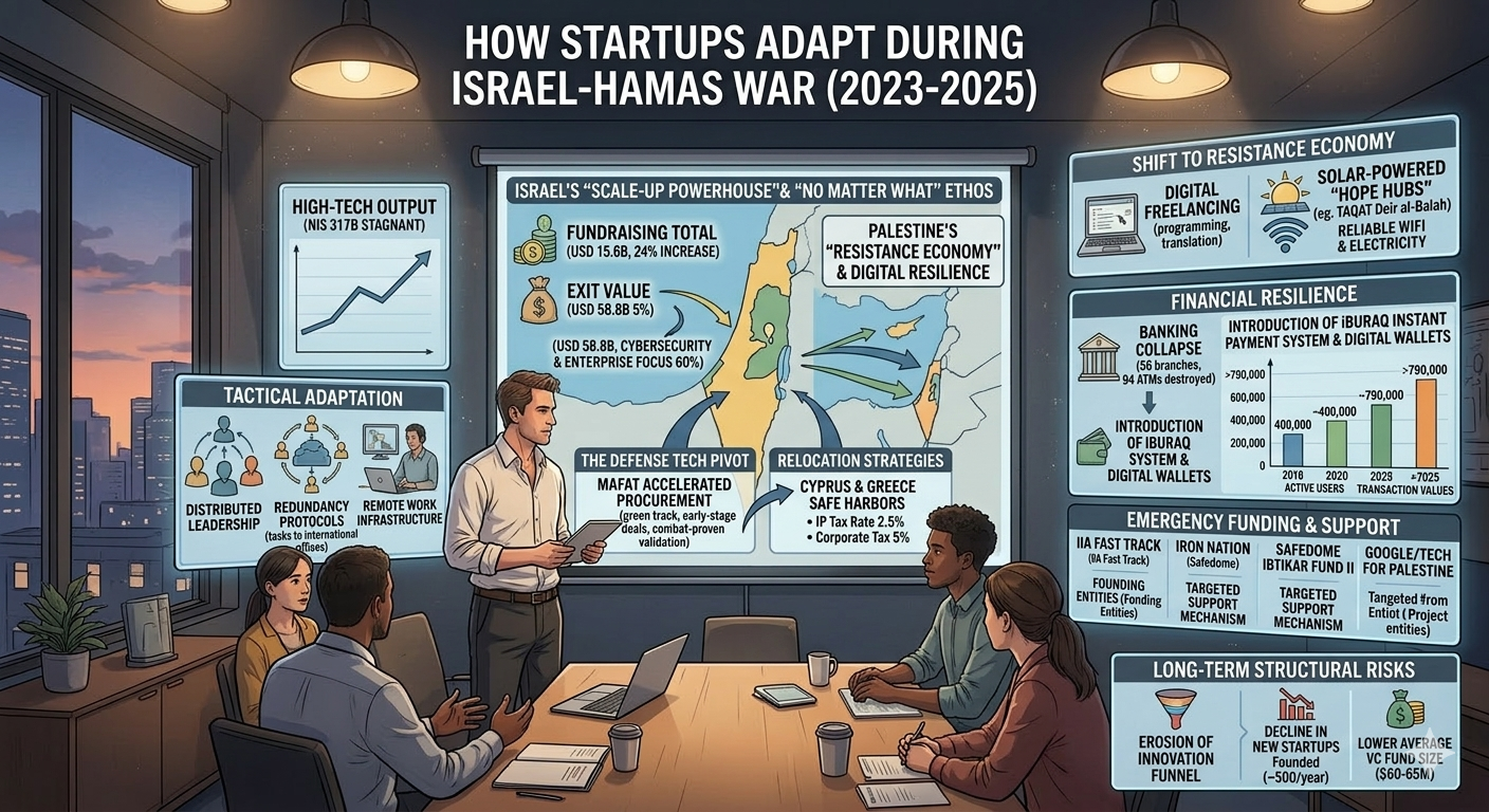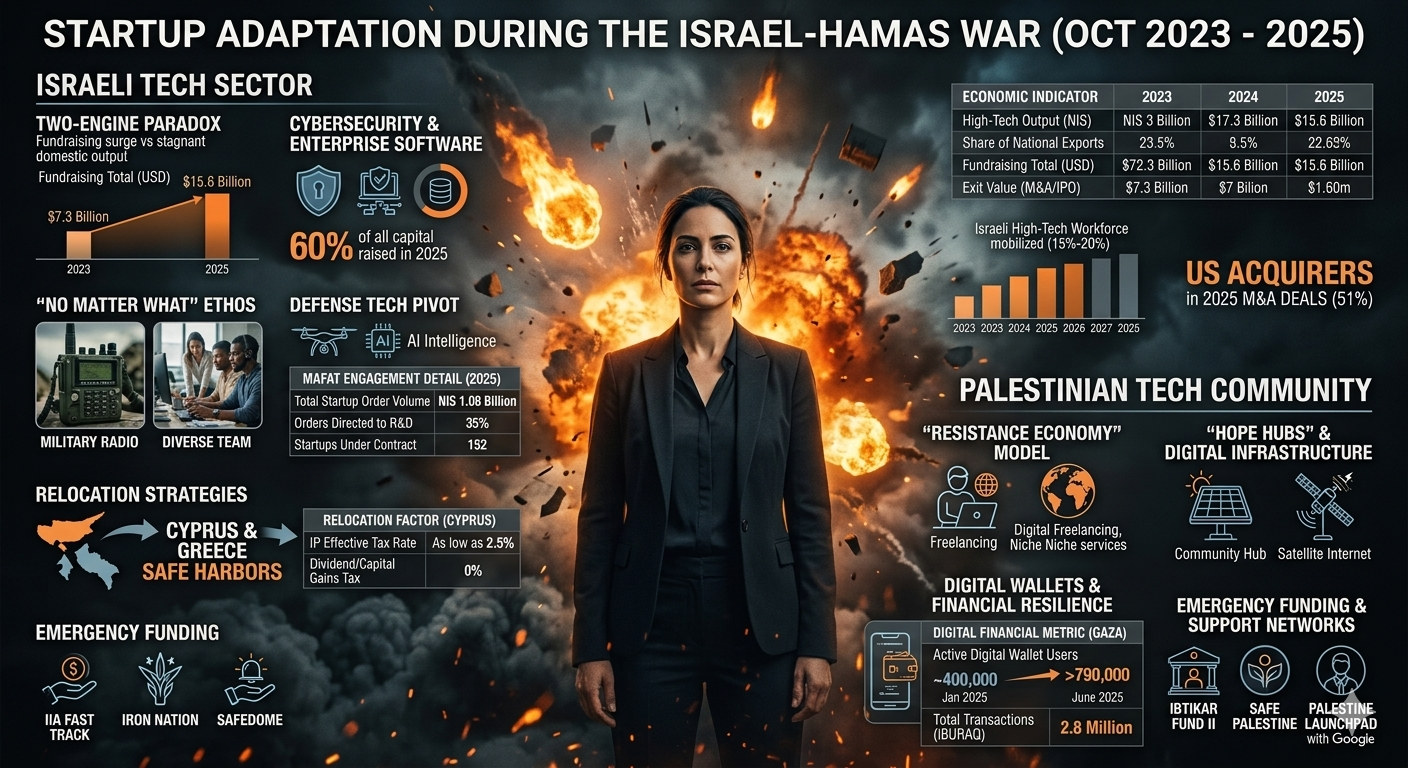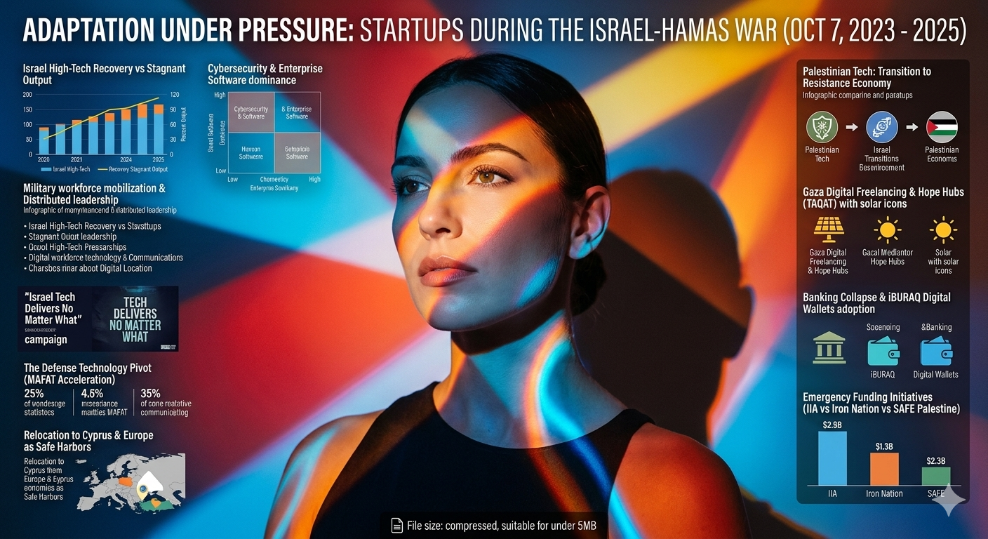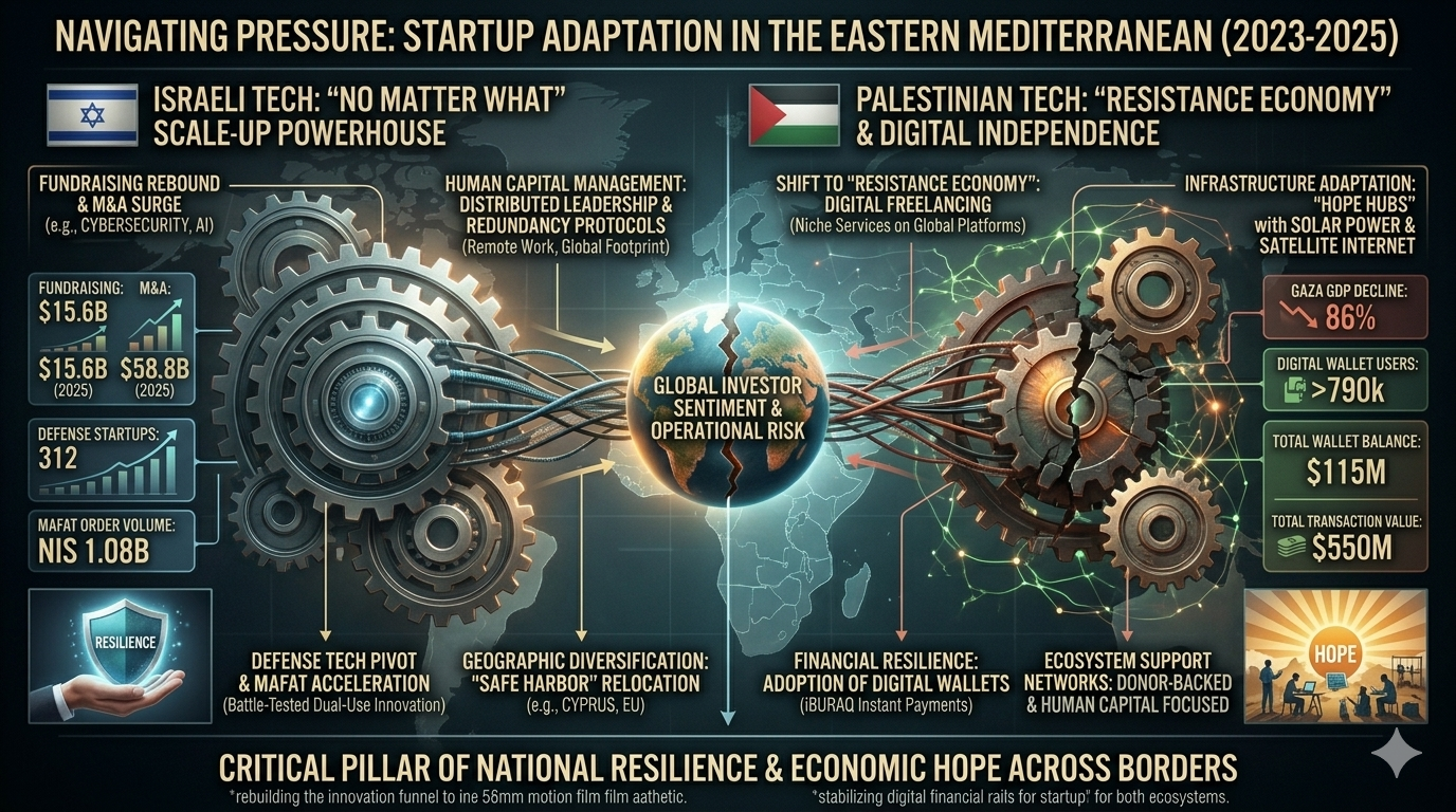 The global high-technology sector has long regarded the Eastern Mediterranean as a primary laboratory for innovation under pressure. However, the period beginning October 7, 2023, and extending through 2025 represents an unprecedented stress test for the startup ecosystems of both Israel and the Palestinian territories. This report examines the multi-faceted adaptation strategies employed by entrepreneurs, venture capitalists, and government agencies as they navigate a landscape defined by massive military mobilization, infrastructure destruction, and shifting global investor sentiment. The analysis indicates that while the Israeli tech sector has leveraged its "No Matter What" ethos to maintain a position as a global scale-up powerhouse, the Palestinian tech community has transitioned toward a decentralized "Resistance Economy" characterized by digital freelancing and solar-powered resilience.