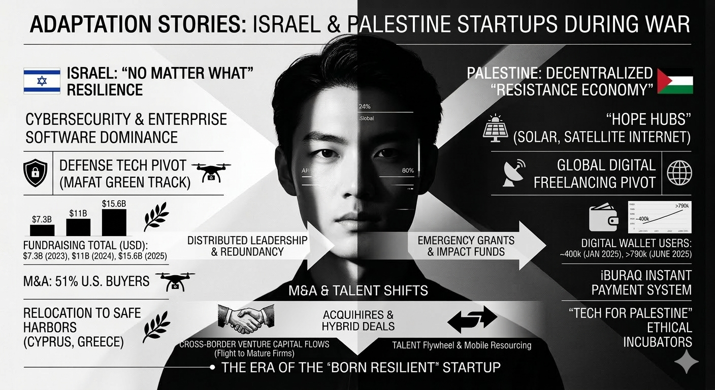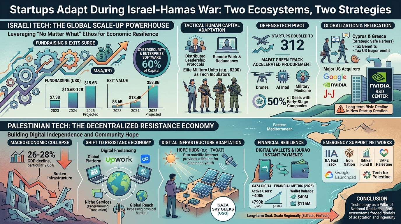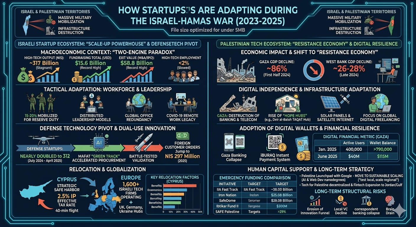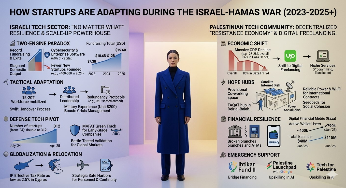 The global high-technology sector has long regarded the Eastern Mediterranean as a primary laboratory for innovation under pressure. However, the period beginning October 7, 2023, and extending through 2025 represents an unprecedented stress test for the startup ecosystems of both Israel and the Palestinian territories. This report examines the multi-faceted adaptation strategies employed by entrepreneurs, venture capitalists, and government agencies as they navigate a landscape defined by massive military mobilization, infrastructure destruction, and shifting global investor sentiment. The analysis indicates that while the Israeli tech sector has leveraged its "No Matter What" ethos to maintain a position as a global scale-up powerhouse, the Palestinian tech community has transitioned toward a decentralized "Resistance Economy" characterized by digital freelancing and solar-powered resilience.