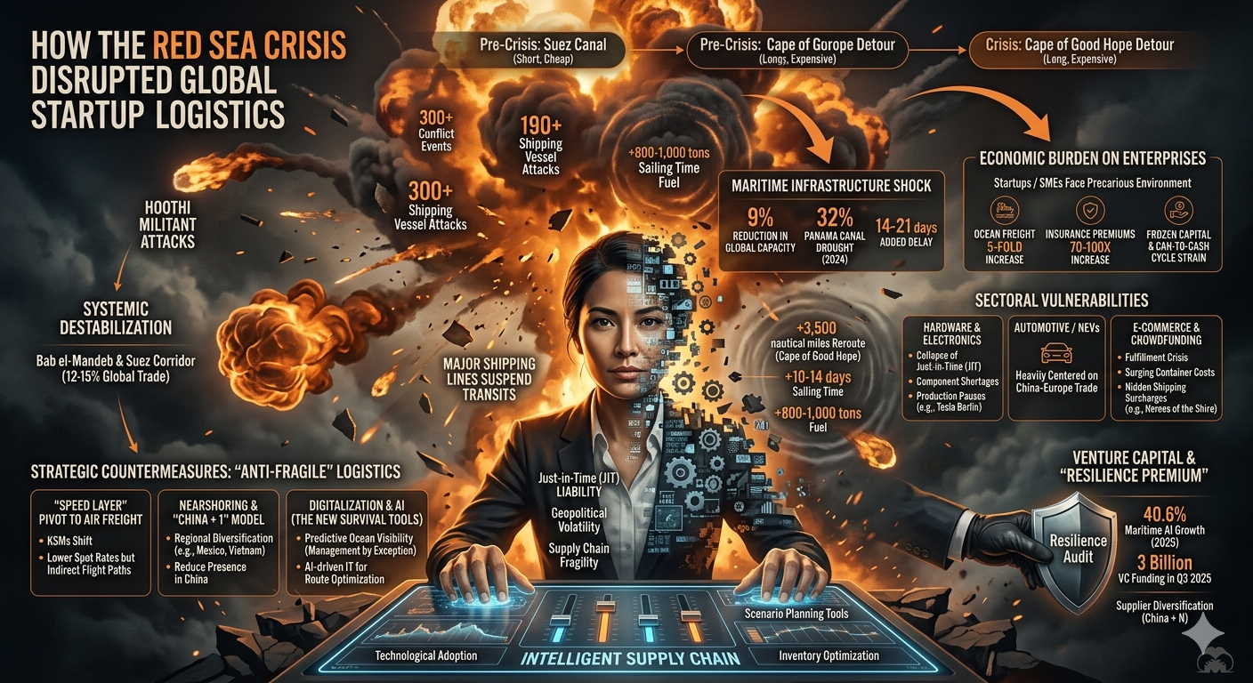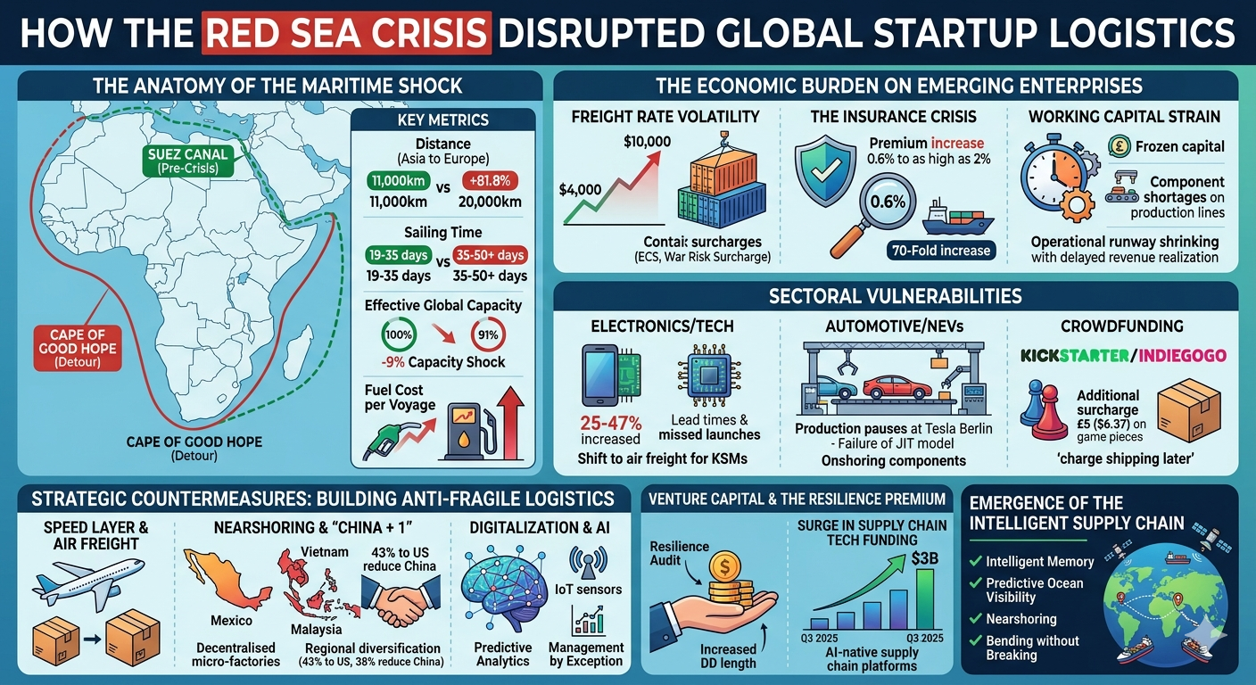 The Red Sea shipping crisis of 2023–2025 has been a watershed moment for the global startup community. It has exposed the inherent fragility of the cost-optimized, "Just-in-Time" logistics paradigm and replaced it with a mandatory requirement for resilience and agility. Startups that have navigated this period successfully are those that have embraced a tripartite strategy of technological adoption, geographic diversification, and financial stress-testing.