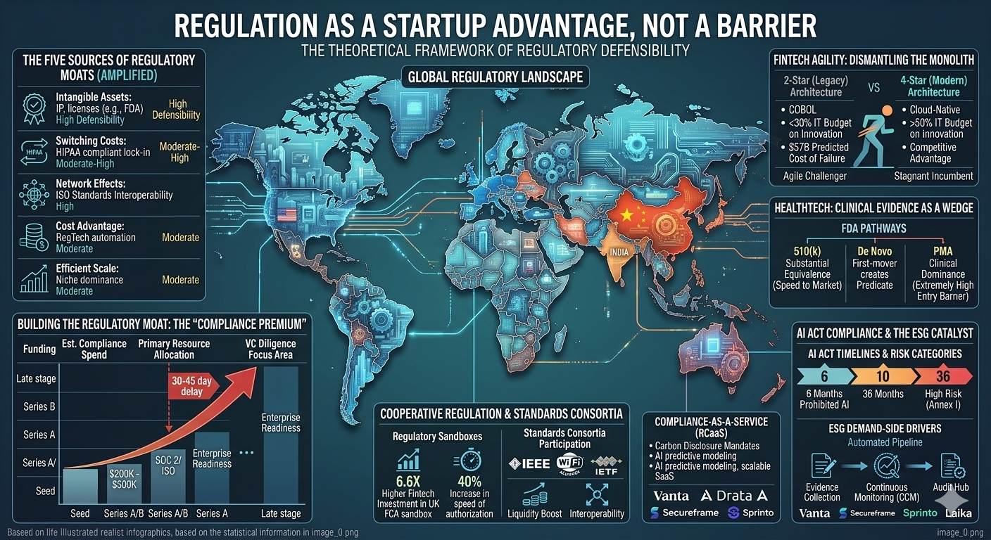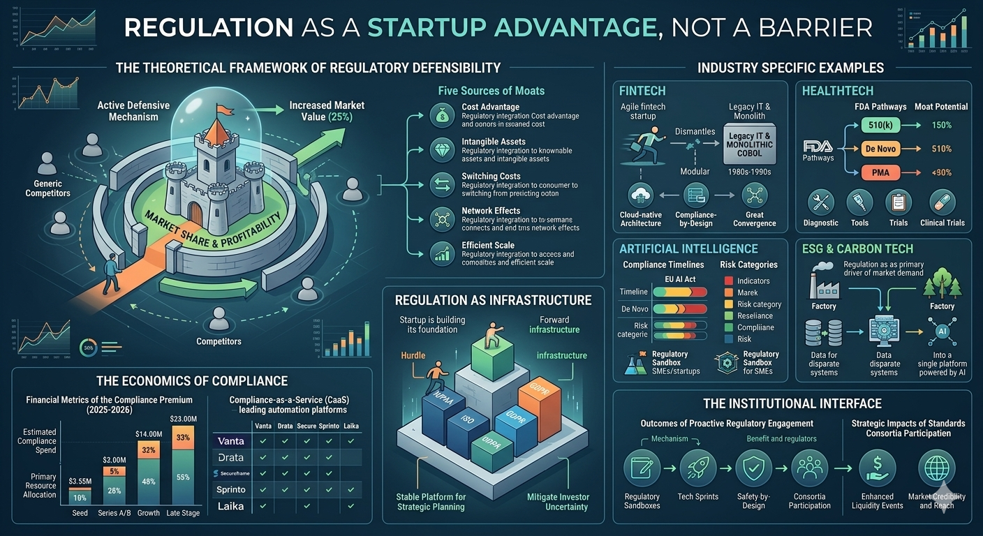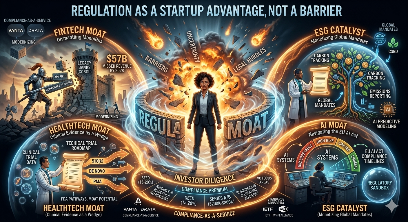 The evidence synthesized across the Fintech, Healthtech, AI, and ESG sectors suggests that the next generation of industry leaders will be defined by their ability to orchestrate regulation as a strategic asset. The shift from a reactive, compliance-as-a-chore mindset to a proactive, regulation-as-infrastructure philosophy is a fundamental differentiator in the current venture ecosystem. While regulation can indeed be a barrier for those who ignore it until it becomes mandatory, for the agile and strategic startup, it serves as a powerful "regulatory moat" that protects market share, enhances investor trust, and accelerates enterprise adoption.