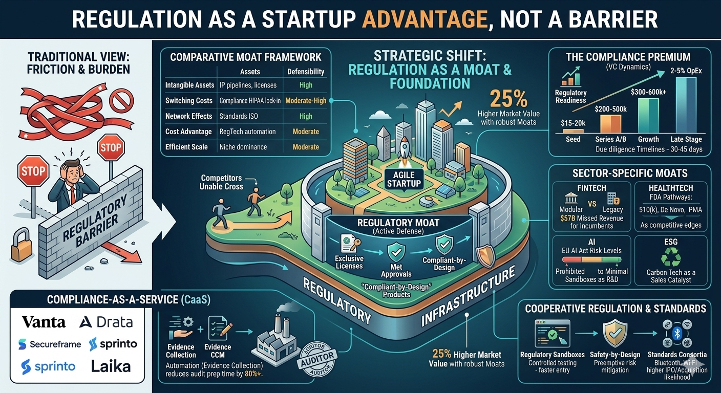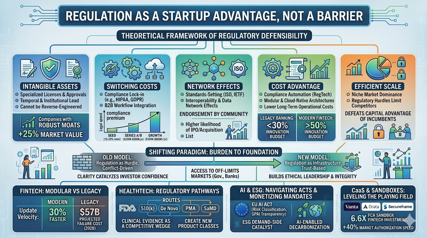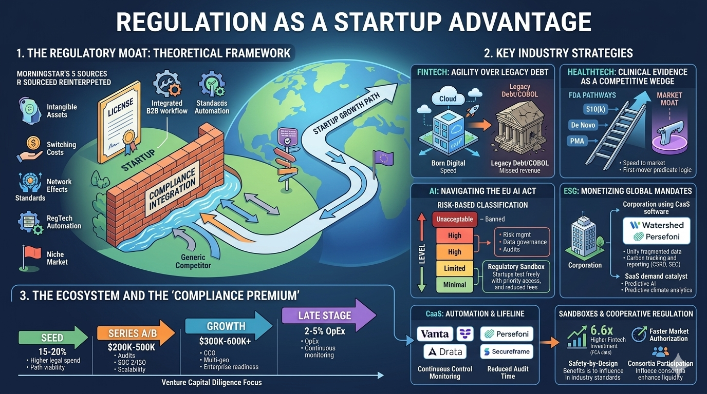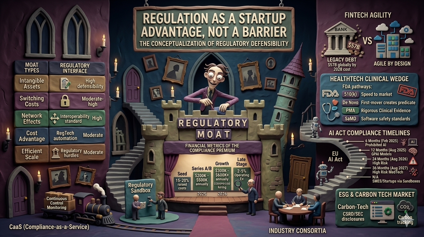 The evidence synthesized across the Fintech, Healthtech, AI, and ESG sectors suggests that the next generation of industry leaders will be defined by their ability to orchestrate regulation as a strategic asset. The shift from a reactive, compliance-as-a-chore mindset to a proactive, regulation-as-infrastructure philosophy is a fundamental differentiator in the current venture ecosystem. While regulation can indeed be a barrier for those who ignore it until it becomes mandatory, for the agile and strategic startup, it serves as a powerful "regulatory moat" that protects market share, enhances investor trust, and accelerates enterprise adoption.