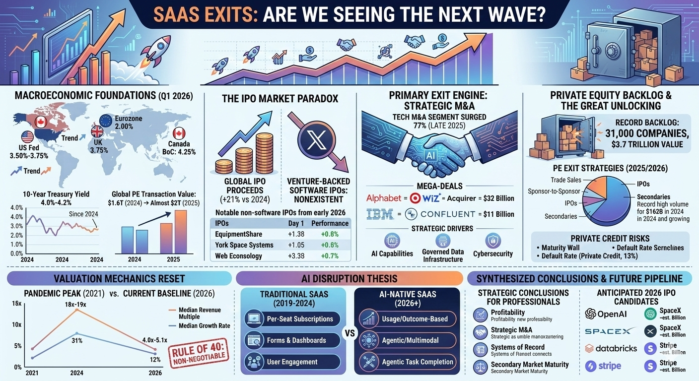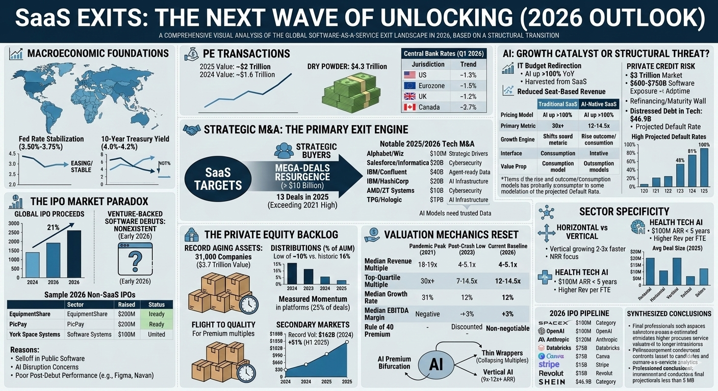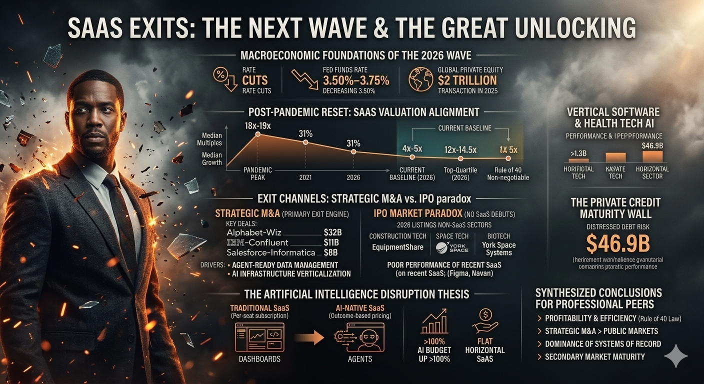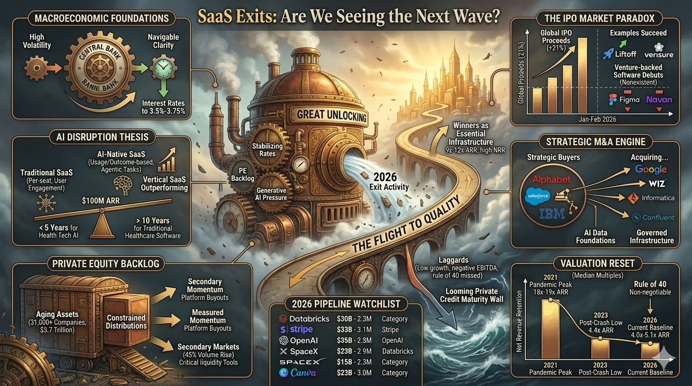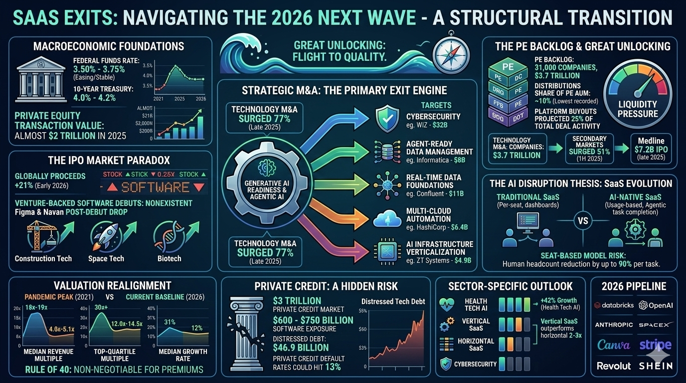 The global software-as-a-service ecosystem is currently navigating a period of profound structural transition, often characterized by market participants as the great unlocking. Following a multi-year period of constrained liquidity, the convergence of stabilizing interest rates, a massive backlog of private equity-held assets, and the transformative pressure of generative artificial intelligence has initiated a new wave of exit activity. However, this wave does not resemble the speculative frenzy of 2021; instead, it is defined by a rigorous flight to quality, where valuation premiums are reserved exclusively for assets demonstrating operational efficiency and agentic artificial intelligence readiness. While the broader initial public offering market has shown signs of recovery in early 2026, the software sector faces a unique narrative driven by concerns over disruption of traditional seat-based revenue models. This has shifted the primary exit focus toward strategic mergers and acquisitions and secondary market transactions, creating a bifurcated landscape where winners are valued as essential infrastructure and laggards face the pressure of a looming private credit maturity wall.