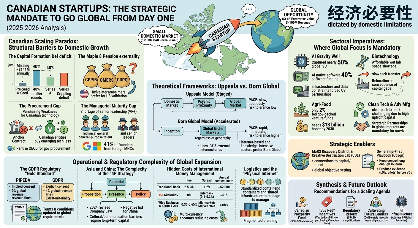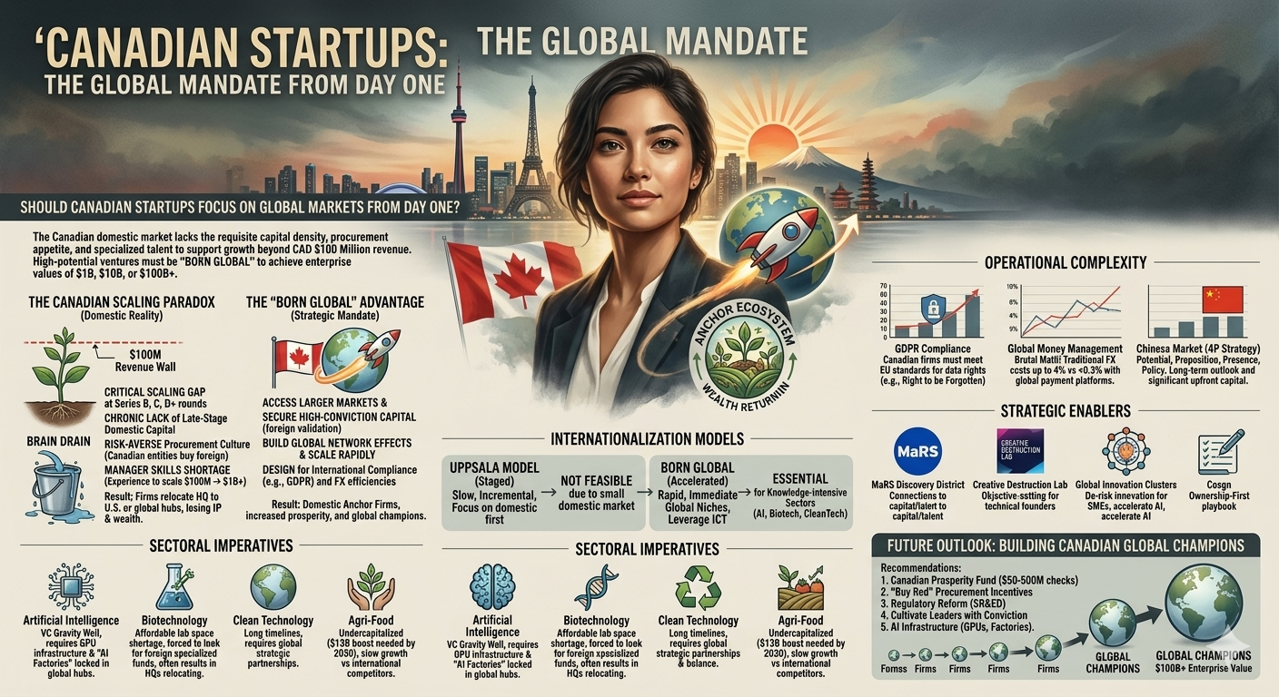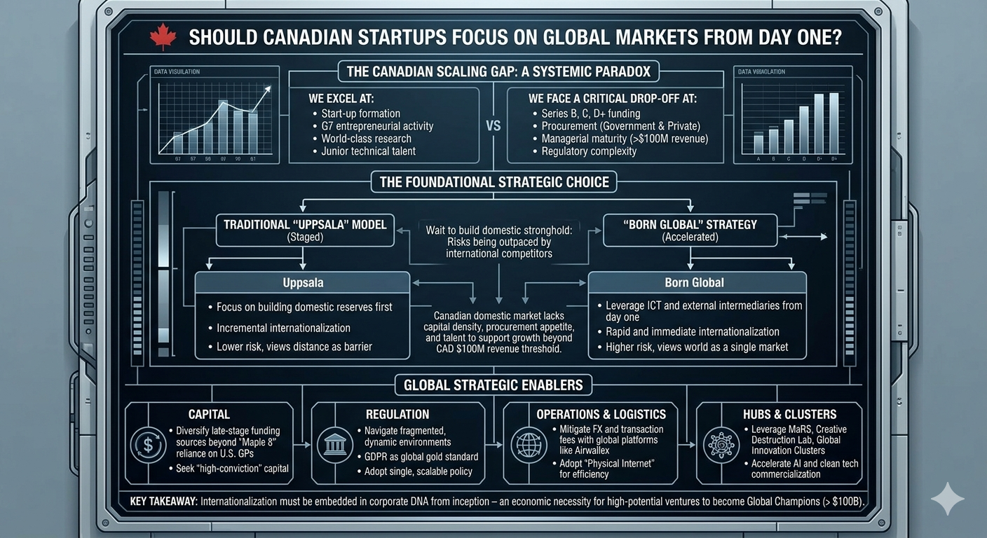 The Canadian innovation ecosystem is currently defined by a profound structural contradiction. While Canada consistently produces world-class research and maintains the highest level of early-stage entrepreneurial activity among G7 nations, it faces a systemic "scaling gap" that prevents domestic startups from maturing into global anchor firms. The central strategic inquiry—whether Canadian startups should focus on global markets from day one—is no longer a matter of preference but an economic necessity dictated by the limitations of the domestic market. For high-potential ventures, particularly in knowledge-intensive sectors like artificial intelligence, biotechnology, and clean energy, the Canadian domestic market lacks the requisite capital density, procurement appetite, and specialized talent to support growth beyond a $\text{CAD } \$100 \text{ million}$ revenue threshold.