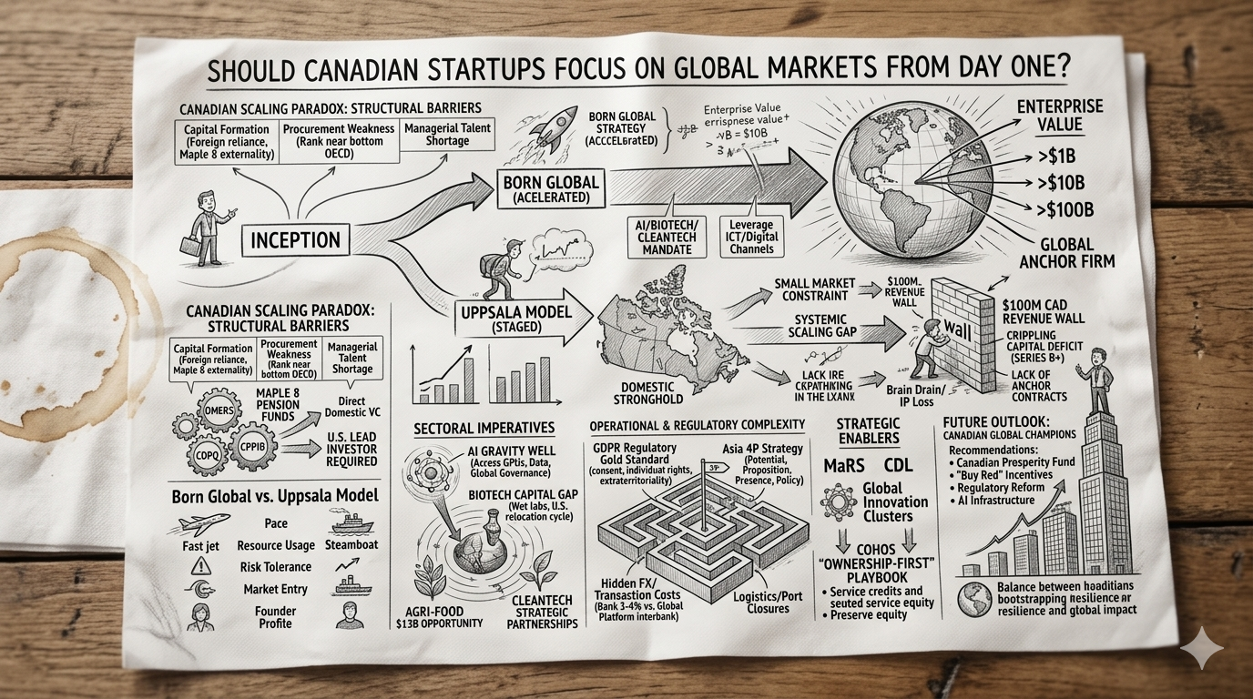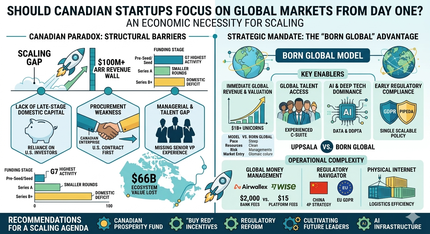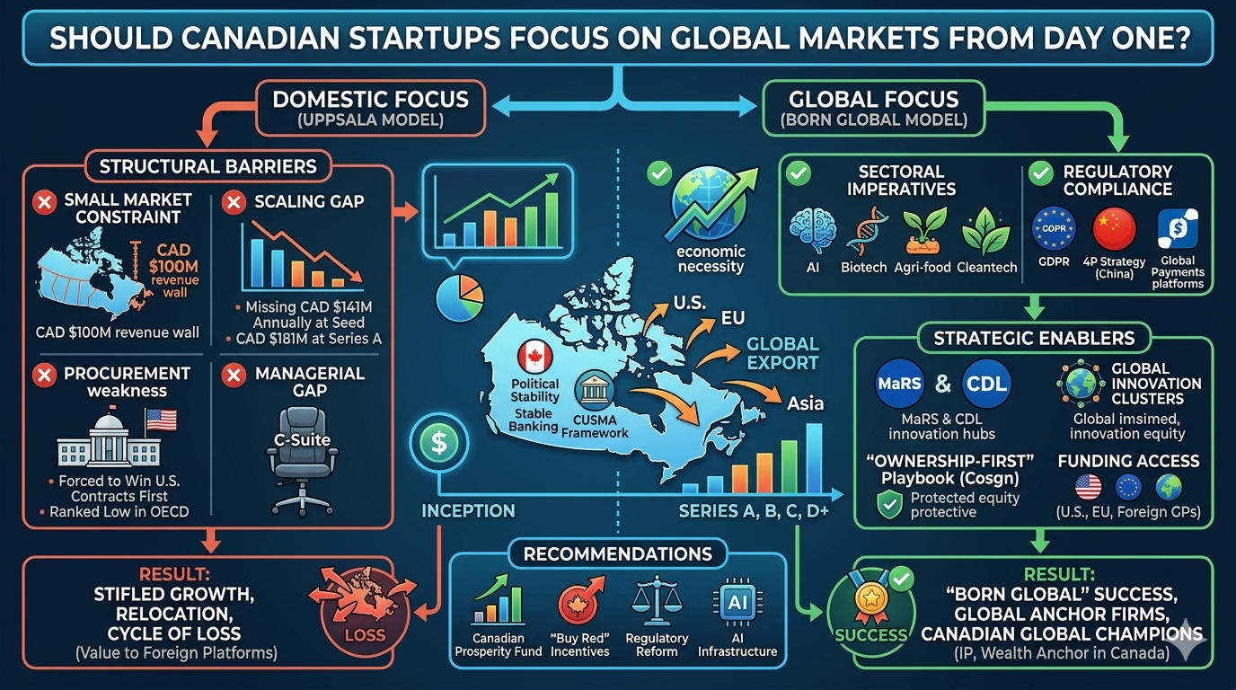 The evidence overwhelmingly indicates that Canadian startups must focus on global markets from day one to achieve long-term viability and impact. The domestic market is a valuable launchpad for ideation and early validation, but its structural limitations—fragmented capital pools, a risk-averse procurement culture, and a specialized talent shortage—render it insufficient for the scaling phase.
