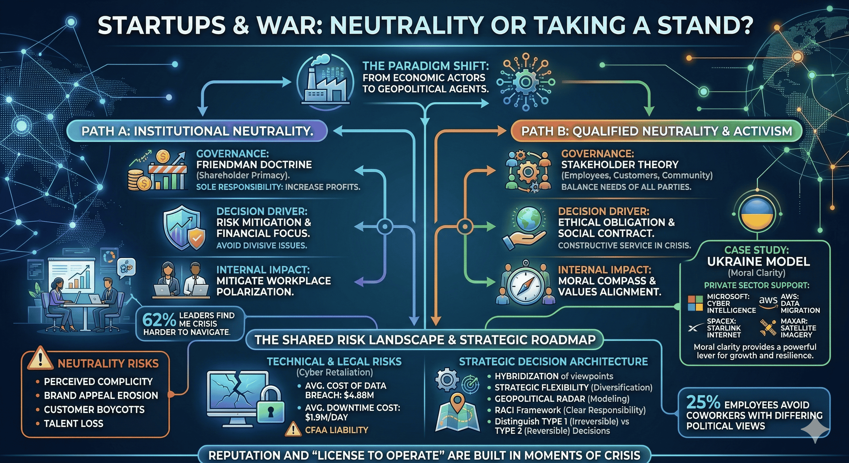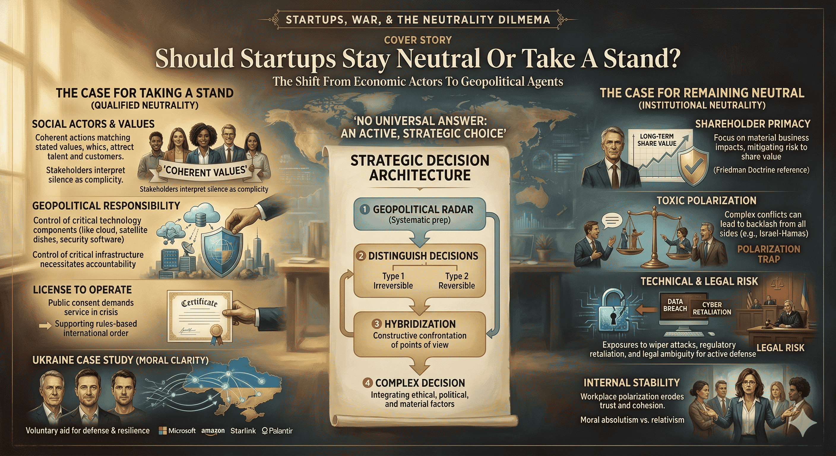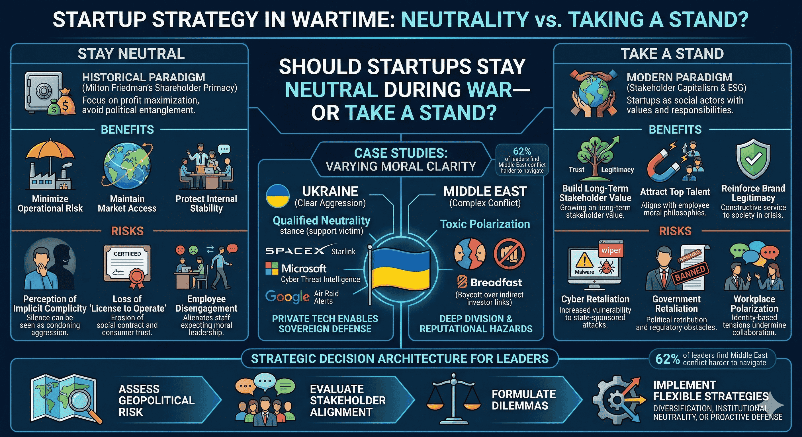 The fundamental question of whether a startup should stay neutral or take a stand in wartime does not yield a universal answer. Instead, the evidence suggests that the very concept of "neutrality" has been transformed. It is no longer a passive state but an active, strategic, and moral choice that carries its own set of risks and rewards. For startups, the "Ukraine model" has shown that moral clarity can provide a powerful lever for growth and resilience, while the polarization surrounding the Middle East conflict has demonstrated the dangers of perceived hypocrisy and the high cost of silence.