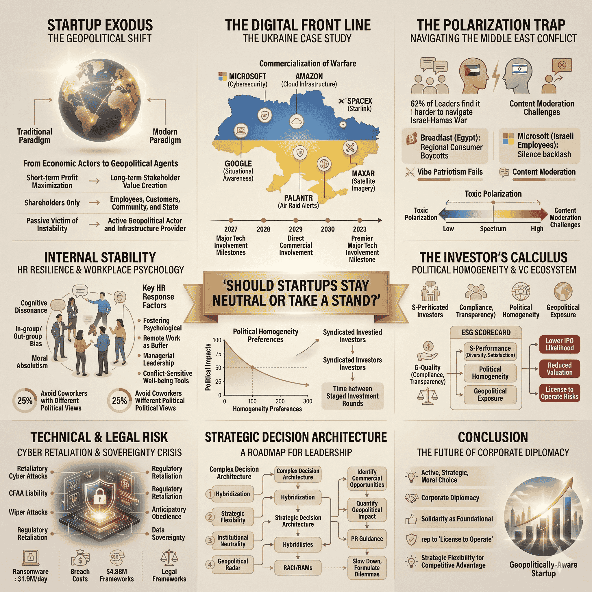 The future of the startup ecosystem is inextricably linked to geopolitical dynamics. As private tech companies become "owners and rulers of critical assets," their agency in global affairs will only increase. To thrive in this "geopolitical recession," where global governance is languishing and instability is rising, business leaders must move beyond siloed risk management. They must embrace a form of corporate diplomacy that balances the needs of a diverse workforce, the demands of a morally attuned public, and the technical imperatives of a digital battlespace. In the final analysis, the most successful startups will be those that recognize that their reputation—and their "license to operate"—is built in moments of crisis, where solidarity is no longer symbolic but foundational. By building strategic flexibility and a robust decision architecture, founders can transform geopolitical turbulence into a sustainable competitive advantage.