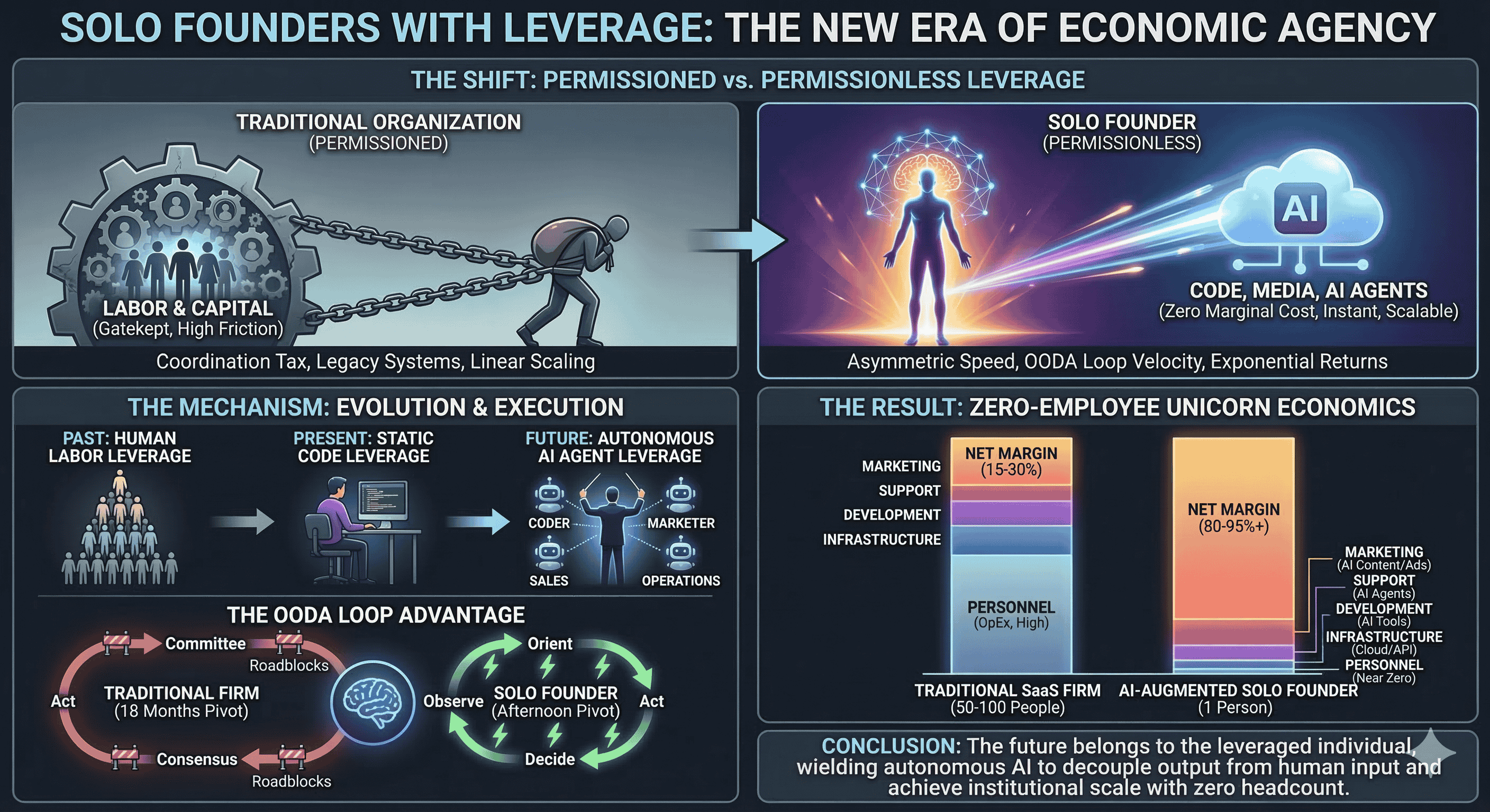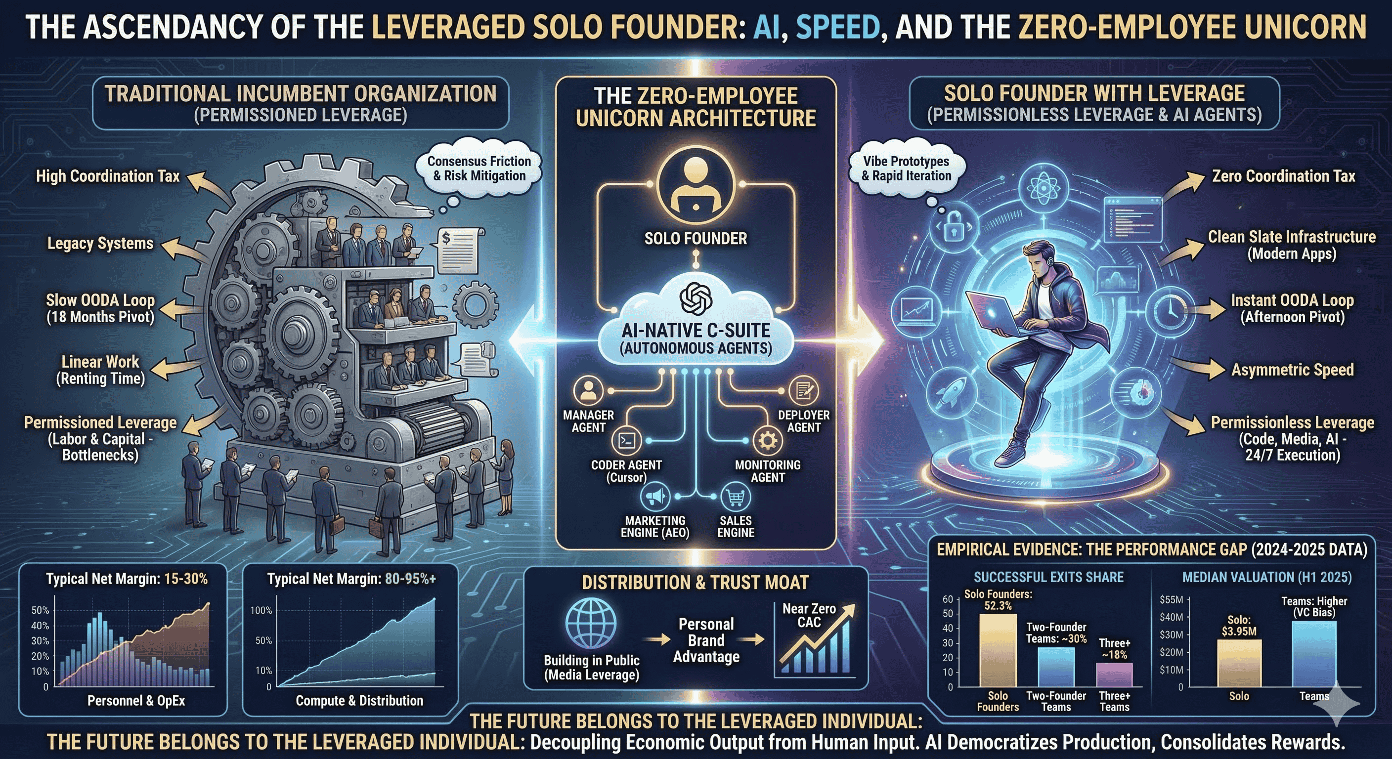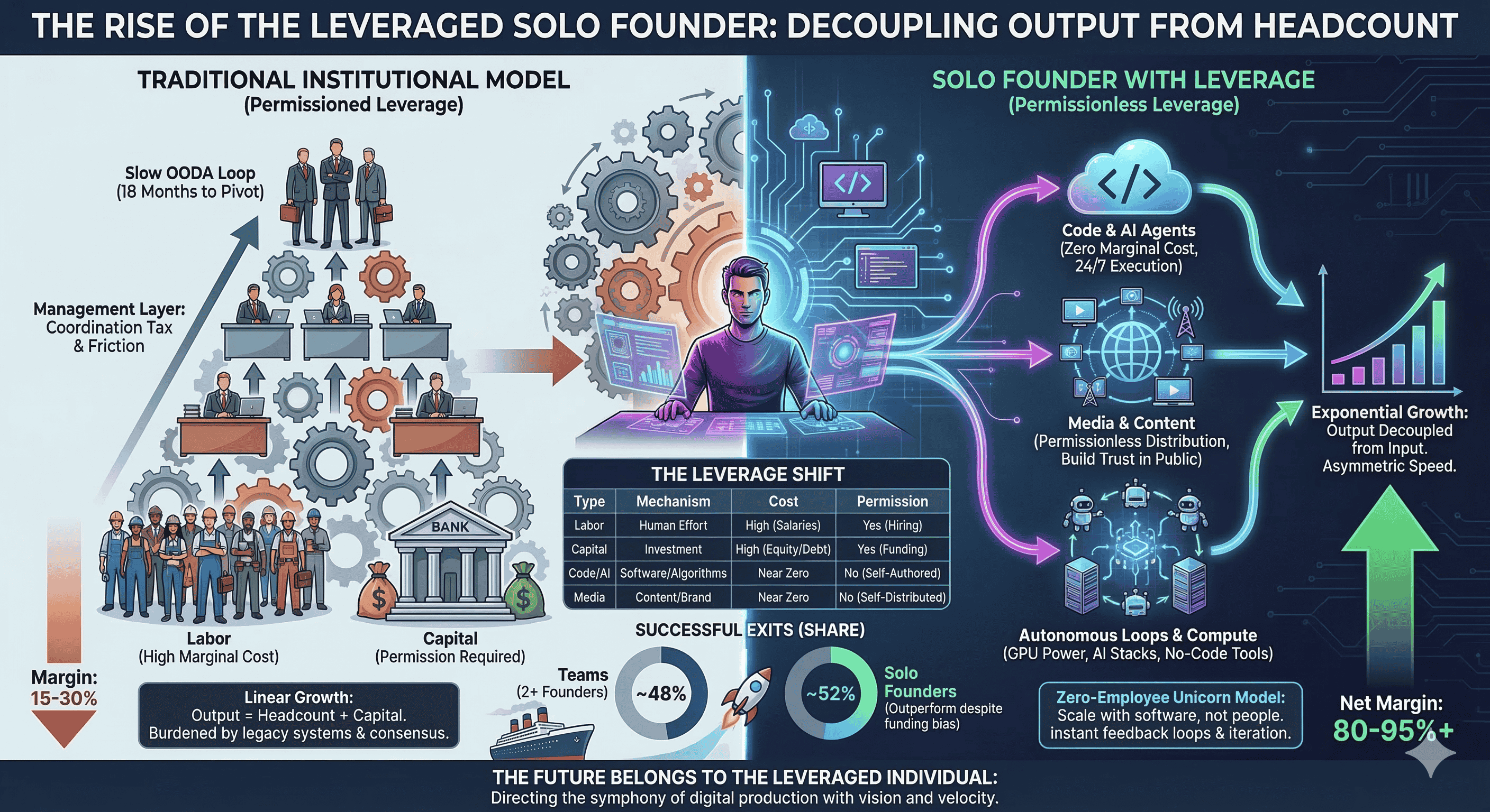 The Zero-Employee Unicorn is no longer a theoretical concept but an emerging reality, validated by exit data showing that single founders comprise over half of successful exits. For the modern founder, the path to wealth and impact no longer requires a workforce of hundreds. It requires the strategic application of "Specific Knowledge"—the unique intersection of personal curiosity and technical expertise—paired with the mastery of an "army of robots" working silently in the cloud. As technology continues to democratize consumption while consolidating production, the economic rewards will increasingly accrue to those who can direct the symphony of leverage with the greatest vision and the highest velocity. The future belongs to the leveraged individual, and for the first time in history, that future can be built entirely by a single person with a laptop and a goal.