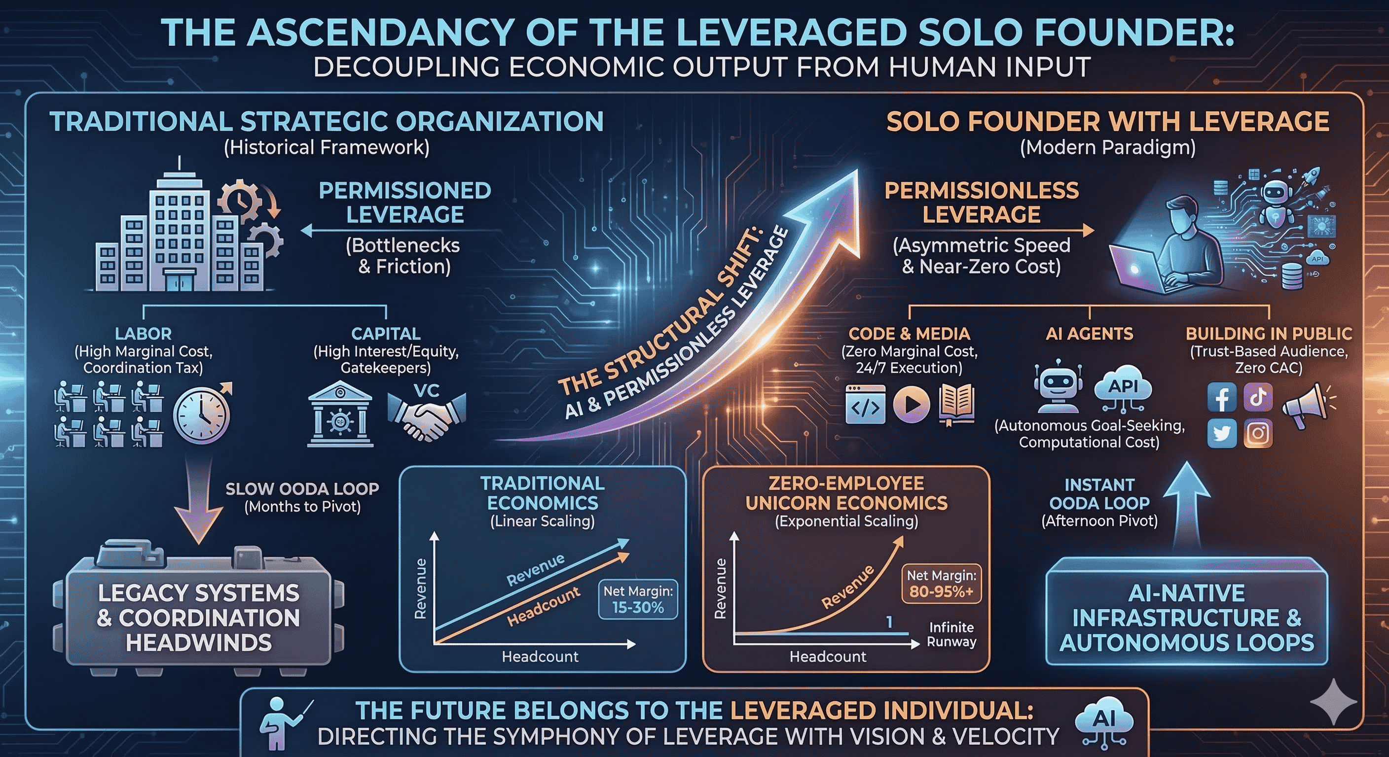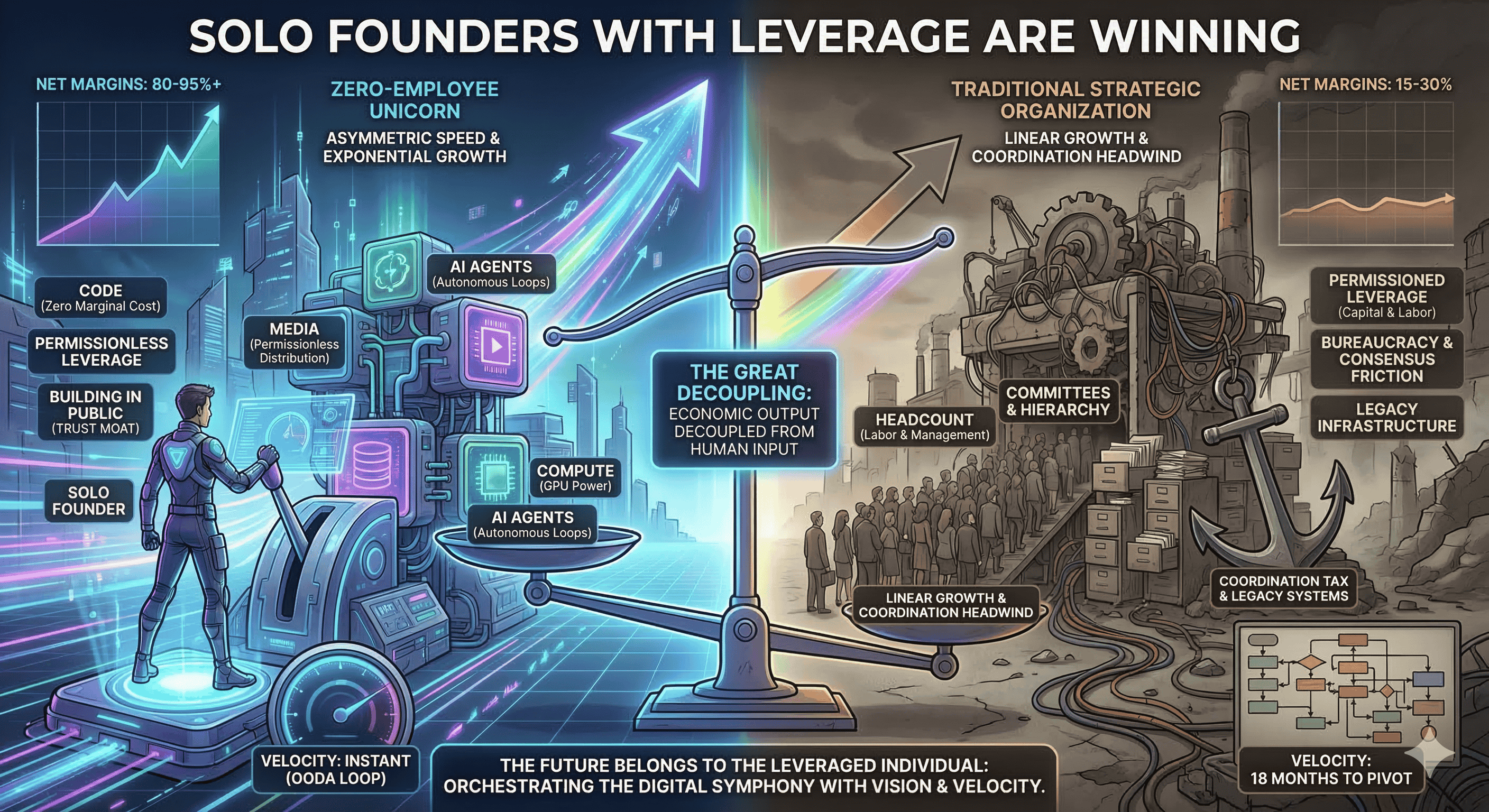 The shift from traditional strategic organizations to leveraged solo founders is not a temporary trend but a fundamental restructuring of the global economy. The emergence of AI as the ultimate permissionless leverage has collapsed the timeline from idea to execution and eliminated the historical requirement for human-heavy operational structures. Traditional organizations, hindered by coordination tax, legacy systems, and a reliance on permissioned leverage, will increasingly find themselves unable to compete with the iteration speed and profit margins of AI-augmented solo operators.