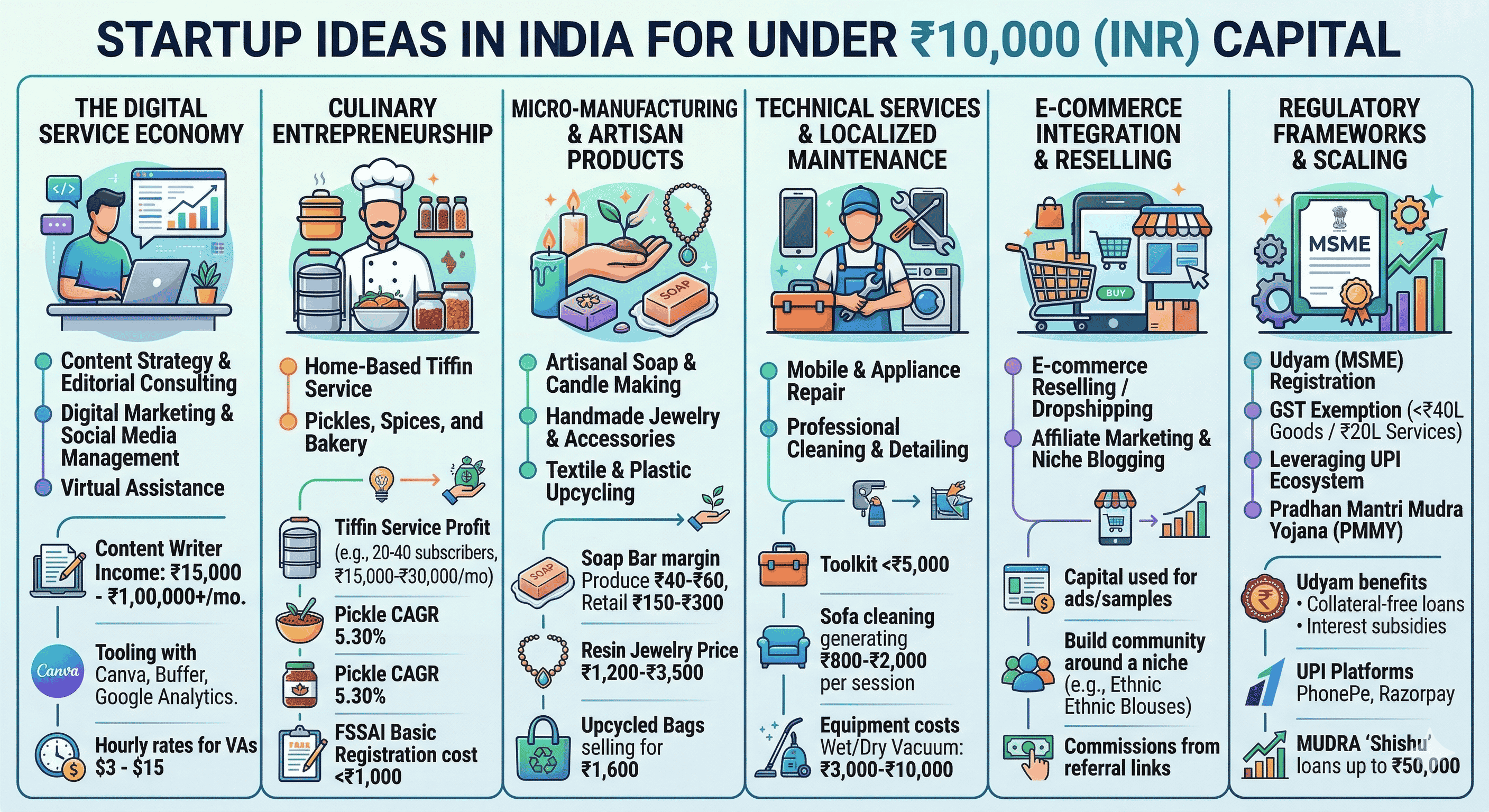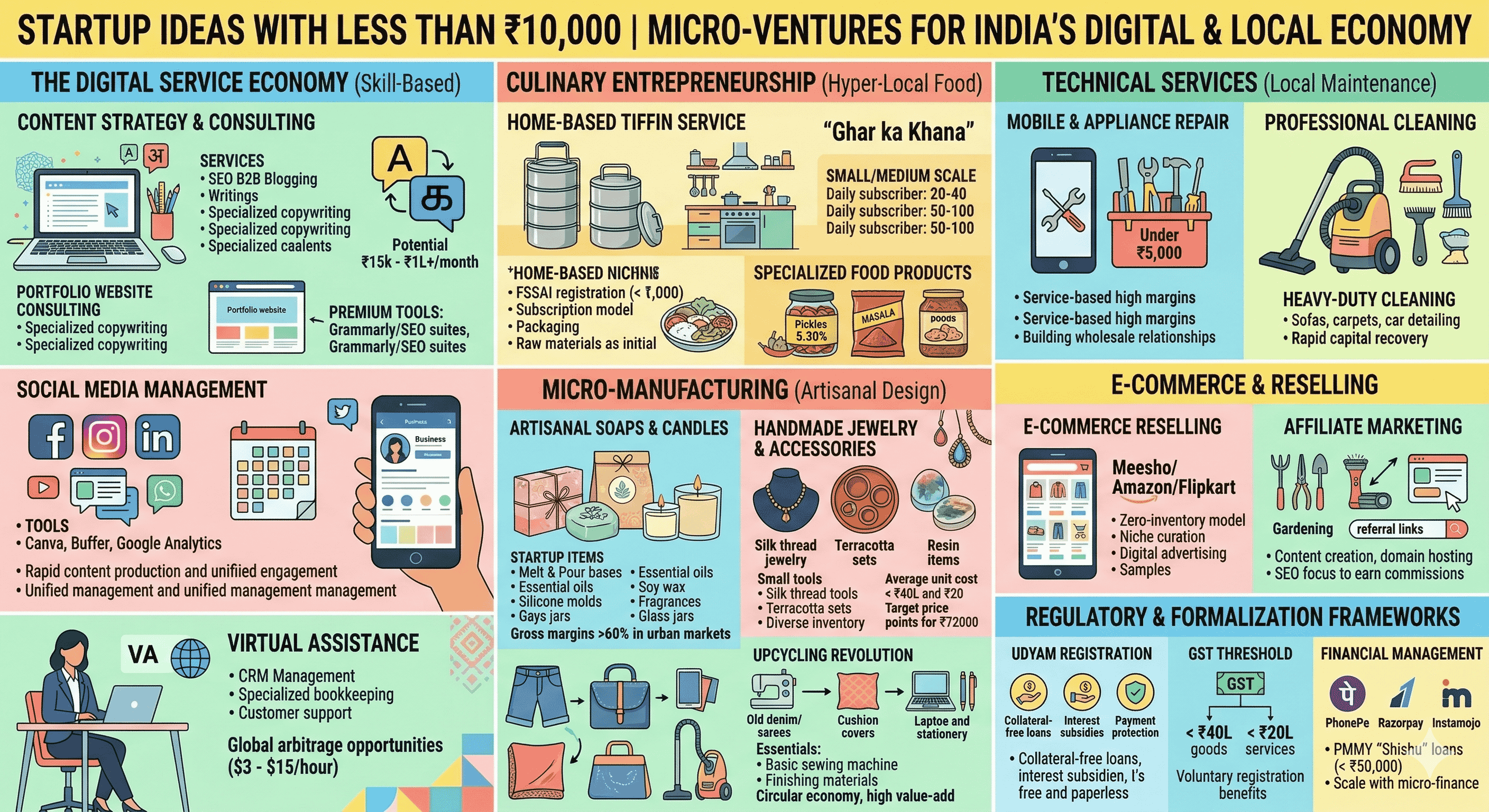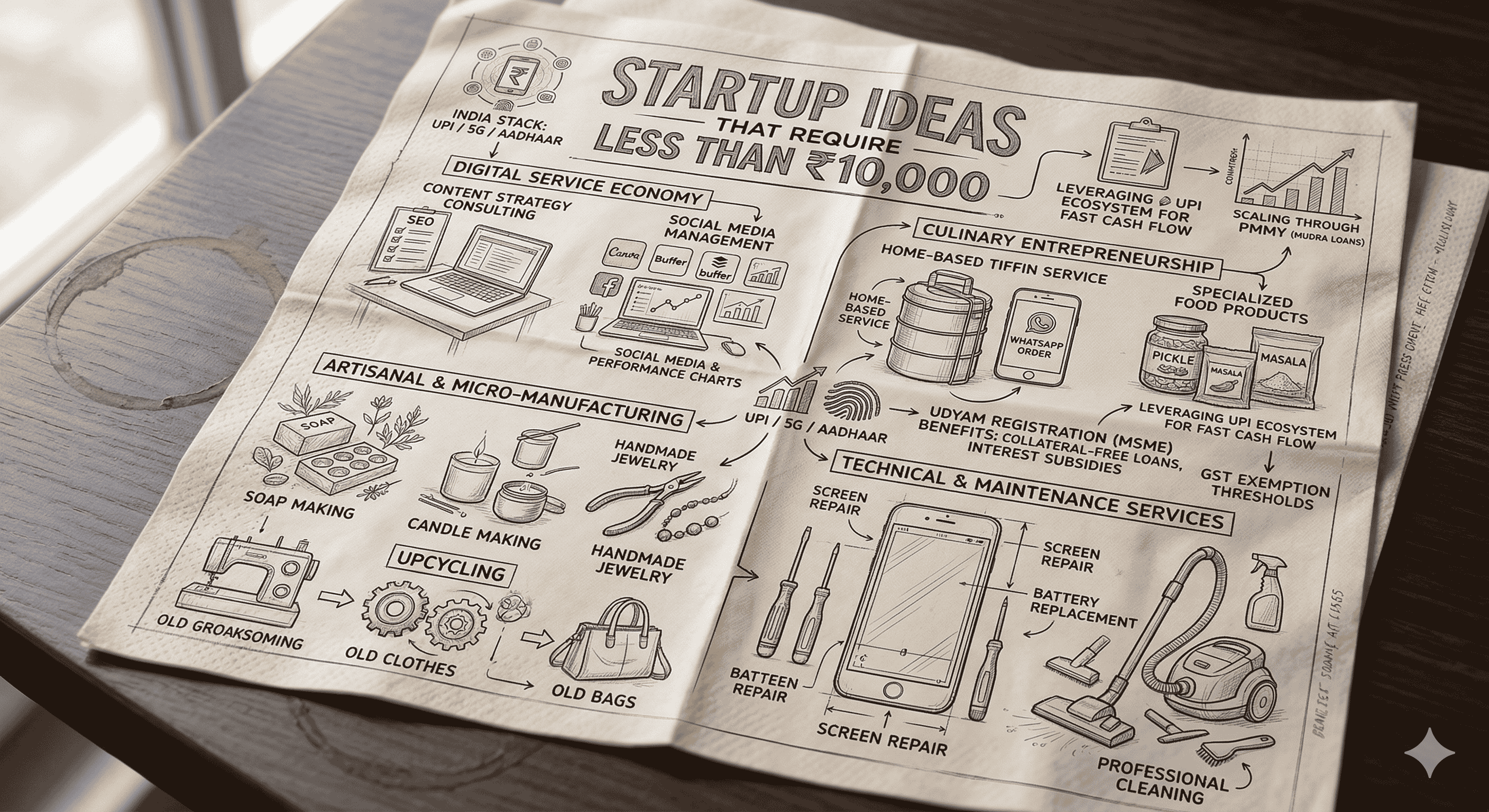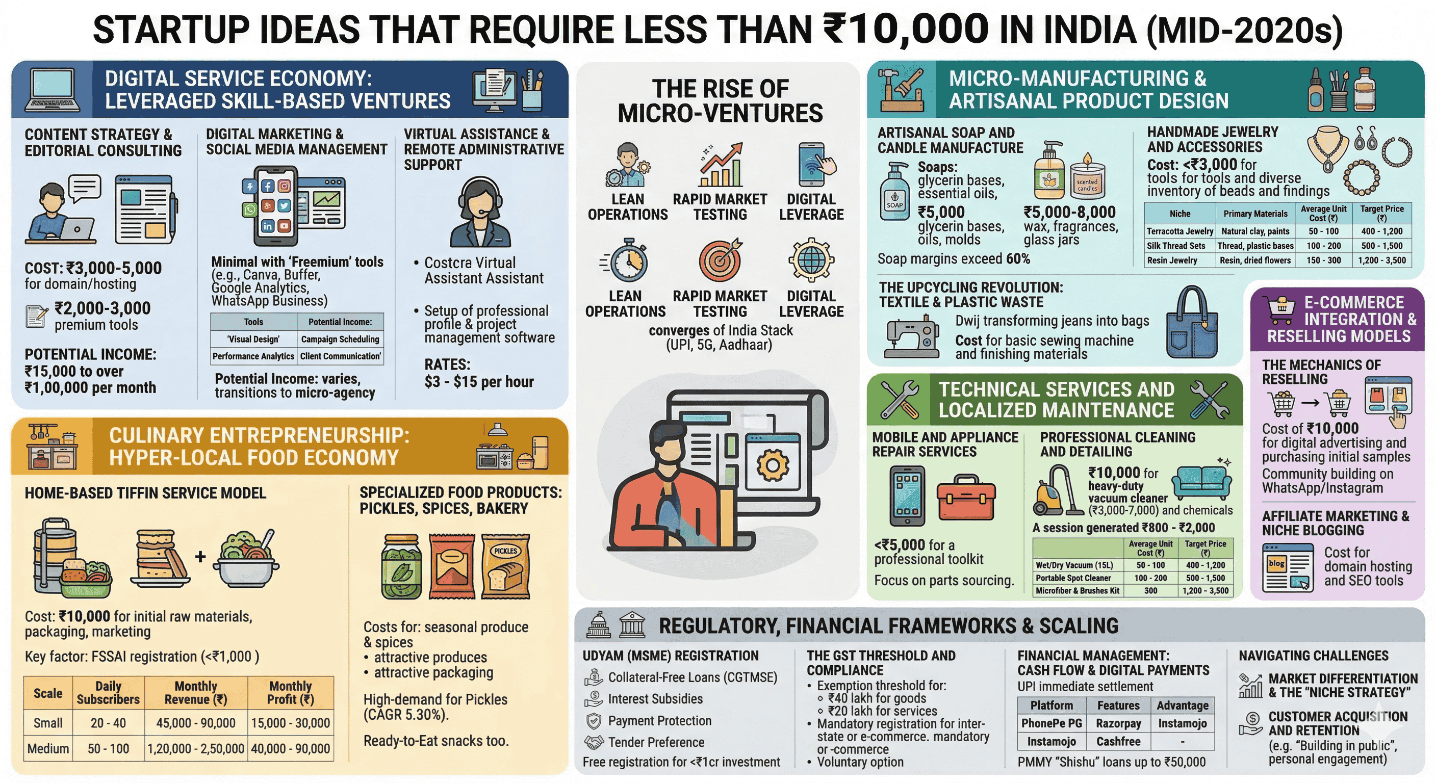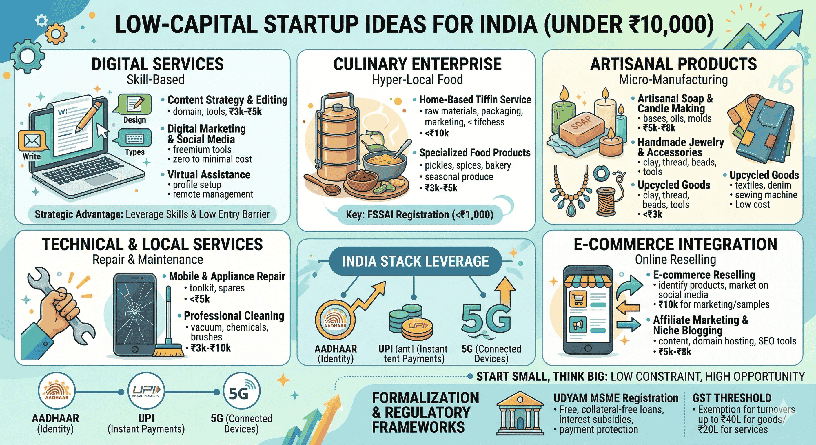 The economic landscape of India in the mid-2020s is defined by a paradoxical shift: while venture capital continues to flow into billion-dollar unicorns, the true engine of domestic economic resilience is the proliferation of micro-scale ventures initiated with less than ₹10,000 in capital. This phenomenon is not merely a result of financial constraint but is increasingly a strategic choice by a new generation of entrepreneurs who prioritize lean operations, rapid market testing, and digital leverage over traditional capital-intensive models. The convergence of the India Stack—incorporating Aadhaar for identity, the Unified Payments Interface (UPI) for frictionless micro-transactions, and ubiquitous 5G connectivity—has reduced the "cost of starting" to its historical nadir. This report examines the structural viability of these sub-₹10,000 startups, categorizing them by sector, analyzing their unit economics, and evaluating the regulatory and financial frameworks that allow them to scale from domestic experiments to formal market participants.