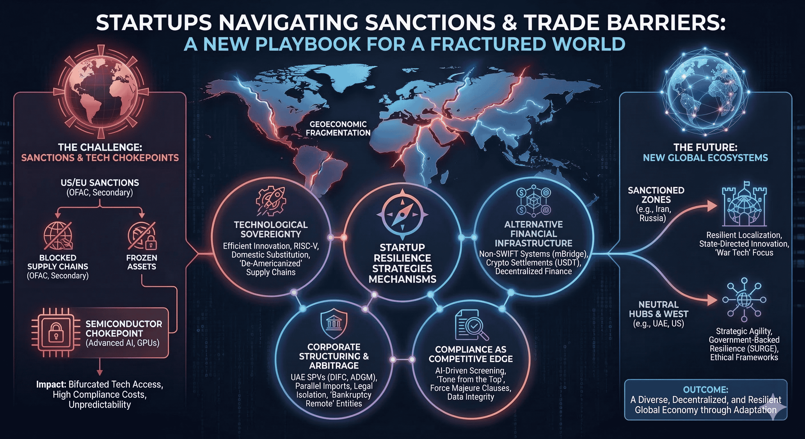 For startups in the West and in neutral hubs like the UAE, the key is Strategic Agility. This involves professionalizing compliance as a core competency, leveraging offshore structures for risk isolation, and proactively seeking government-backed resilience funding. The ability to "pivot" is no longer just about product-market fit; it is about "regulatory fit"—the capacity to reconfigure a business model overnight in response to a new executive order or a sudden shift in trade alliances.