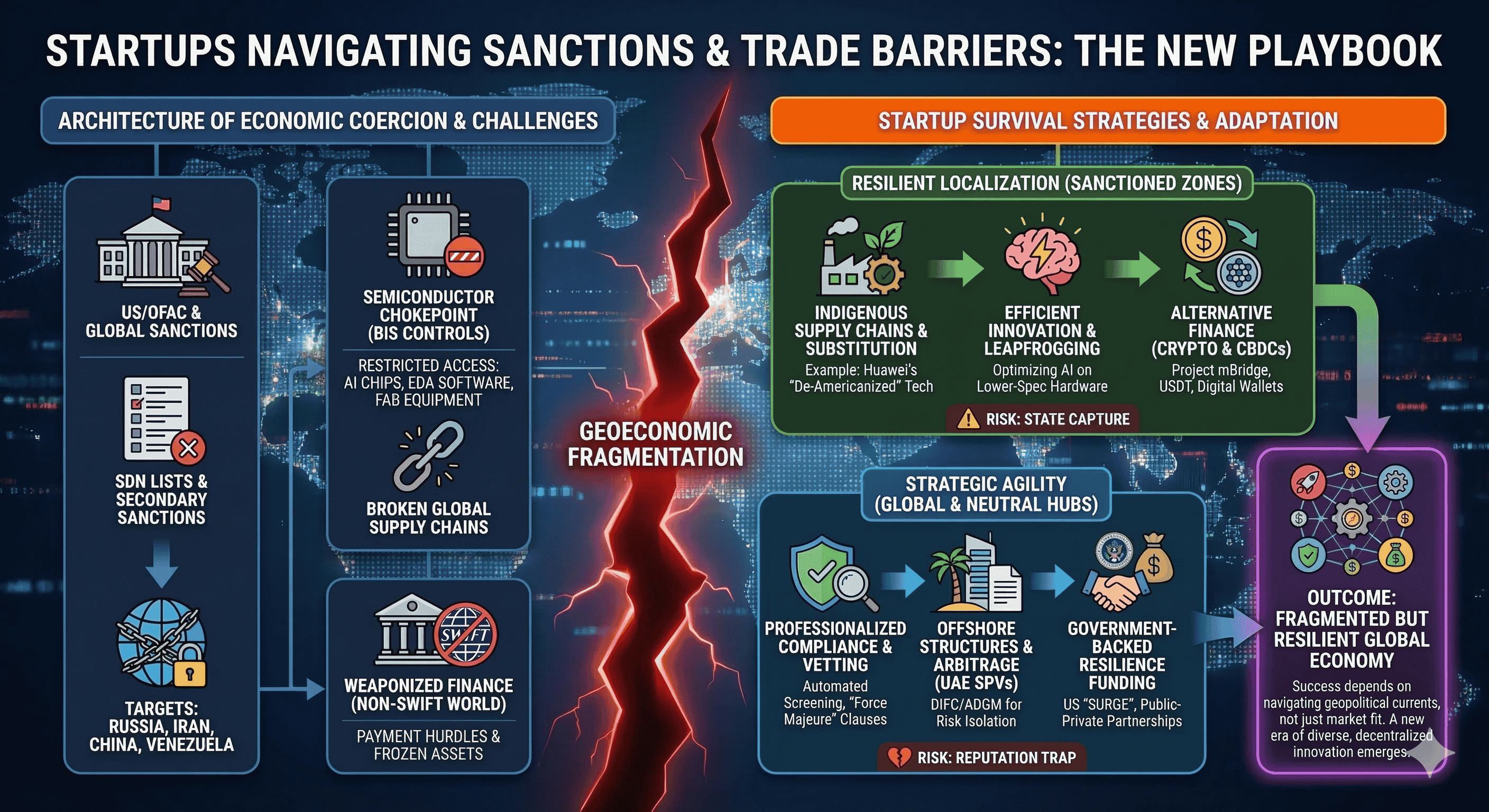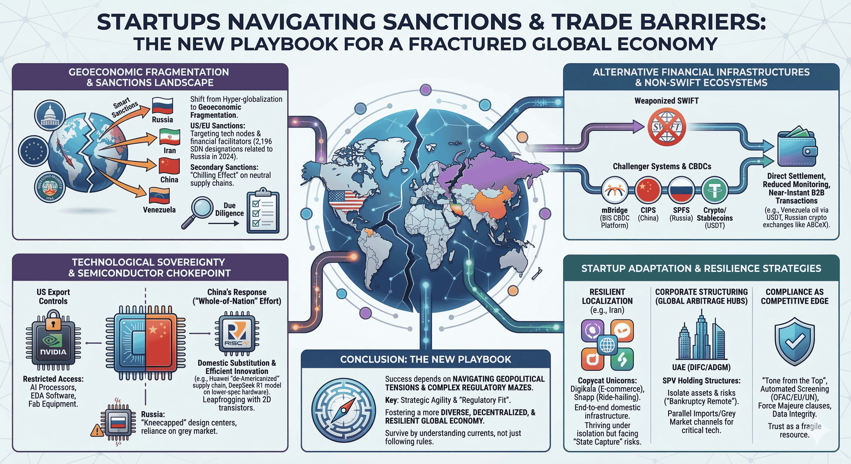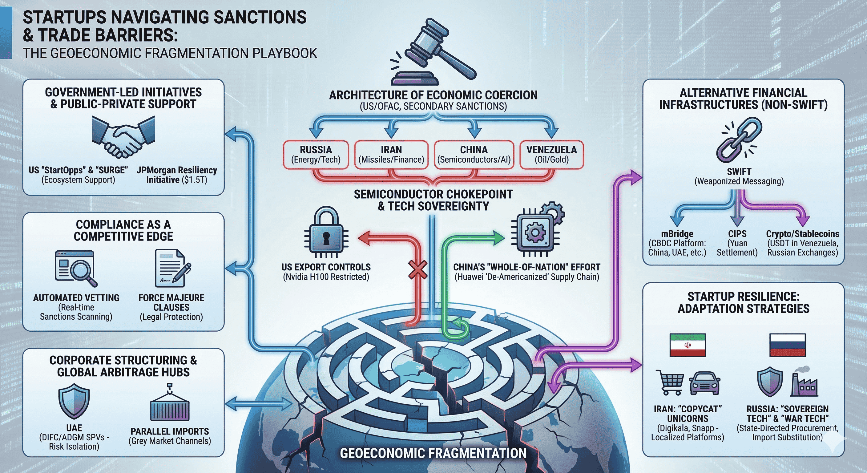 The contemporary global economic order is currently undergoing its most significant structural realignment since the end of the Cold War. The era of frictionless hyper-globalization has been superseded by a paradigm of geoeconomic fragmentation, where trade policy, financial connectivity, and technological standards are increasingly wielded as instruments of national security. For the global startup ecosystem, particularly those ventures operating within or adjacent to contested jurisdictions, this shift has transformed the regulatory landscape from a manageable administrative hurdle into an existential strategic challenge. Startups in jurisdictions such as Russia, Iran, China, and Venezuela find themselves at the epicenter of this transformation, forced to pioneer novel survival strategies that range from localized technological substitution to the adoption of decentralized financial architectures.