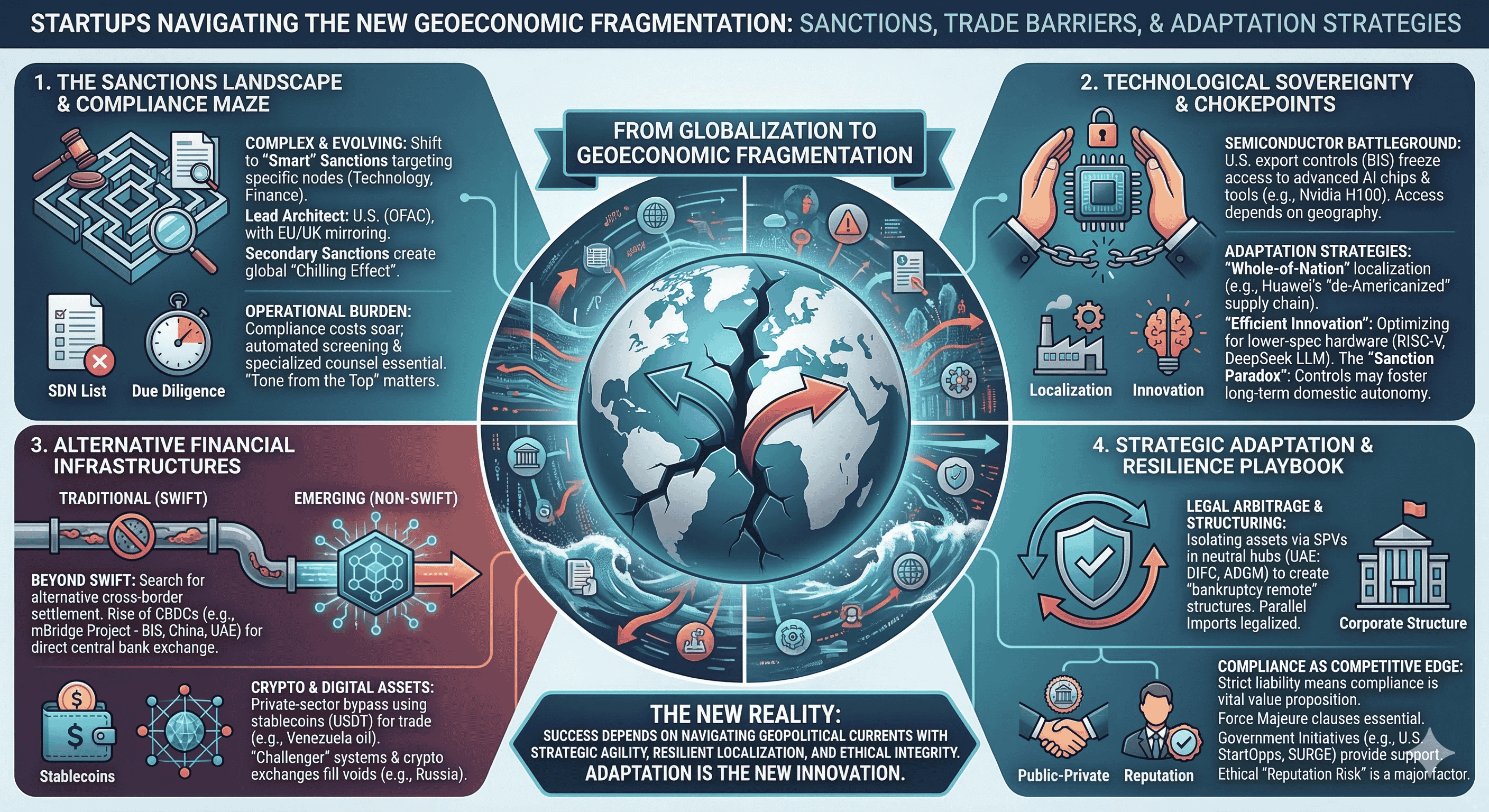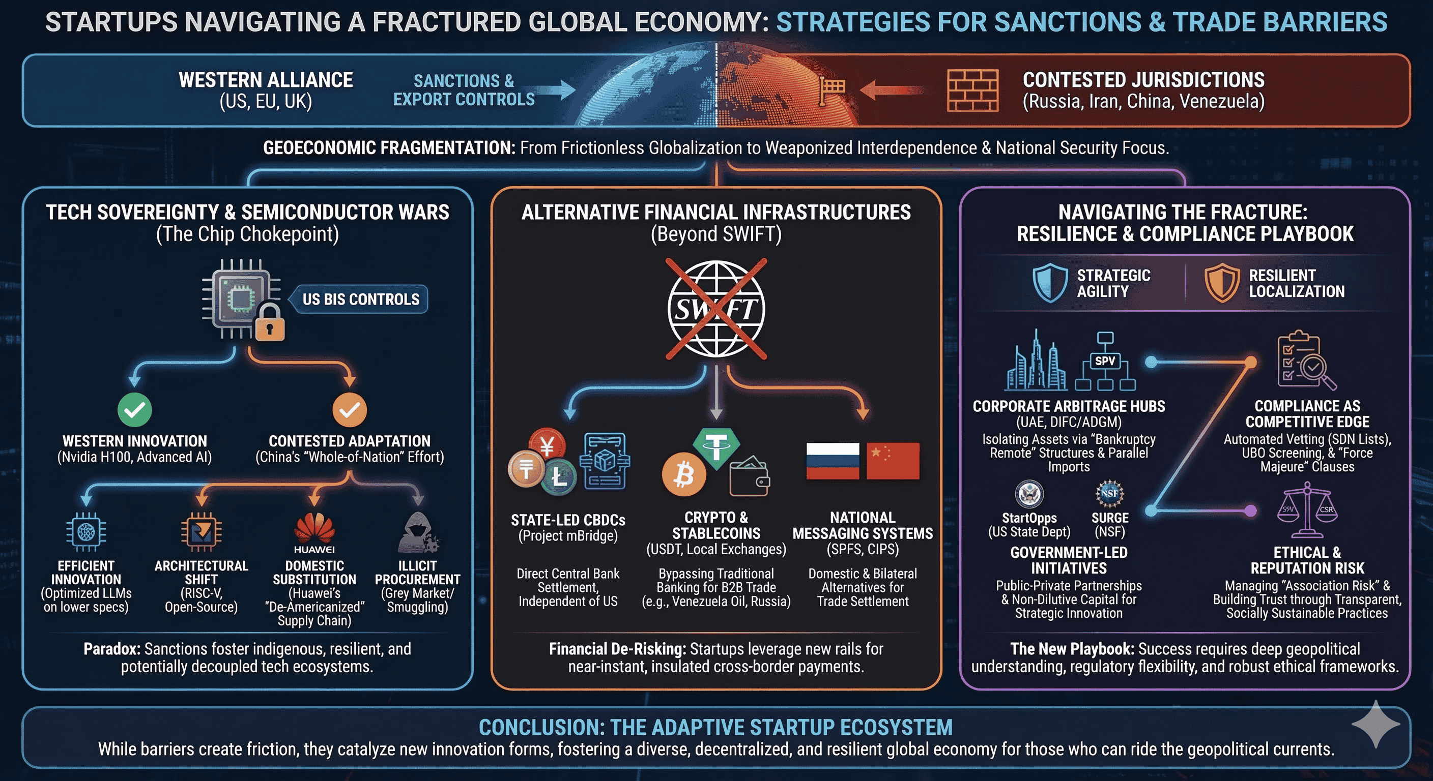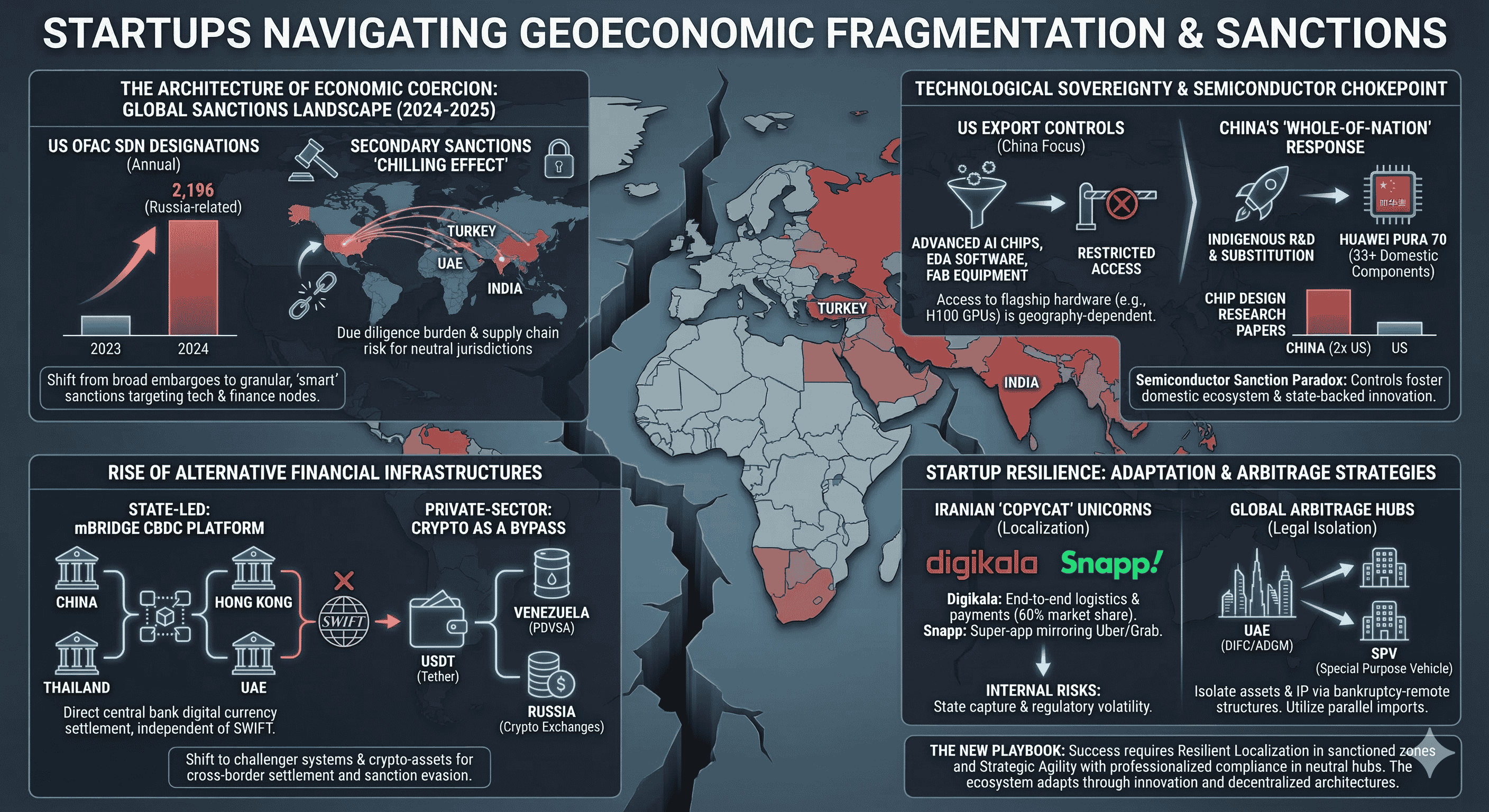 The contemporary global economic order is currently undergoing its most significant structural realignment since the end of the Cold War. The era of frictionless hyper-globalization has been superseded by a paradigm of geoeconomic fragmentation, where trade policy, financial connectivity, and technological standards are increasingly wielded as instruments of national security. For the global startup ecosystem, particularly those ventures operating within or adjacent to contested jurisdictions, this shift has transformed the regulatory landscape from a manageable administrative hurdle into an existential strategic challenge. Startups in jurisdictions such as Russia, Iran, China, and Venezuela find themselves at the epicenter of this transformation, forced to pioneer novel survival strategies that range from localized technological substitution to the adoption of decentralized financial architectures.