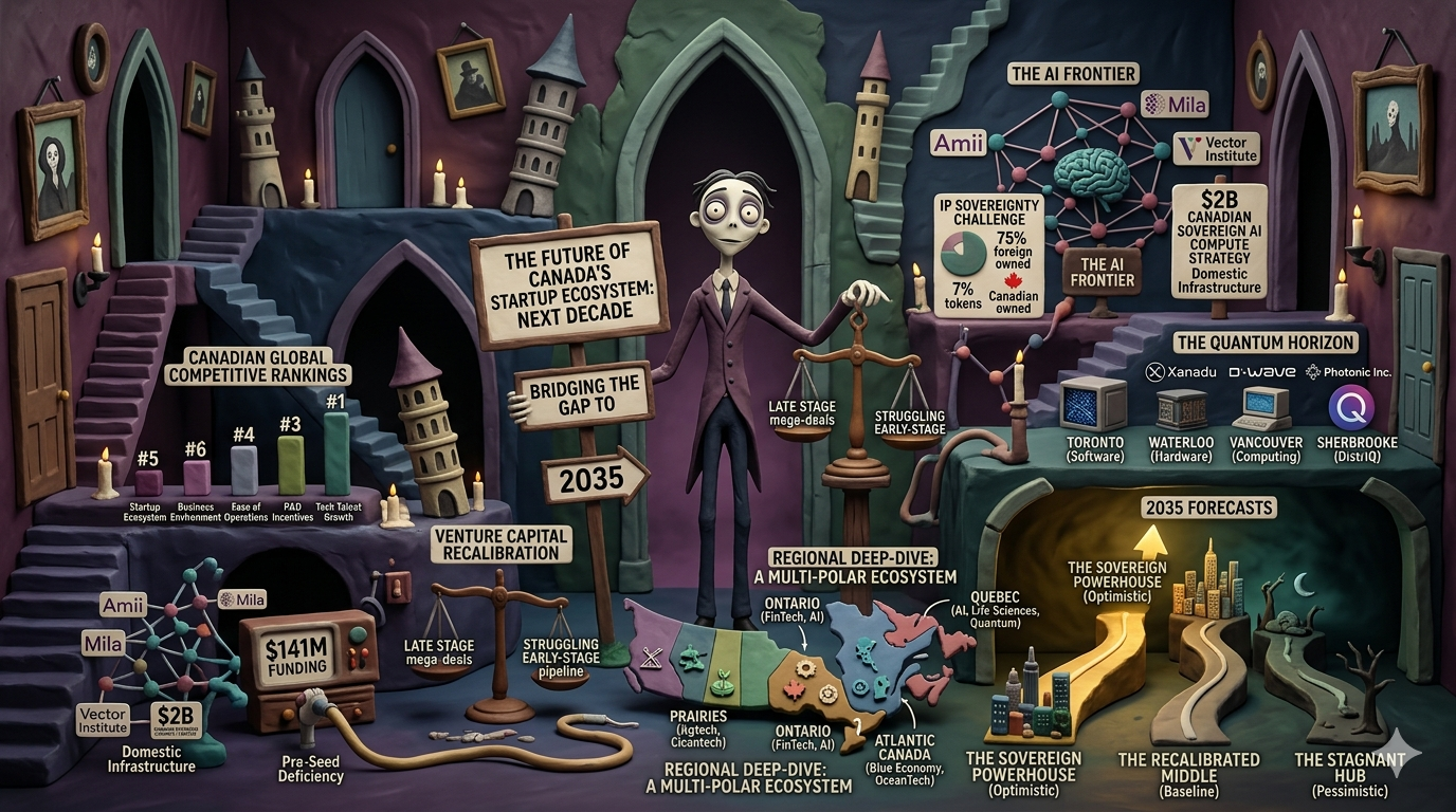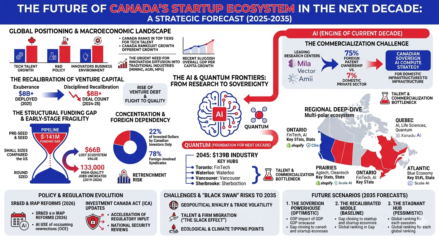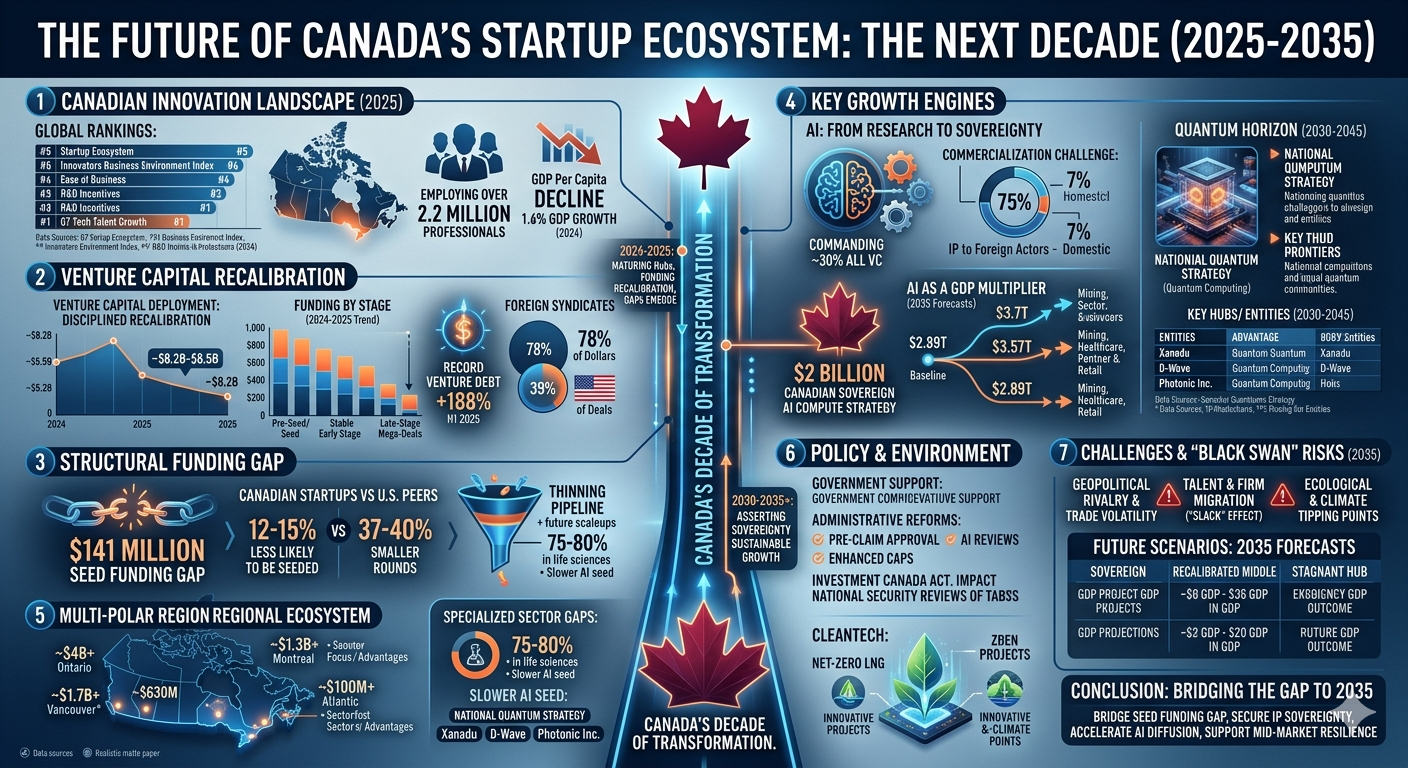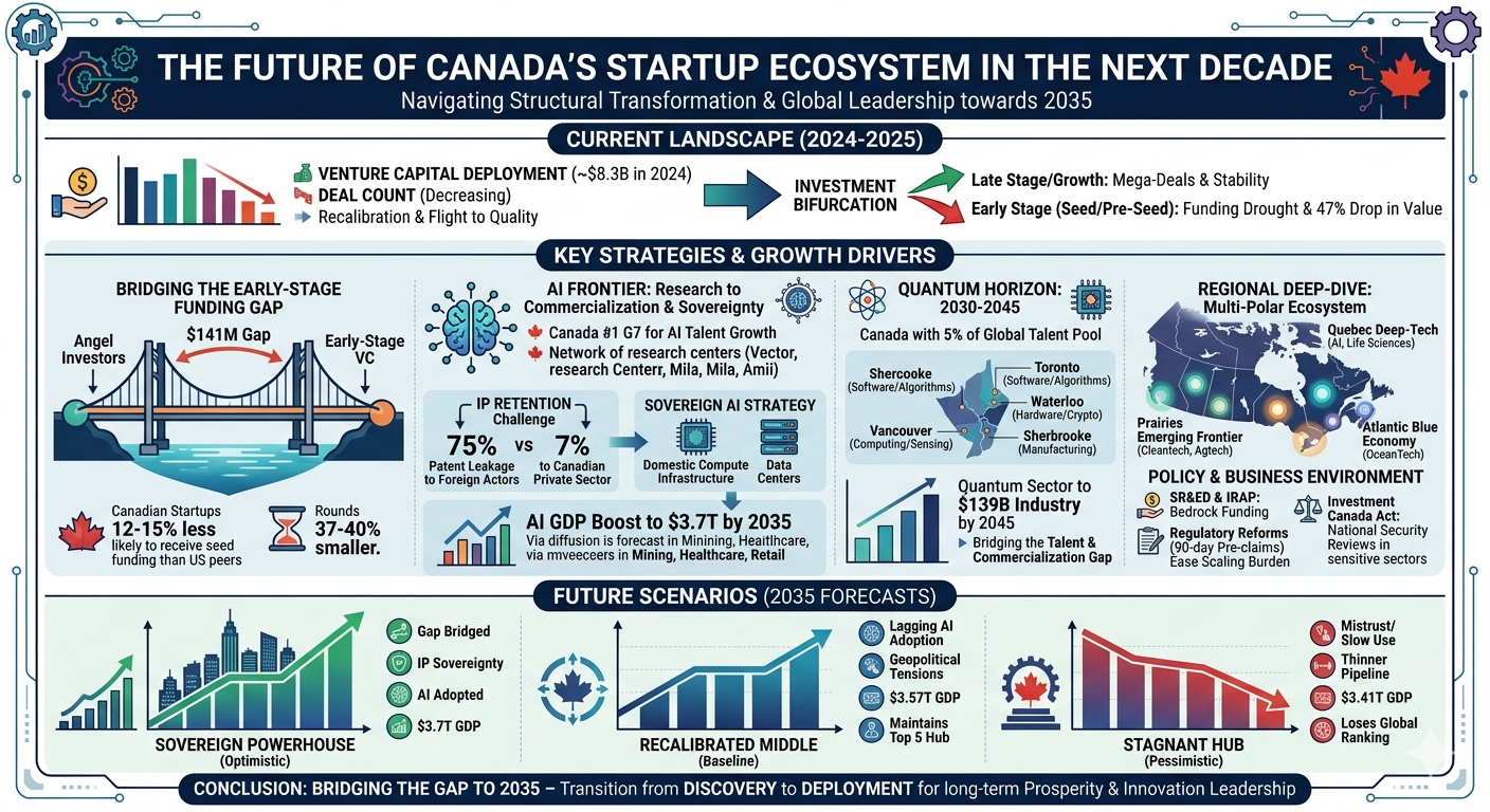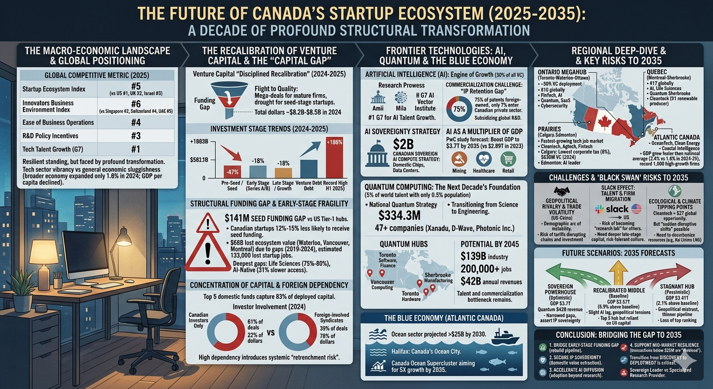 The Canadian startup ecosystem enters the mid-2020s positioned as a critical nexus of global innovation, yet it faces a decade of profound structural transformation. As of 2024 and 2025, Canada maintains a resilient global standing, consistently ranking as the fifth or sixth most attractive environment for technological entrepreneurship globally. This status is supported by a robust deployment of venture capital, which reached approximately $8.2 billion to $8.5 billion in 2024, despite a challenging macroeconomic backdrop defined by high interest rates and geopolitical instability. However, the aggregate success of the ecosystem masks a significant bifurcation between maturing scaleups and a struggling early-stage pipeline. The next ten years will be defined by Canada’s ability to bridge this "capital gap" while simultaneously asserting sovereignty over its world-leading research in artificial intelligence, quantum computing, and the blue economy.