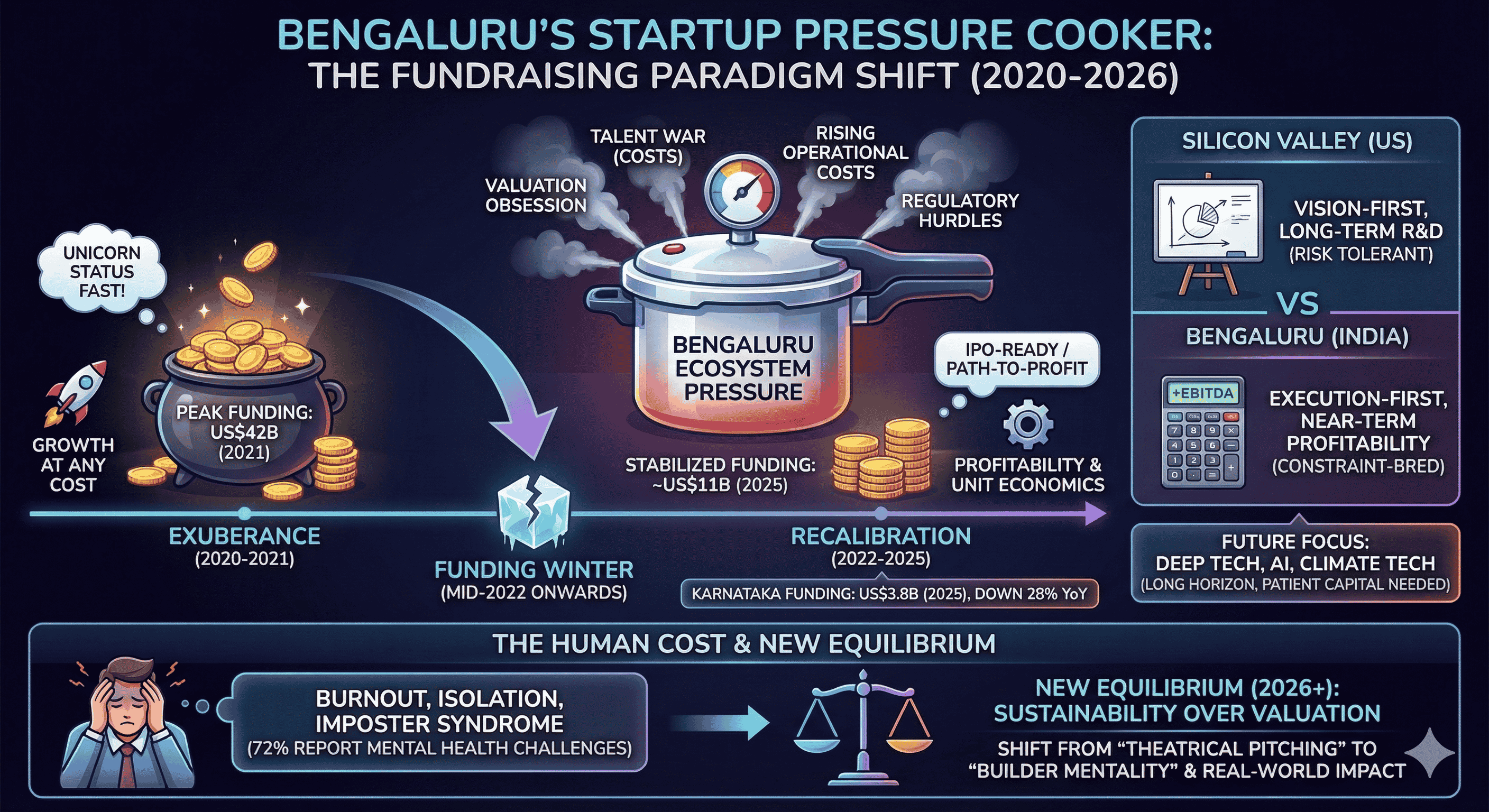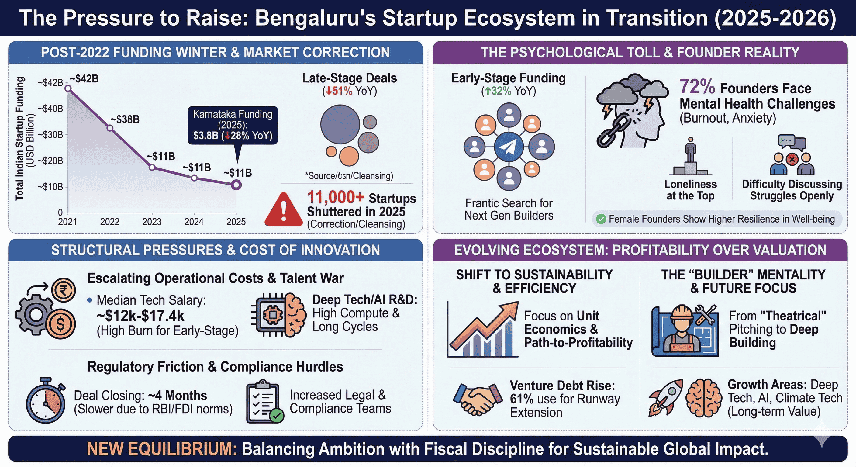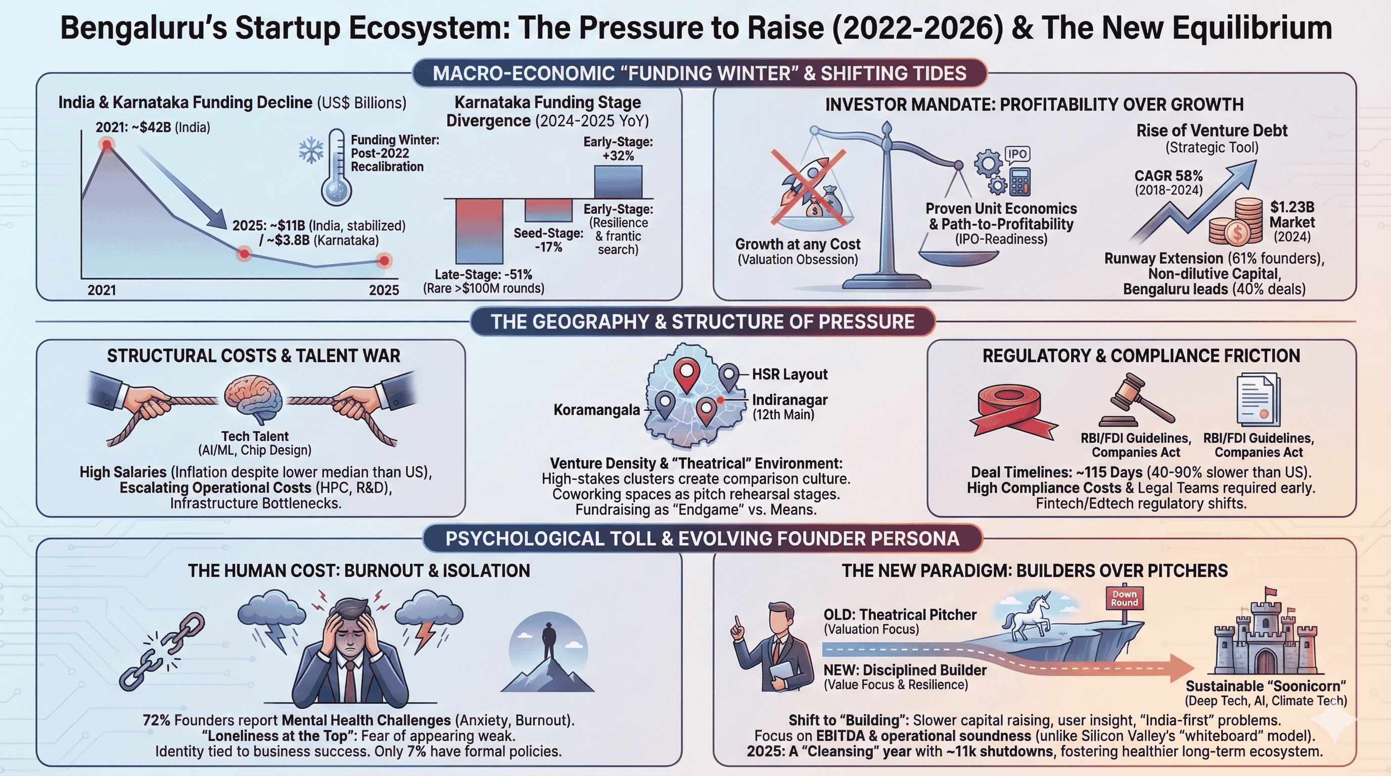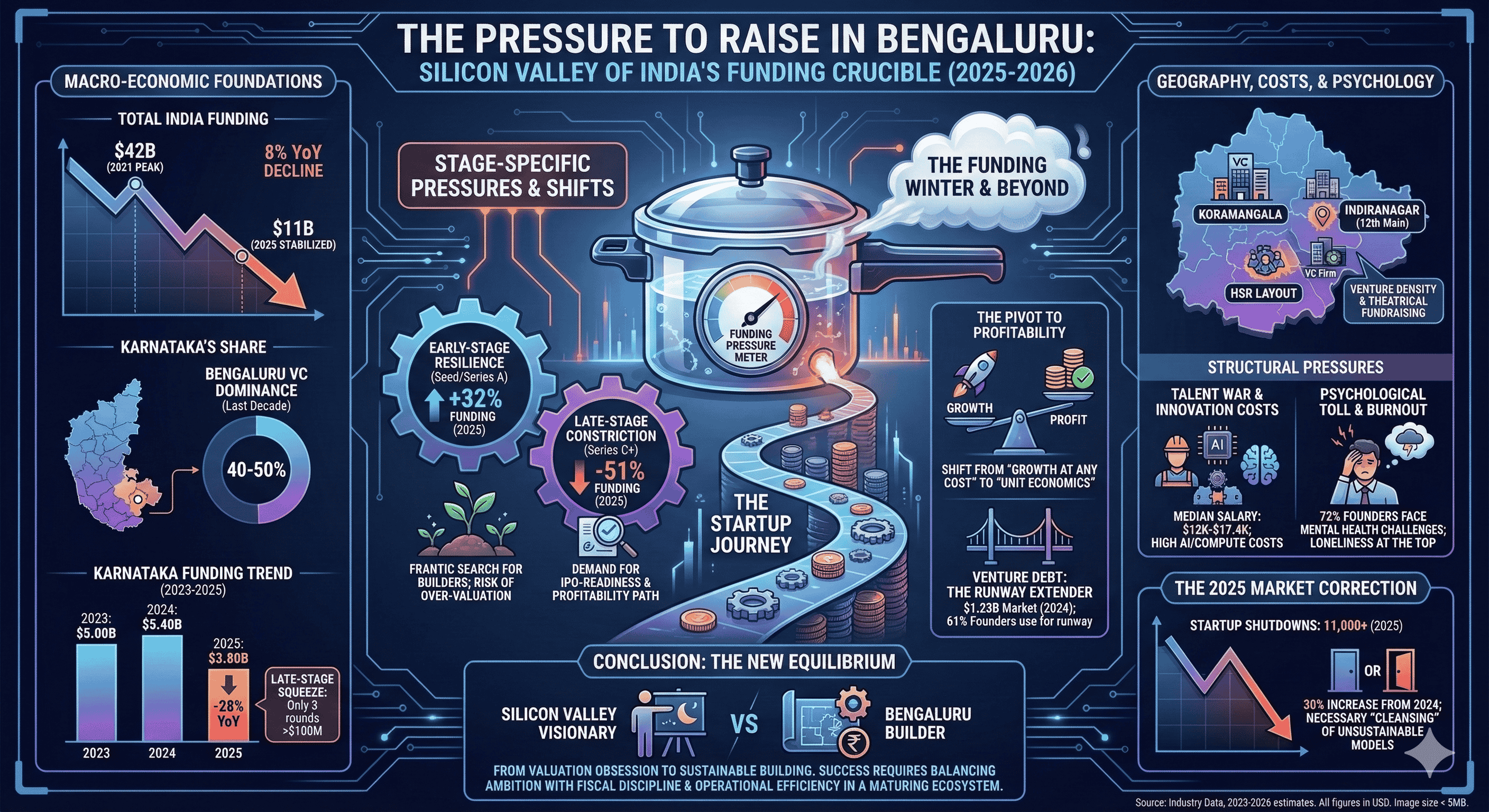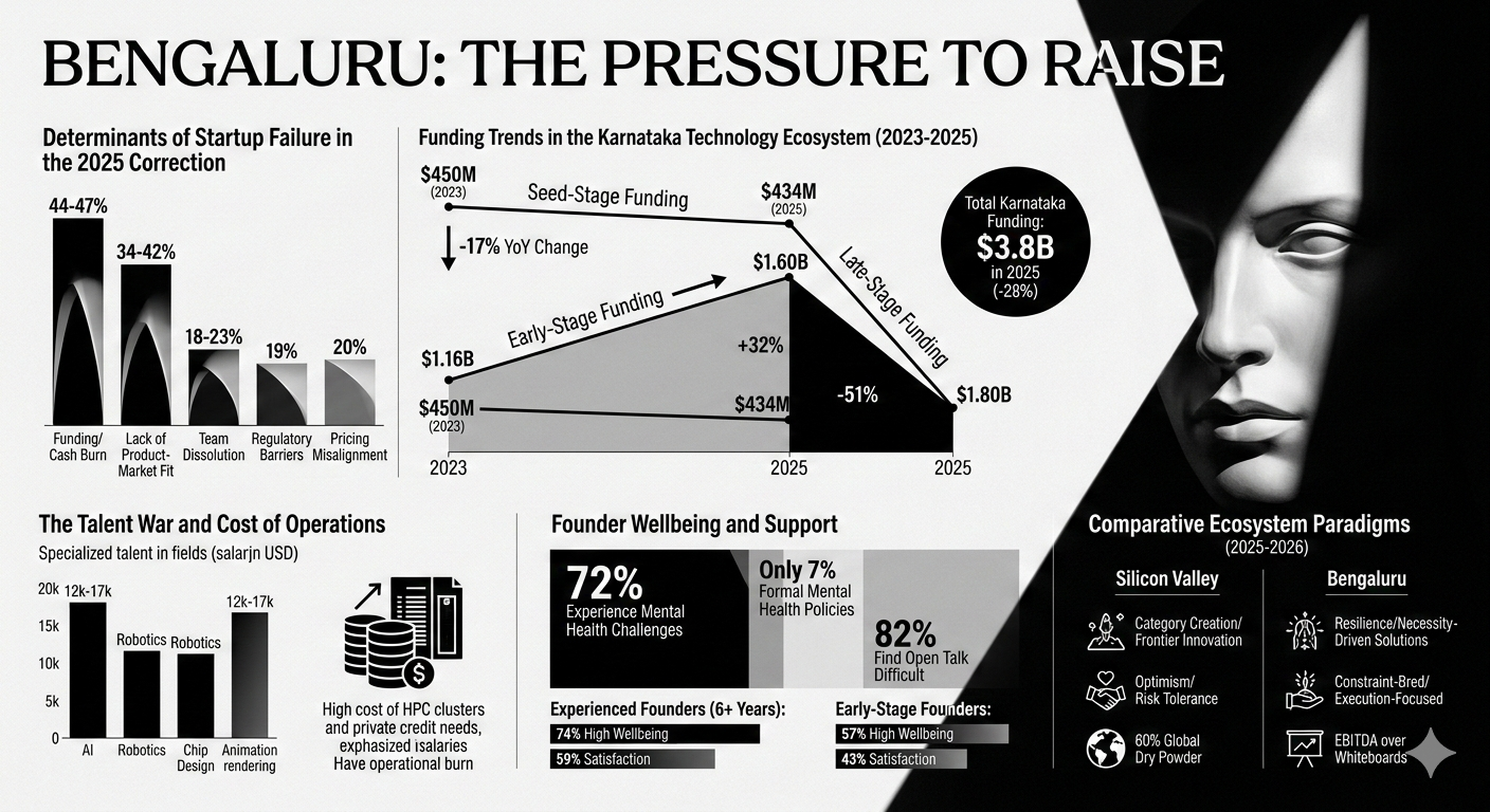 The Bengaluru ecosystem remains the heart of the Indian startup revolution, hosting 2,467 startups (23% of the national total) and attracting 40% of all startup funding in the first half of 2025. However, the successful founder of the 2026 era will likely be one who balances the ambition of a Silicon Valley visionary with the fiscal discipline of a "constraint-bred" builder. This involves navigating the psychological toll of the talent war, the structural costs of deep-tech innovation, and the regulatory complexities of the Indian market with a focus on long-term sustainability rather than short-term valuation. As the "funding winter" thaws into a more sober and mature spring, the pressure to raise will persist, but it will be increasingly tempered by a culture that values unit economics, operational efficiency, and real-world impact over the theater of the pitch deck.