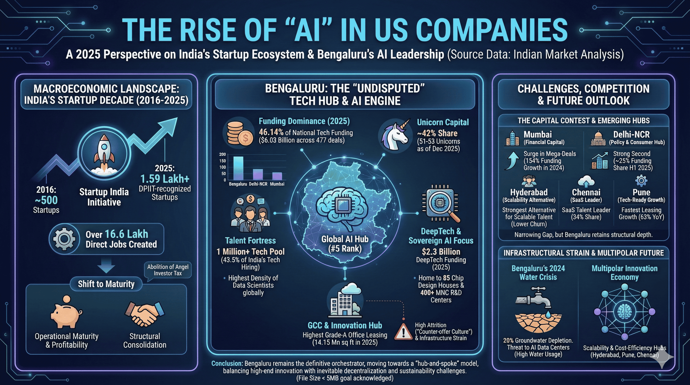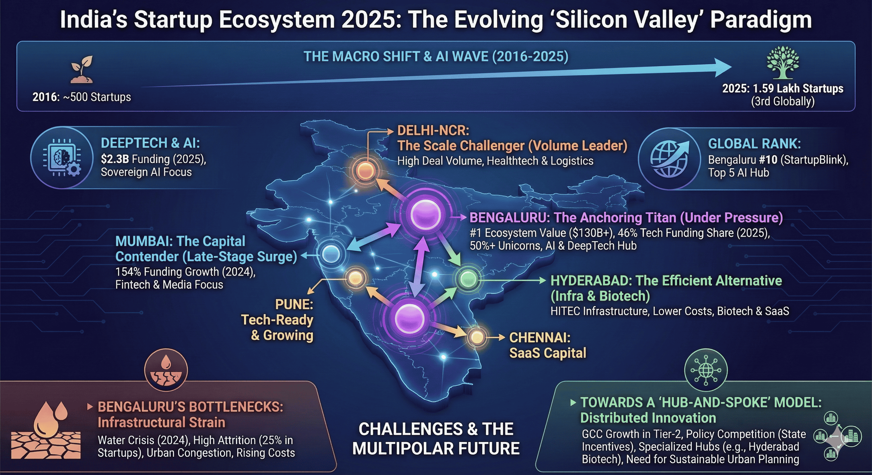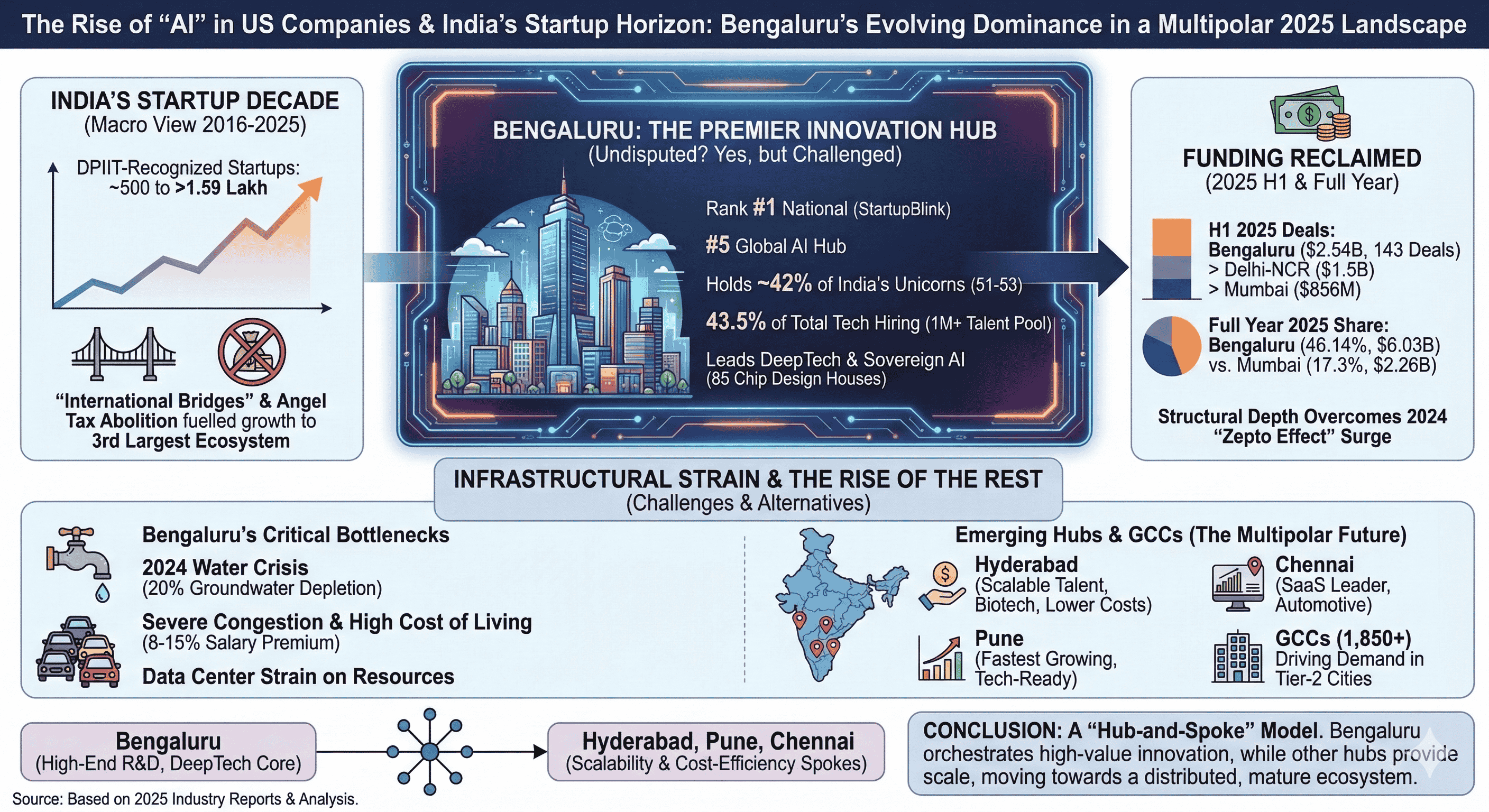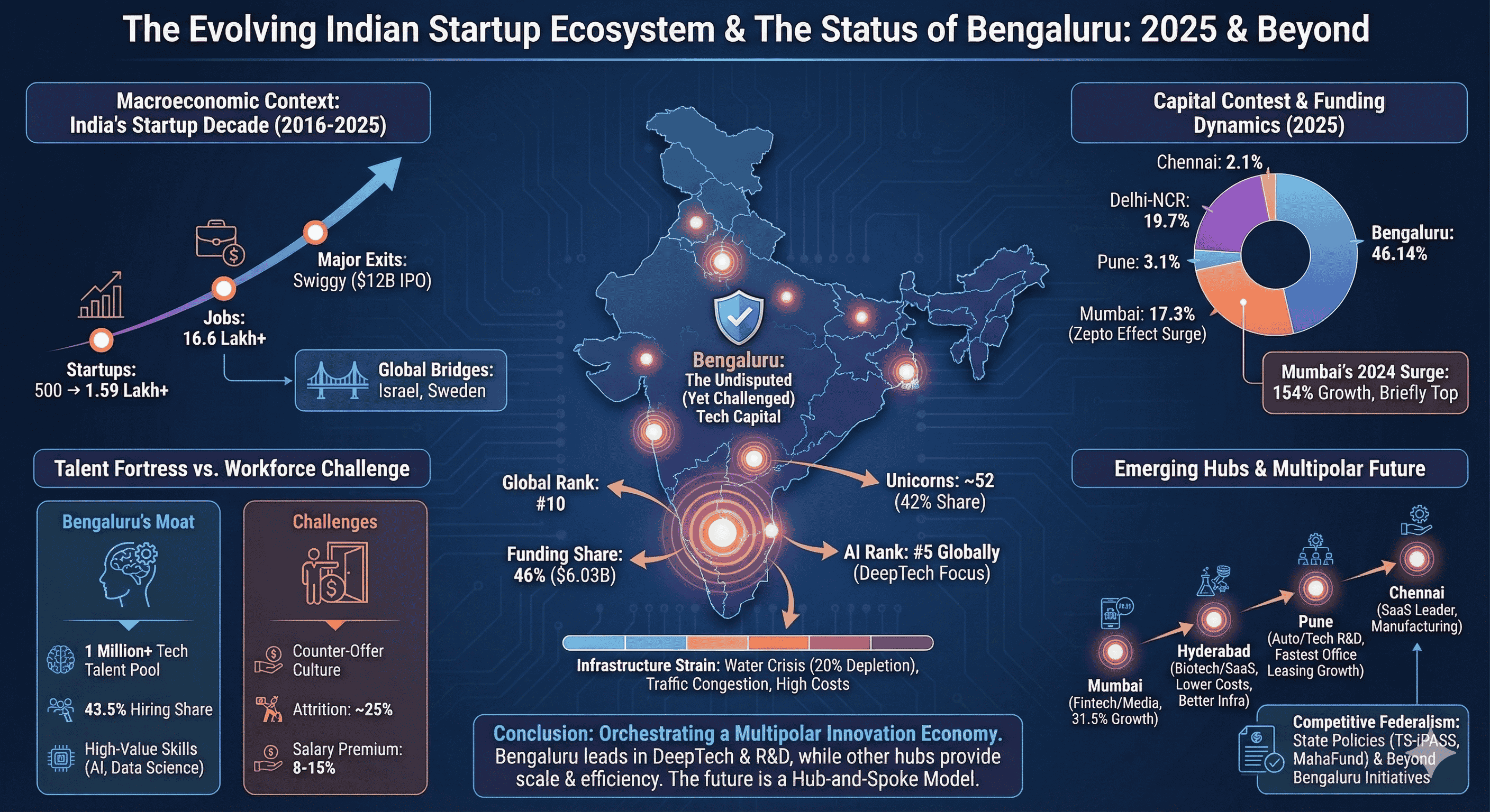 The future of India’s innovation economy is not a zero-sum game between cities, but a transition toward a "hub-and-spoke" model. Bengaluru will continue to serve as the high-end R&D and DeepTech hub, while Hyderabad, Pune, and Chennai provide the scalability and cost-efficiency required for global competitiveness. For Bengaluru to retain its crown, it must leverage its "tech-first" global perception to attract international capital while urgently addressing the hydrological and infrastructural limits that threaten its sustainability. The city is no longer just a place; it is a statement of India’s technological ambition, and its ability to adapt to the challenges of 2025 will define the trajectory of the nation’s "Startup Decade".