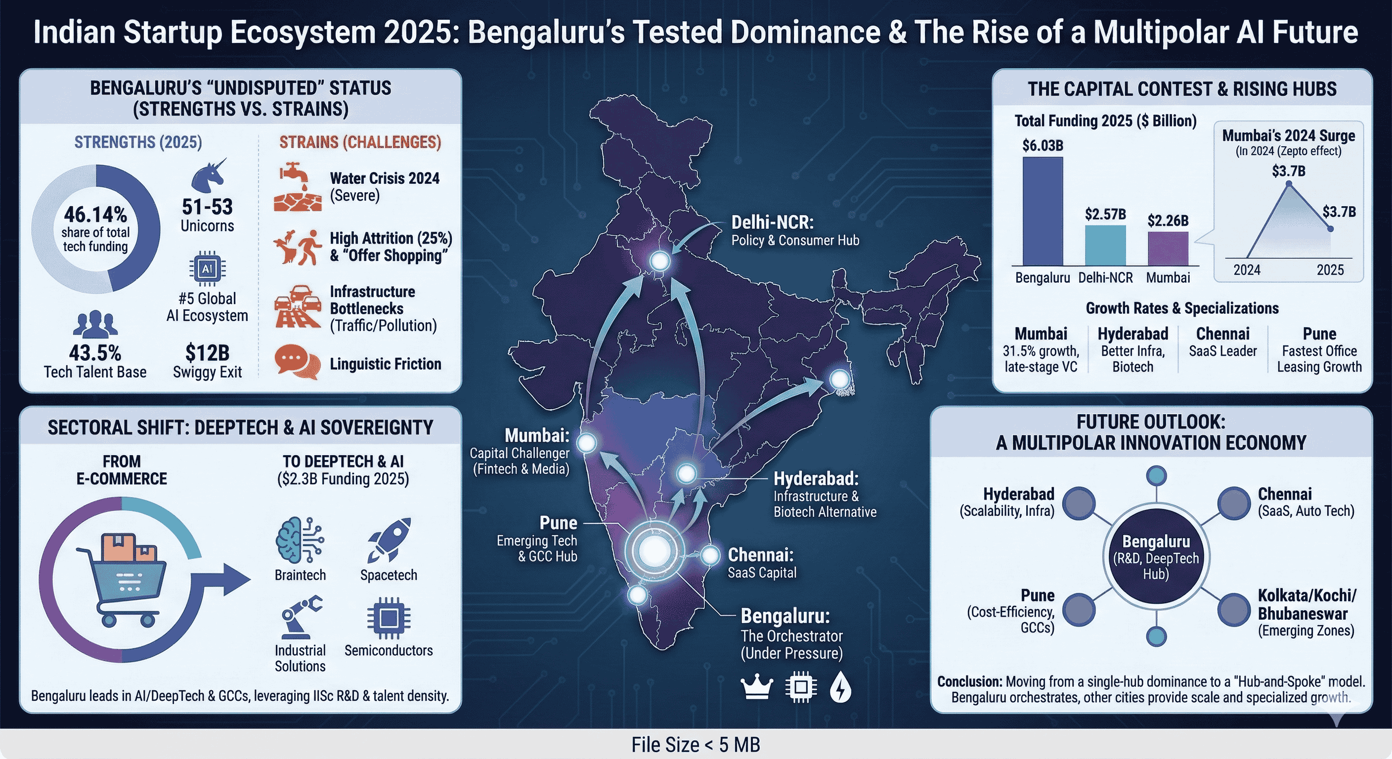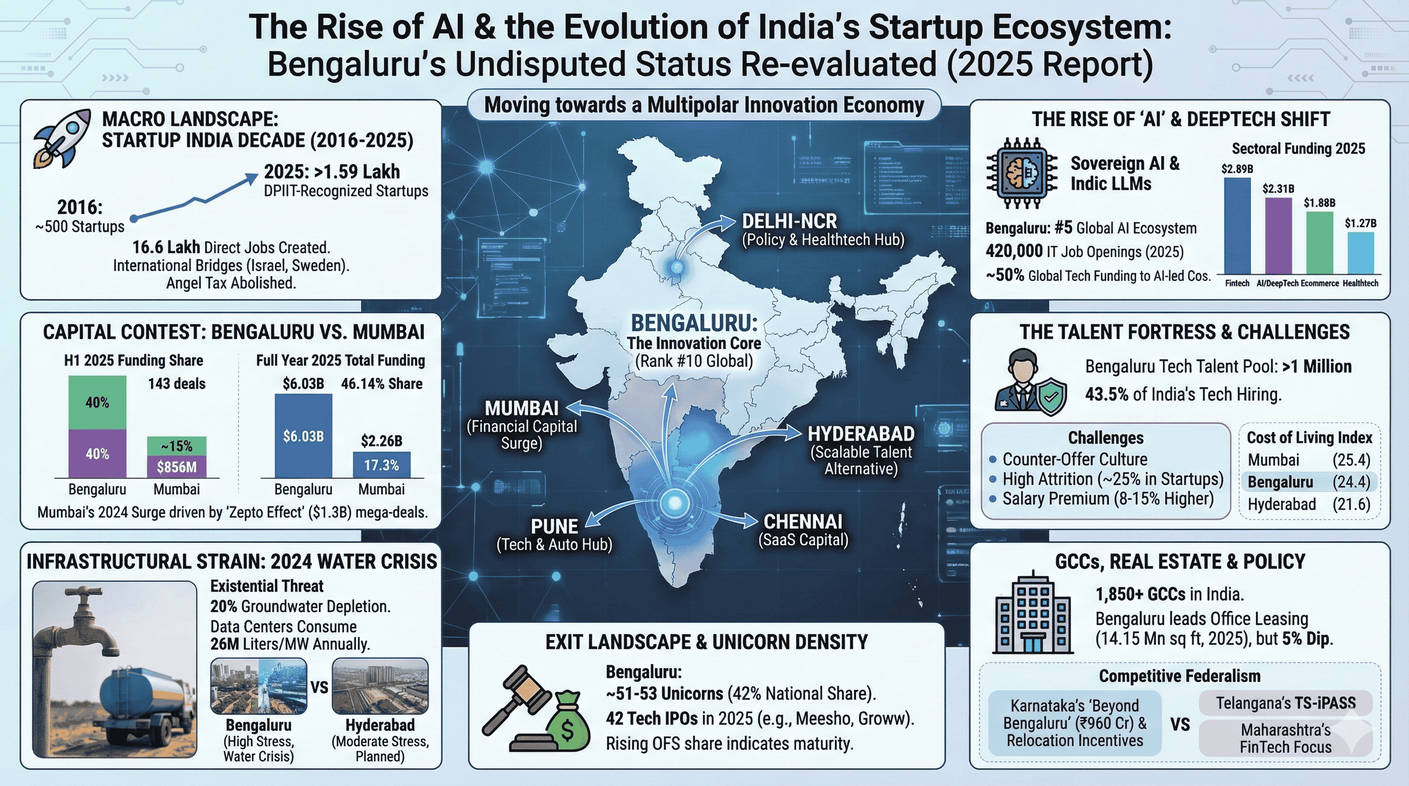 The evolution of the Indian startup ecosystem has reached a critical juncture in 2025, moving from a period of unbridled, capital-fueled expansion toward a disciplined era of operational maturity, profitability, and structural consolidation. Within this shifting paradigm, the status of Bengaluru as the nation’s preeminent technology hub—long termed the "Silicon Valley of India"—is undergoing a rigorous re-evaluation. While the city continues to command the largest share of venture capital, talent density, and unicorn creation, the rising competitive gravity of Mumbai, Delhi-NCR, and Hyderabad, coupled with severe infrastructural bottlenecks, has sparked a debate over whether its capital status remains "undisputed". As the ecosystem matures, the resilience of Bengaluru’s innovation moats is being tested by a combination of macroeconomic shifts, environmental stress, and the strategic decentralization policies of competing state governments.