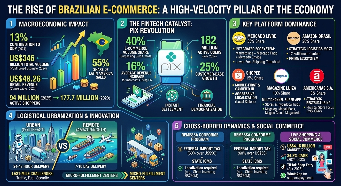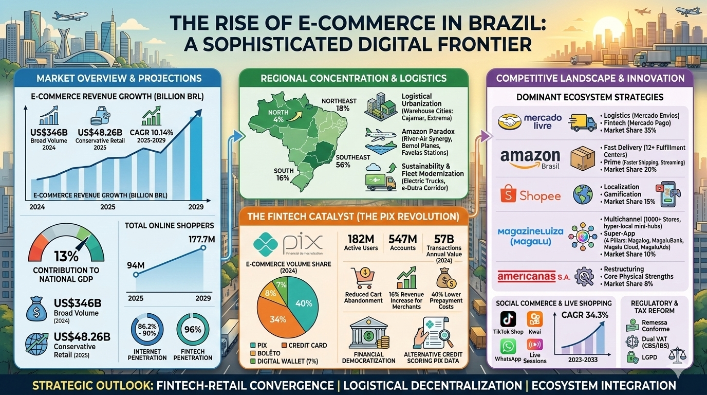 The Brazilian e-commerce sector has transitioned from a burgeoning digital frontier into a sophisticated, high-velocity pillar of the national economy, currently representing approximately 13% of the country’s total Gross Domestic Product (GDP). As the eighth-largest internet market globally, Brazil serves as the primary engine for digital commerce in Latin America, commanding a 55% share of the region’s total e-commerce sales and boasting over 150 million active users. The trajectory of this sector is defined by a rapid acceleration initiated during the 2020 global health crisis, followed by a period of structural consolidation characterized by the integration of financial technology, the urbanization of logistics, and a tectonic shift in consumer behavior toward mobile-first and social-driven shopping experiences.