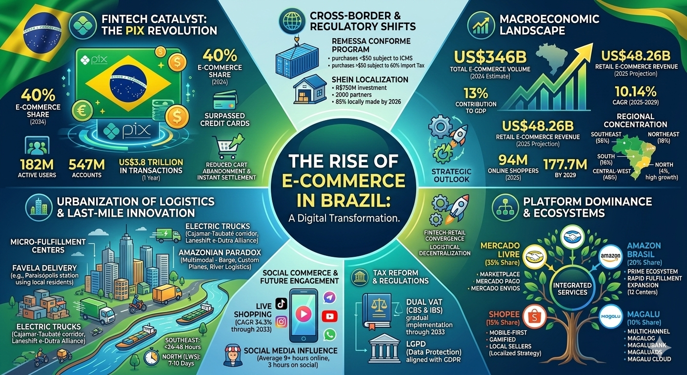 In conclusion, Brazil's e-commerce market has reached a state of maturity that makes it a global leader in digital innovation. While logistical and regulatory challenges remain, the combination of high internet penetration, a revolutionary payment system, and a consumer base that is increasingly comfortable with digital-first life ensures that Brazil will remain the dominant force in Latin American e-commerce for the next decade. The successful e-commerce platform of 2030 will be a hybrid: a logistics company, a bank, and a social media network all rolled into one.
