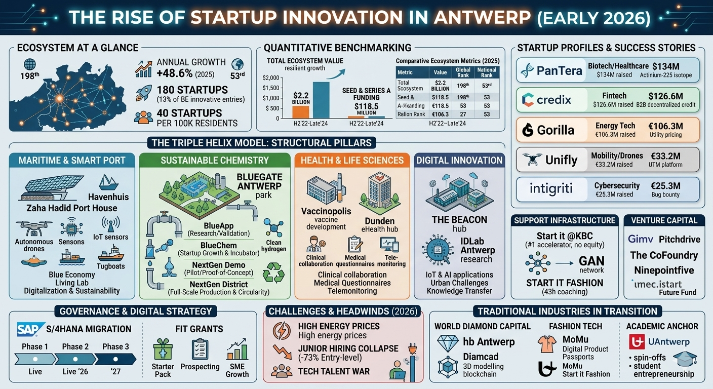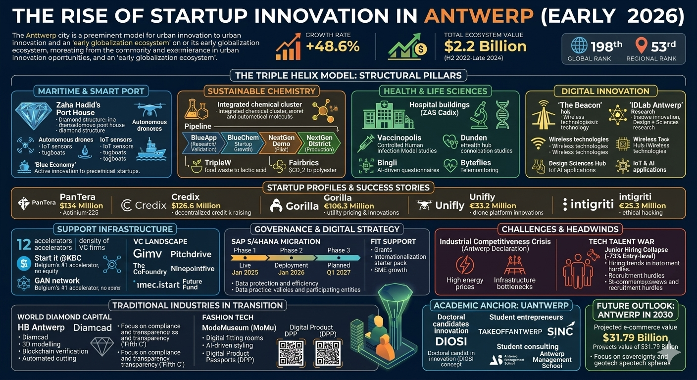 The structural transformation of Antwerp’s economy during the mid-2020s has positioned the city as a preeminent model for European urban innovation. By effectively bridging its historical industrial dominance in maritime logistics and sustainable chemistry with high-growth digital ventures, Antwerp has evolved into an "early globalization ecosystem". As of early 2026, the city serves as a critical node in the Western European innovation corridor, demonstrating a robust annual growth rate of 48.6% in 2025. This expansion is not merely quantitative; it represents a qualitative shift in how traditional industries—ranging from the centuries-old diamond trade to the capital-intensive petrochemical sector—interact with emerging technologies like artificial intelligence, the Internet of Things (IoT), and biotechnology.