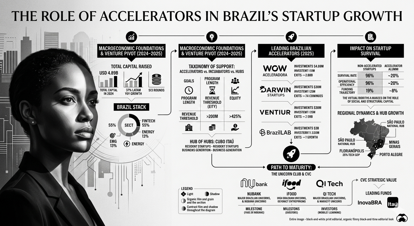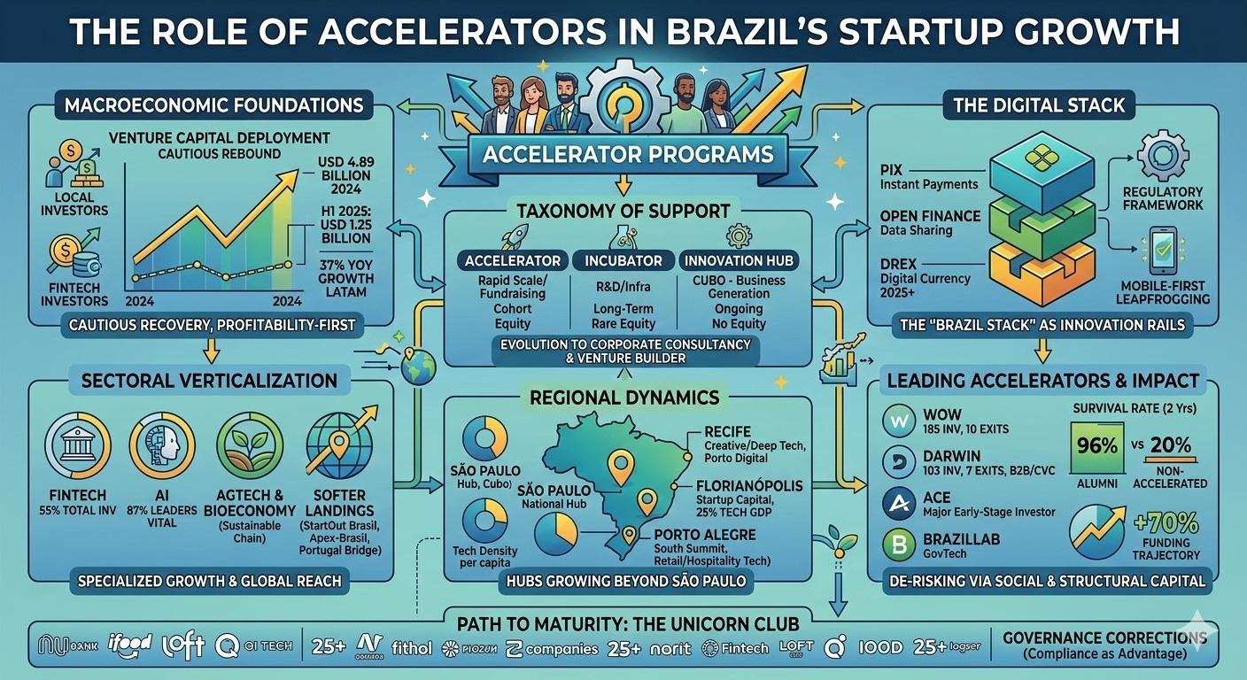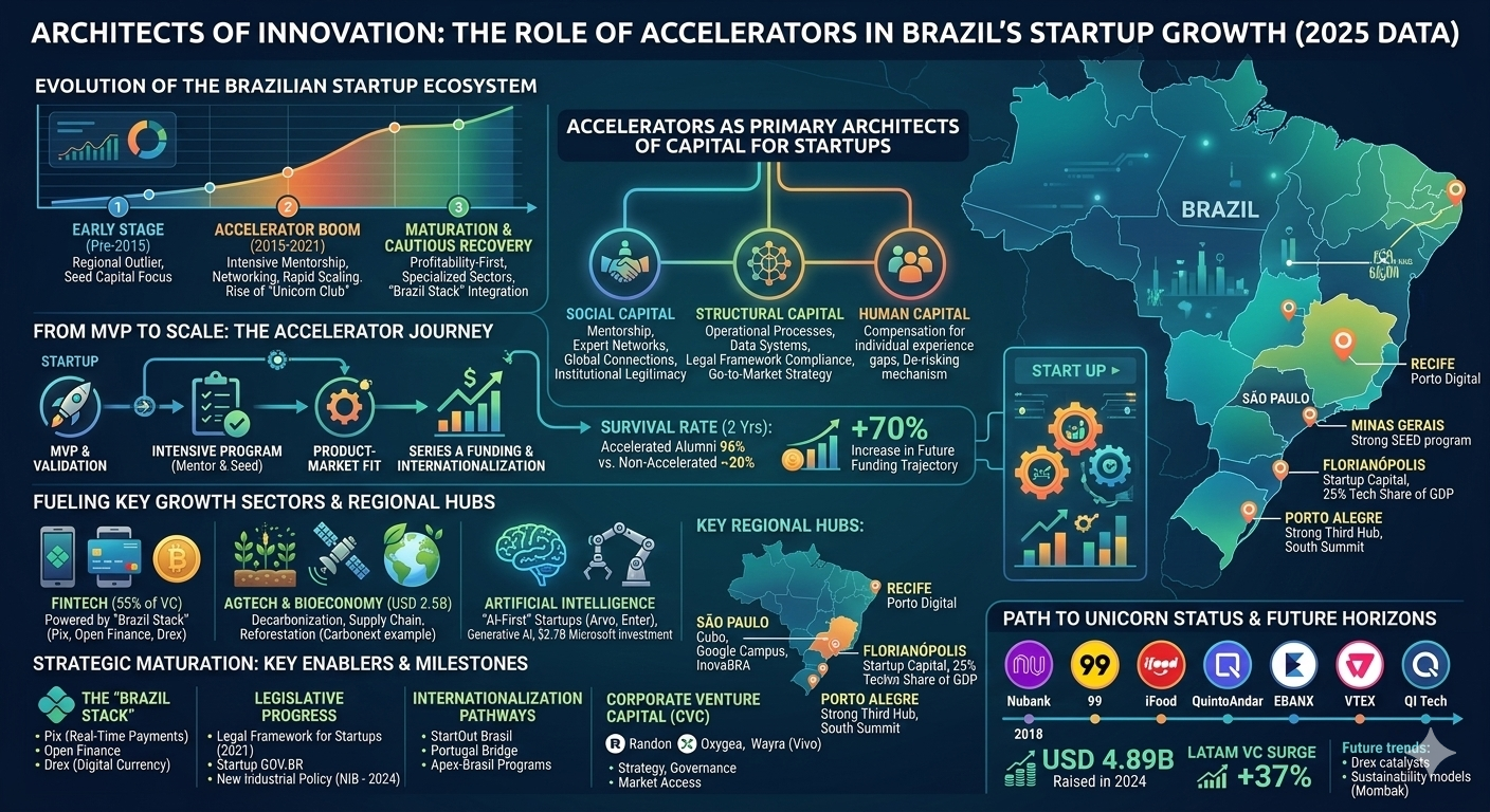 The transformation of the Brazilian startup ecosystem from a regional outlier to a global innovation powerhouse represents one of the most significant shifts in the modern venture capital landscape. As of 2025, Brazil stands as the undisputed leader in Latin American technology ventures, characterized by an increasingly sophisticated infrastructure known as the "Brazil Stack," a maturing regulatory framework, and a resilient recovery following the global post-pandemic market correction. Central to this evolution is the role of accelerators—institutional entities that have moved beyond simple seed capital provision to become the primary architects of structural, social, and structural capital for nascent enterprises. This report analyzes the multifaceted impact of these programs on the growth, survival, and internationalization of Brazilian startups, set against the backdrop of a recovering venture capital market that raised USD 4.89 billion in 2024 alone.