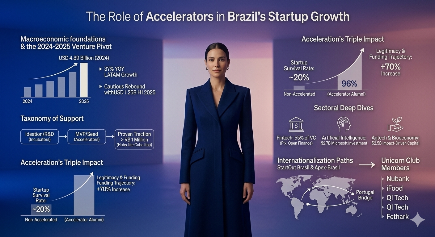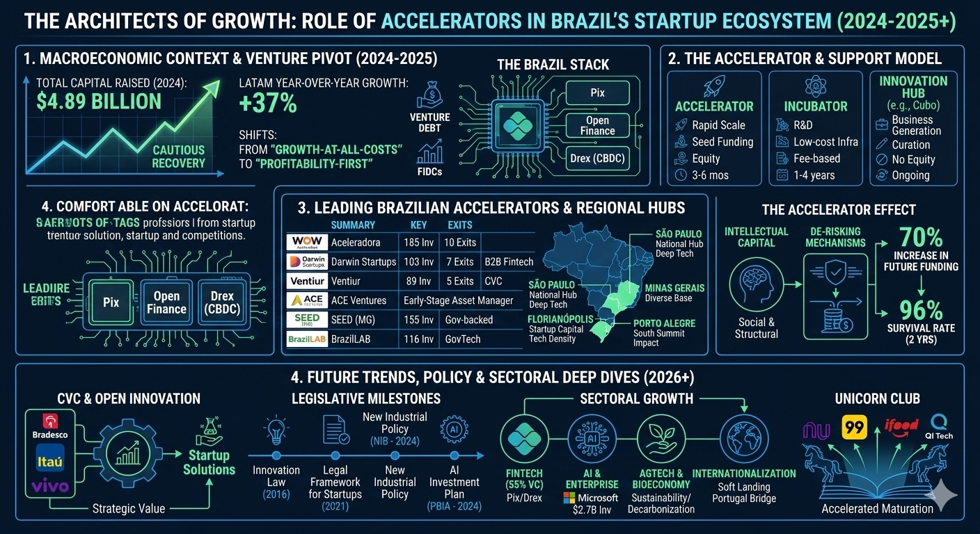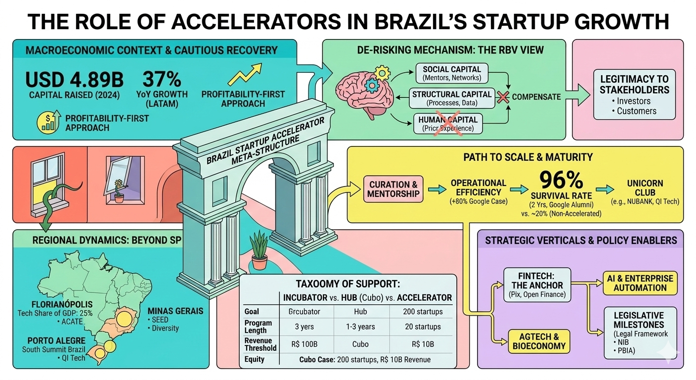 The transformation of the Brazilian startup ecosystem from a regional outlier to a global innovation powerhouse represents one of the most significant shifts in the modern venture capital landscape. As of 2025, Brazil stands as the undisputed leader in Latin American technology ventures, characterized by an increasingly sophisticated infrastructure known as the "Brazil Stack," a maturing regulatory framework, and a resilient recovery following the global post-pandemic market correction. Central to this evolution is the role of accelerators—institutional entities that have moved beyond simple seed capital provision to become the primary architects of structural, social, and structural capital for nascent enterprises. This report analyzes the multifaceted impact of these programs on the growth, survival, and internationalization of Brazilian startups, set against the backdrop of a recovering venture capital market that raised USD 4.89 billion in 2024 alone.