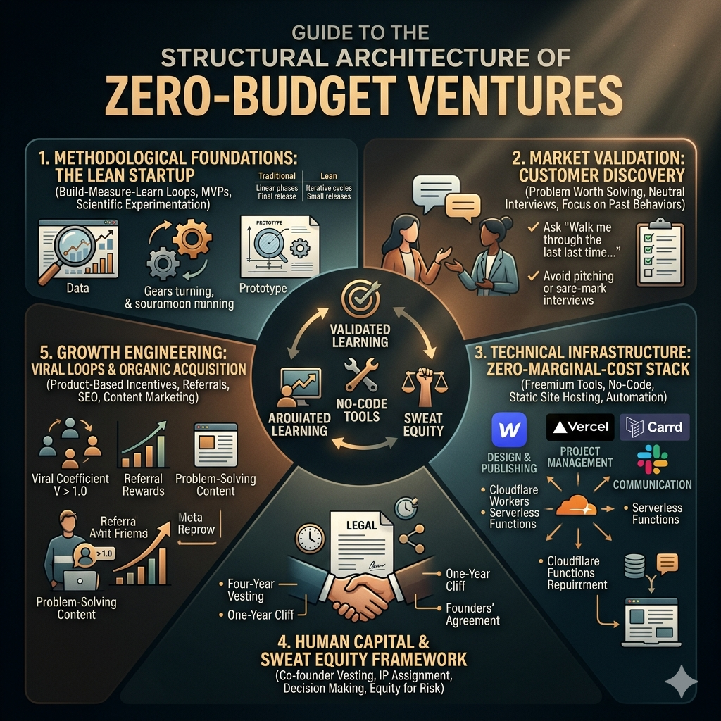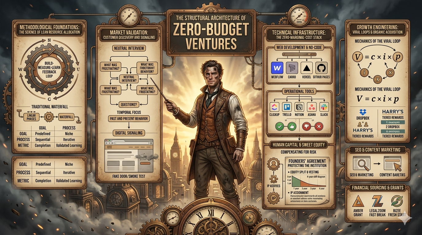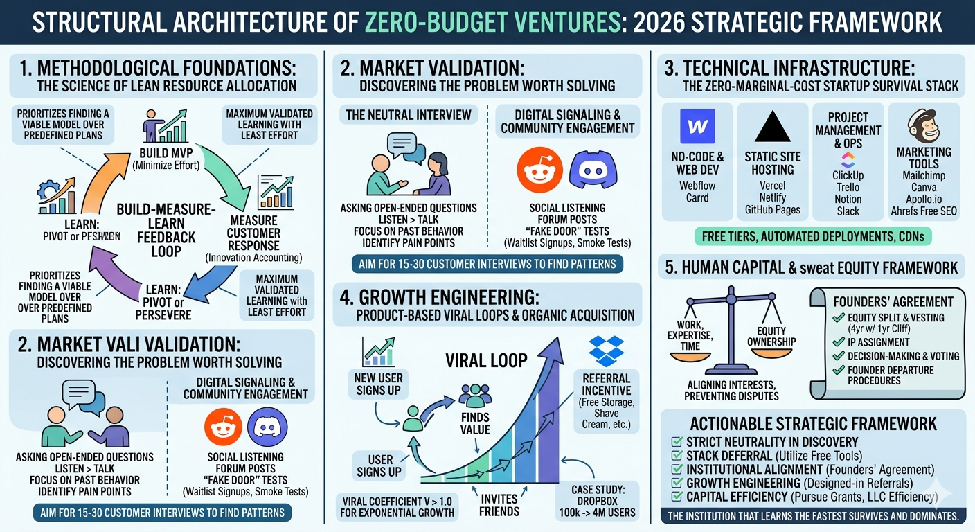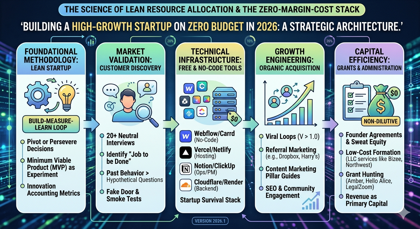 Building a startup with zero budget in 2026 is a discipline of radical efficiency and behavioral evidence. The transition from a "garage underdog" to a scalable enterprise is structured around the continuous reduction of waste and the acceleration of the feedback loop.