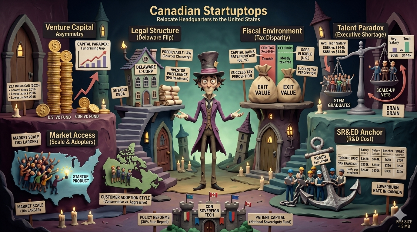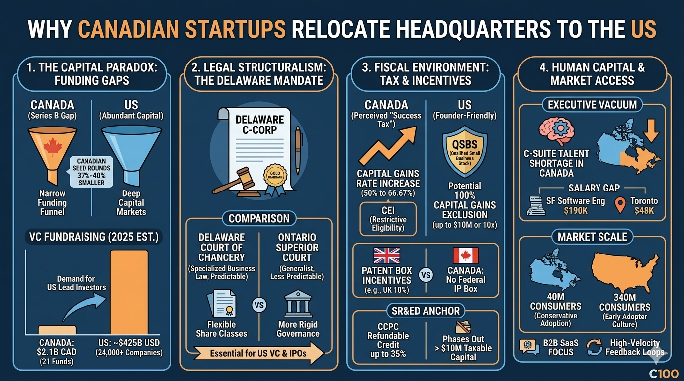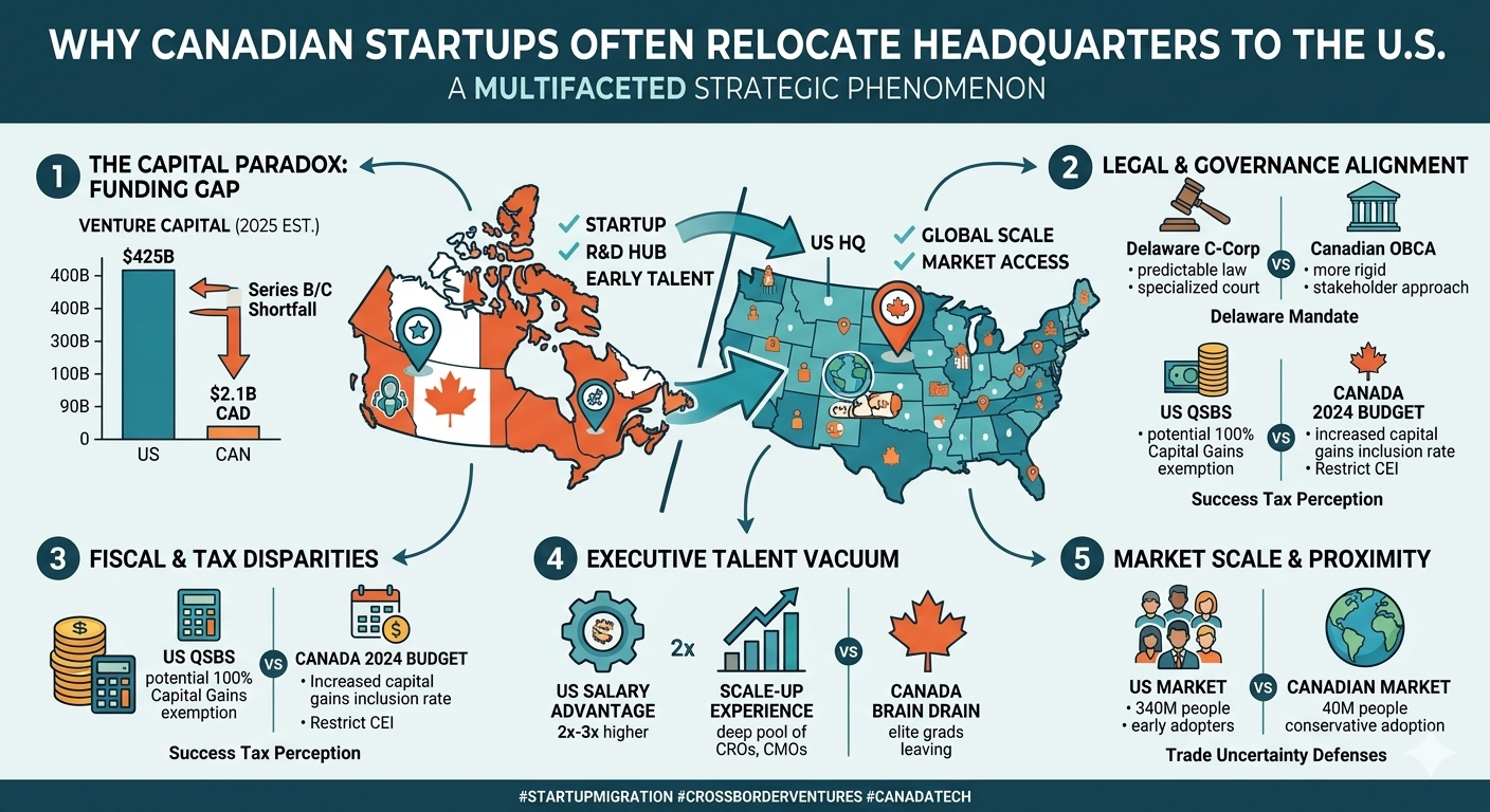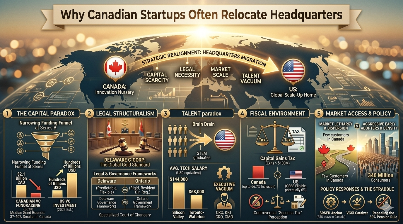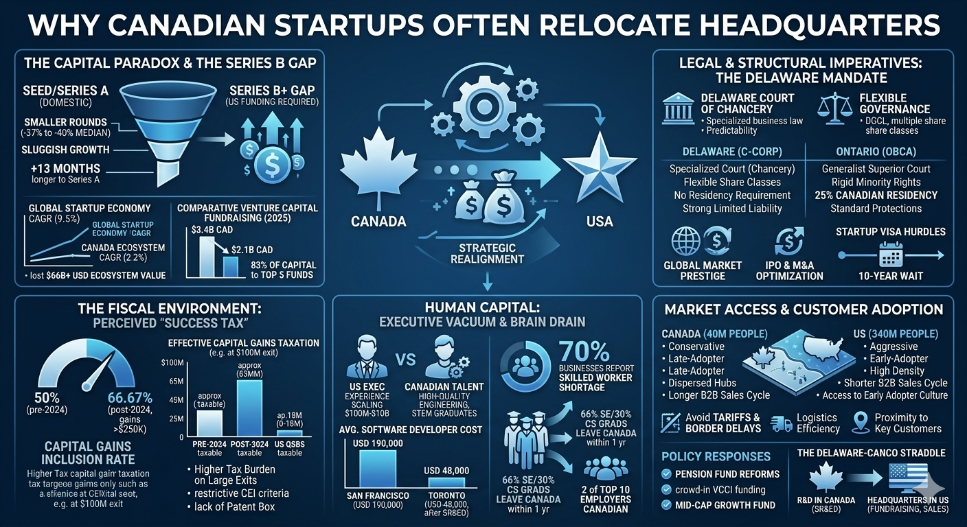 The relocation of Canadian startup headquarters to the United States is the result of a rational calculation by founders and investors seeking to maximize growth and minimize jurisdictional risk. The "pull" of the U.S. capital markets, legal predictability in Delaware, and the sheer scale of the customer base remain the dominant forces in North American innovation. For many ventures, the "Delaware-CanCo Straddle" provides a temporary equilibrium, allowing them to leverage the cost advantages of Canadian R&D while participating in the global financial stage of the United States.