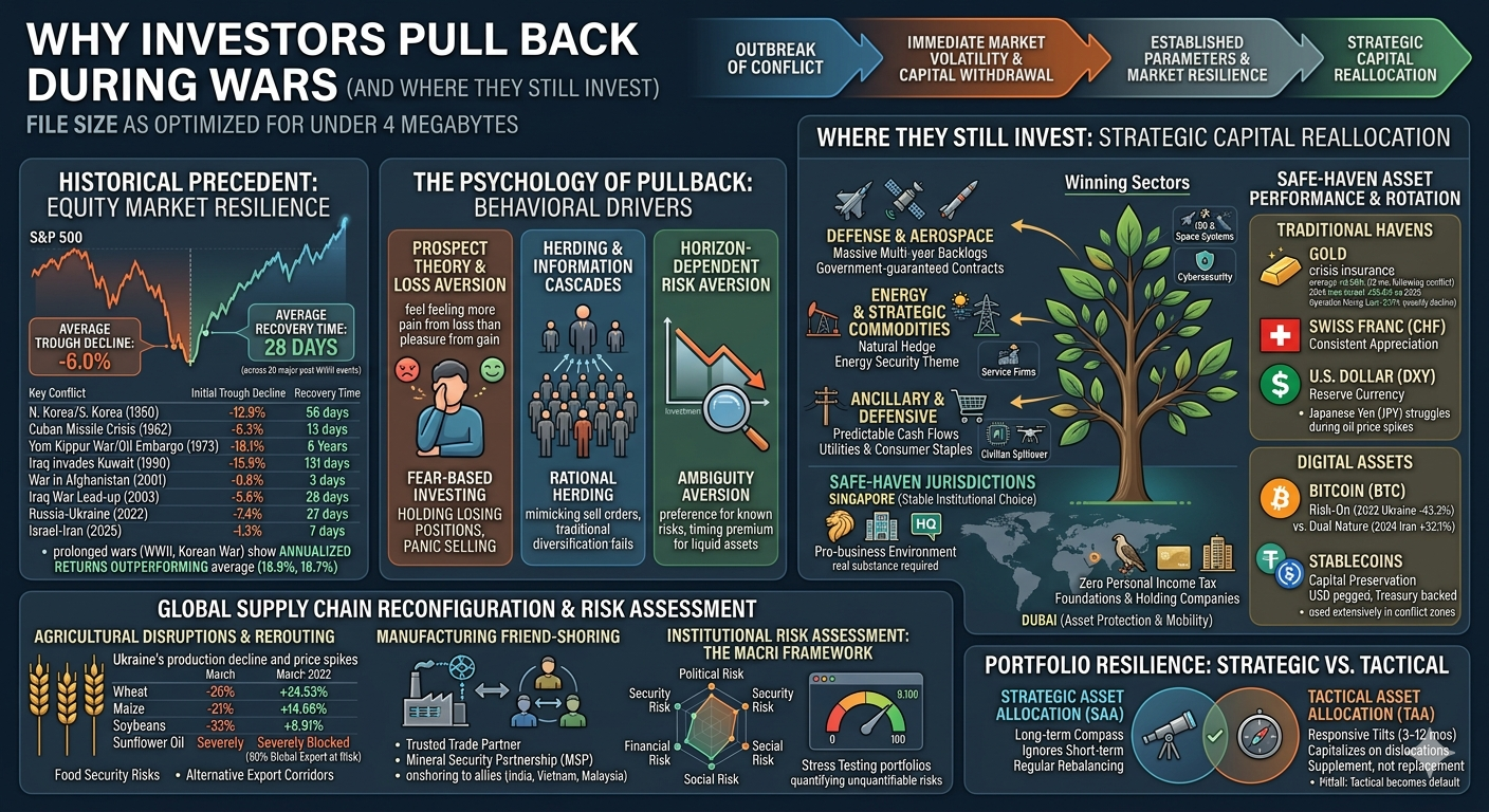 The historical and behavioral evidence synthesized in this report reveals that the "wartime pullback" is a predictable cycle of uncertainty-driven volatility followed by risk-based recovery. While the initial reaction of capital is flight, it is not a flight away from all investment, but a strategic reallocation toward certainty, scarcity, and safety.