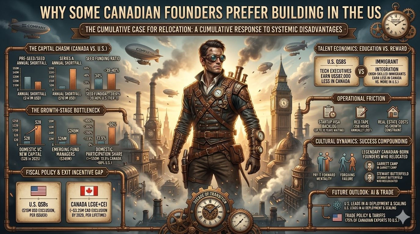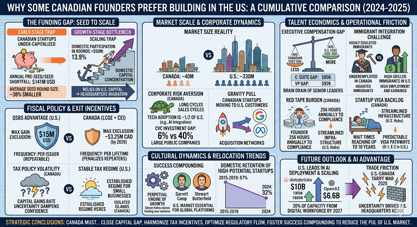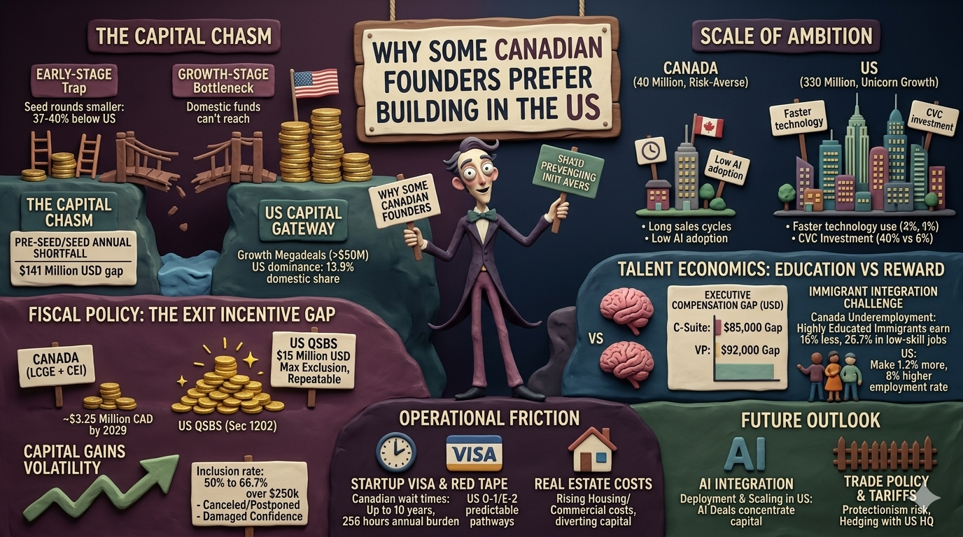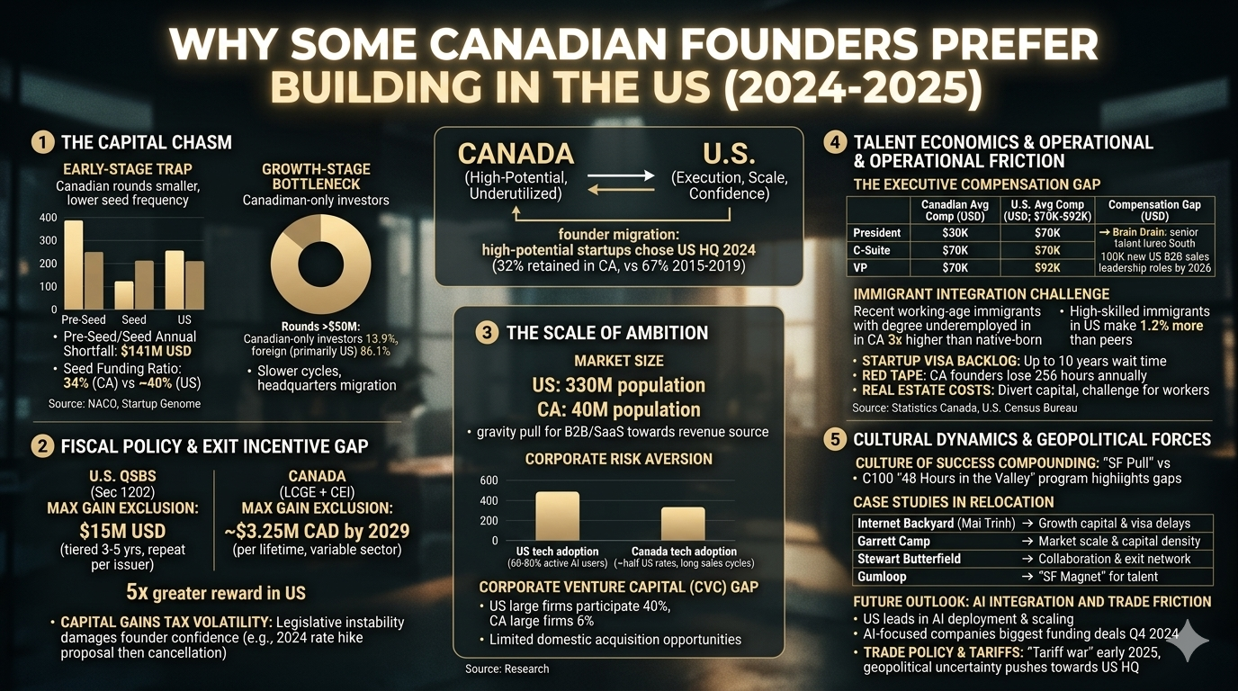 The preference among Canadian founders for building in the United States is a rational response to a cumulative set of structural disadvantages in the domestic market. The "Brain Drain" is not a failure of Canadian ingenuity but a failure of the Canadian "railway system" to support the transition from early-stage success to long-term scale.