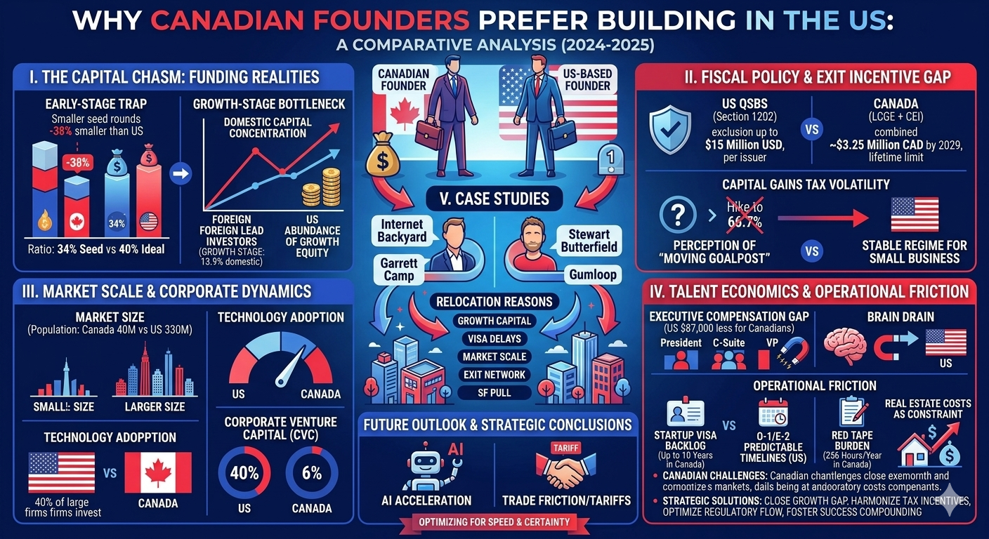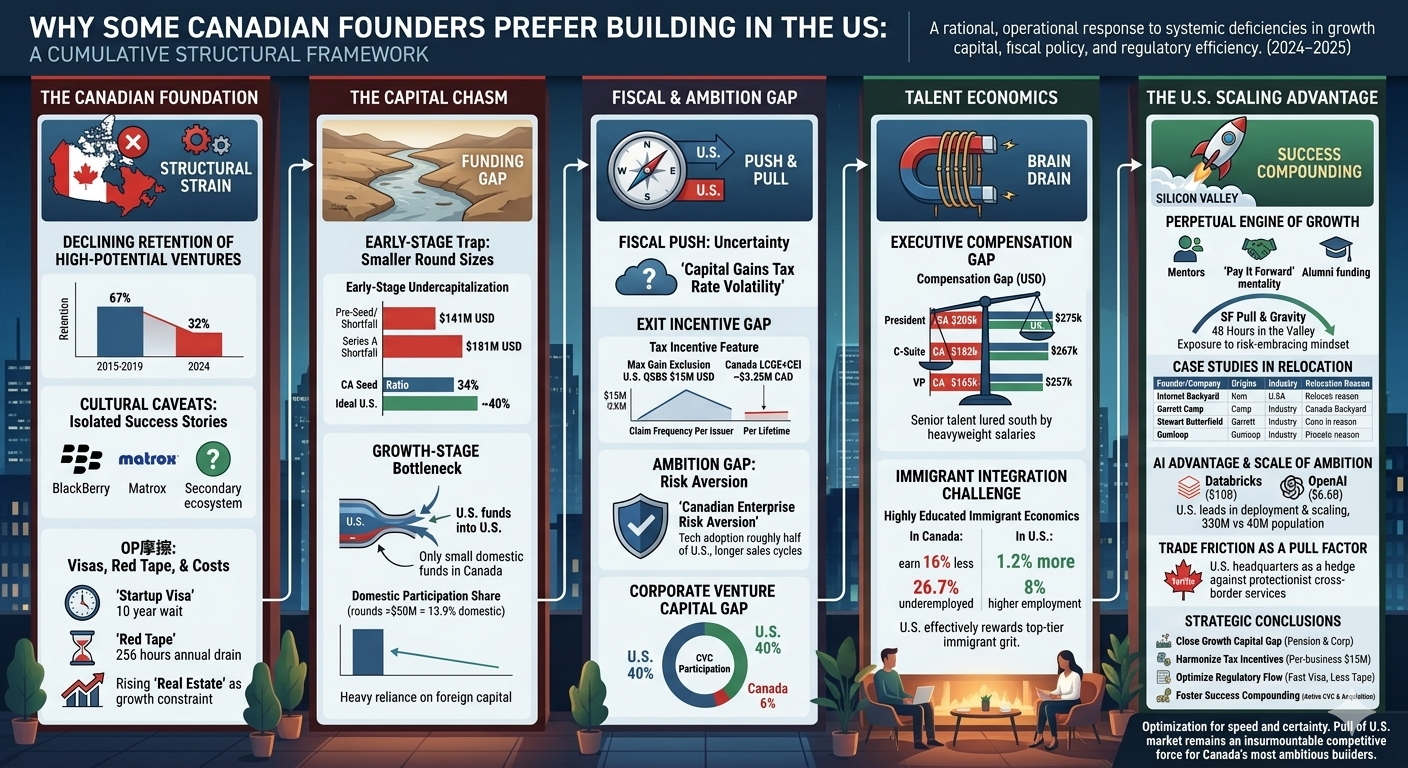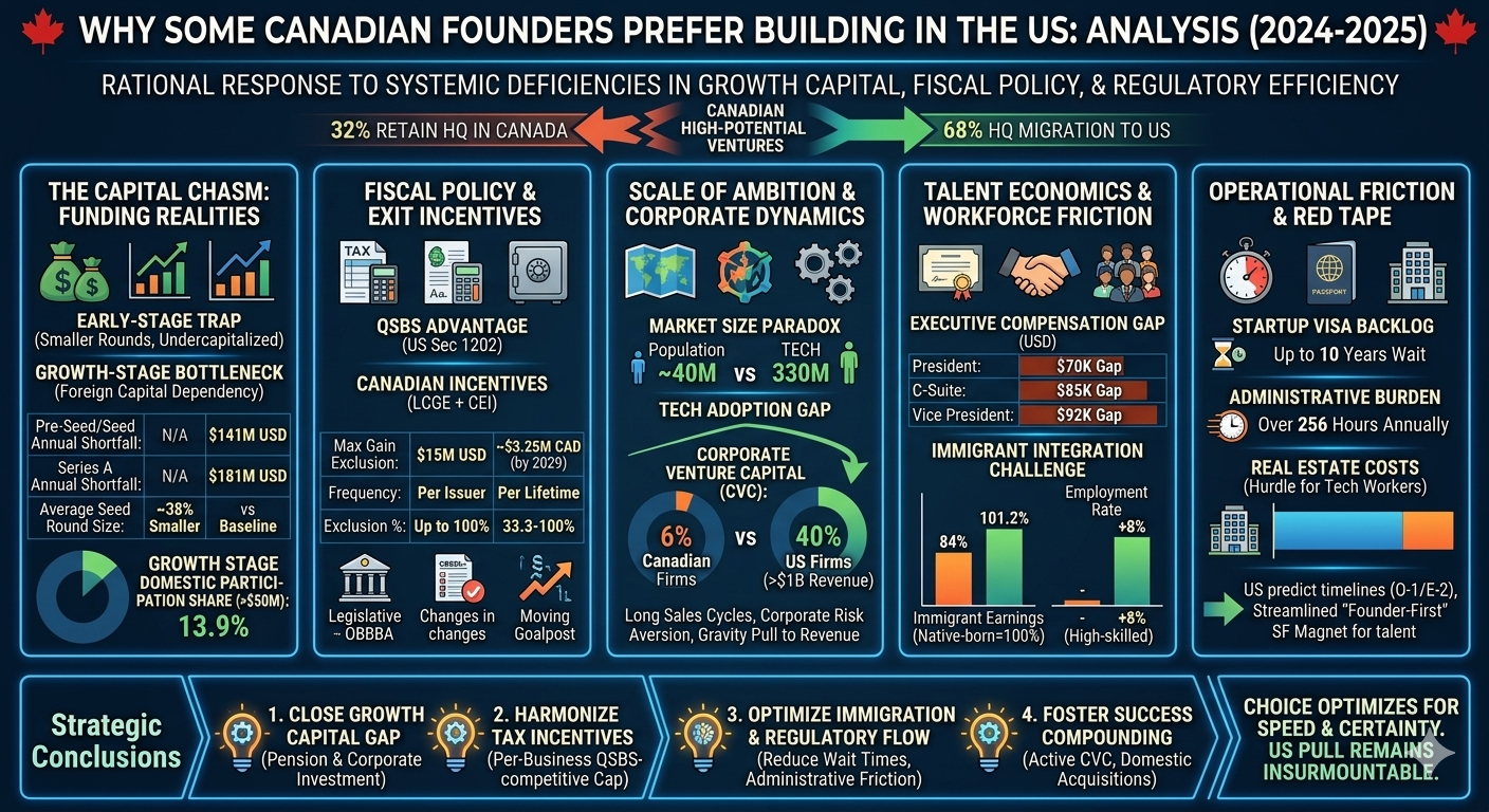The preference among Canadian founders for building in the United States is a rational response to a cumulative set of structural disadvantages in the domestic market. The "Brain Drain" is not a failure of Canadian ingenuity but a failure of the Canadian "railway system" to support the transition from early-stage success to long-term scale.